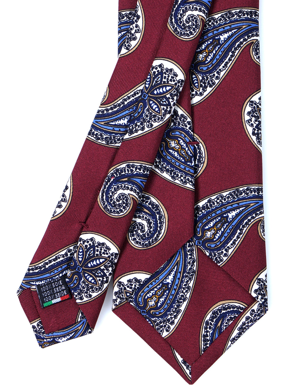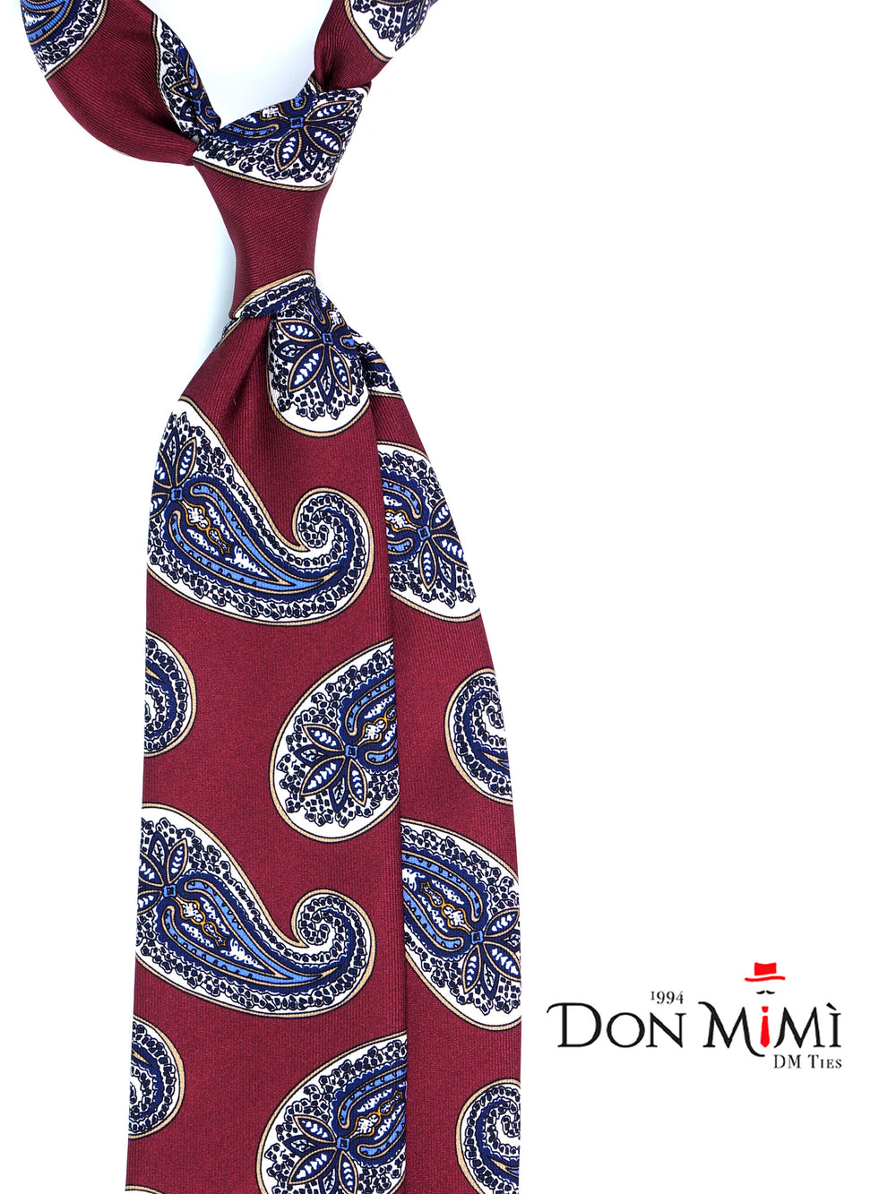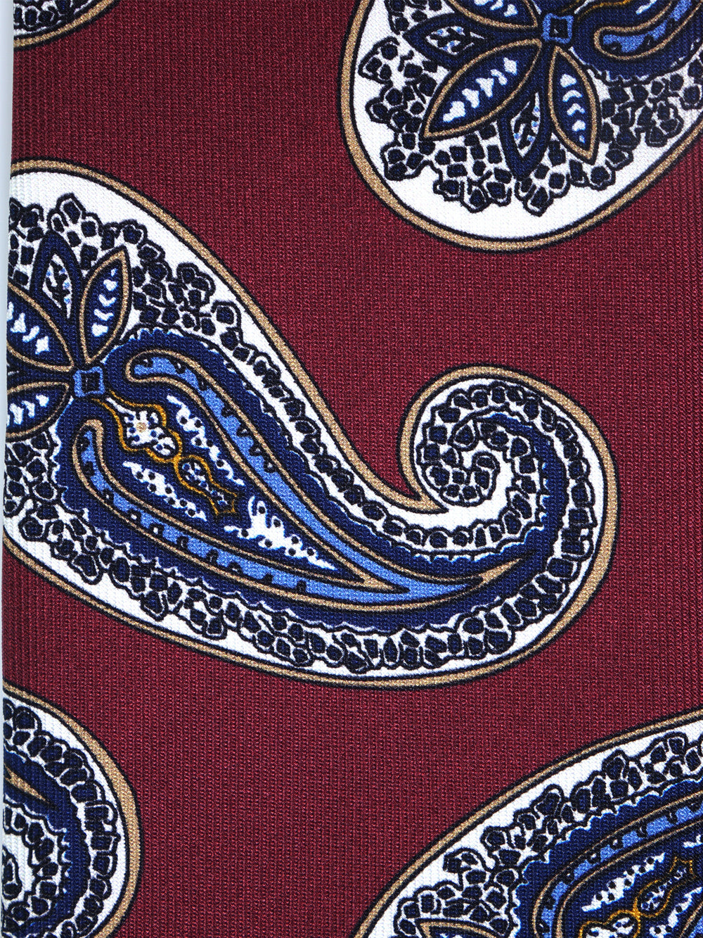 Questa non è una cravatta, è una dichiarazione di stile. Pezzo forte della collezione Autunno/Inverno, celebra uno dei disegni più iconici del guardaroba maschile, il Paisley, qui interpretato in una versione maxi di grande impatto. Su un fondo bordeaux profondo e regale, esplode una ricca palette di blu e ocra. Realizzata in pregiata seta inglese, questa cravatta è pensata per l'uomo che ama gli accessori protagonisti, capaci di raccontare una storia di cultura e di gusto.