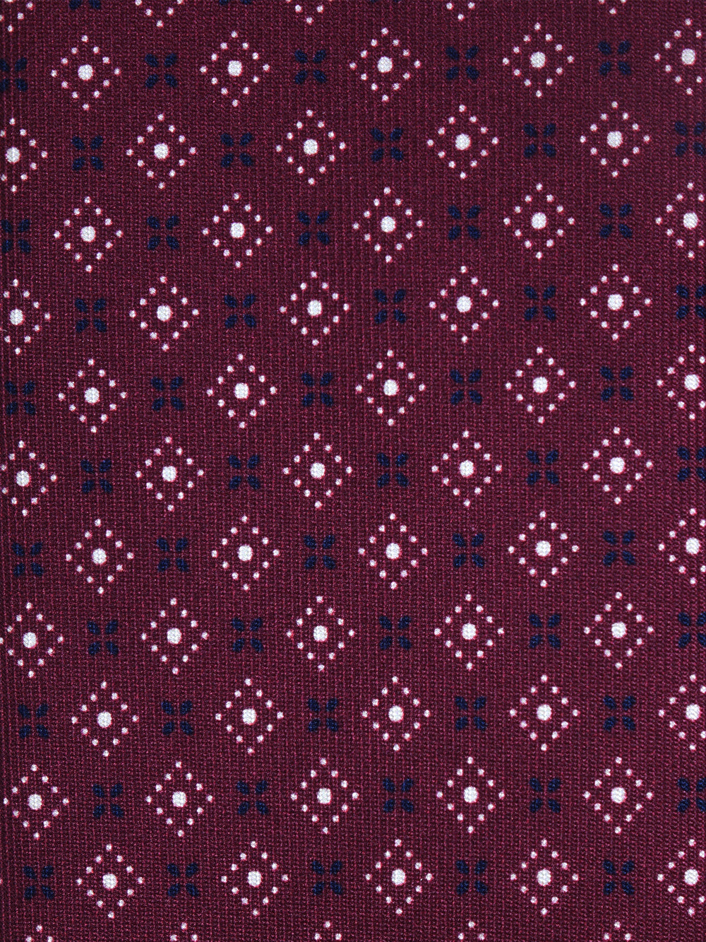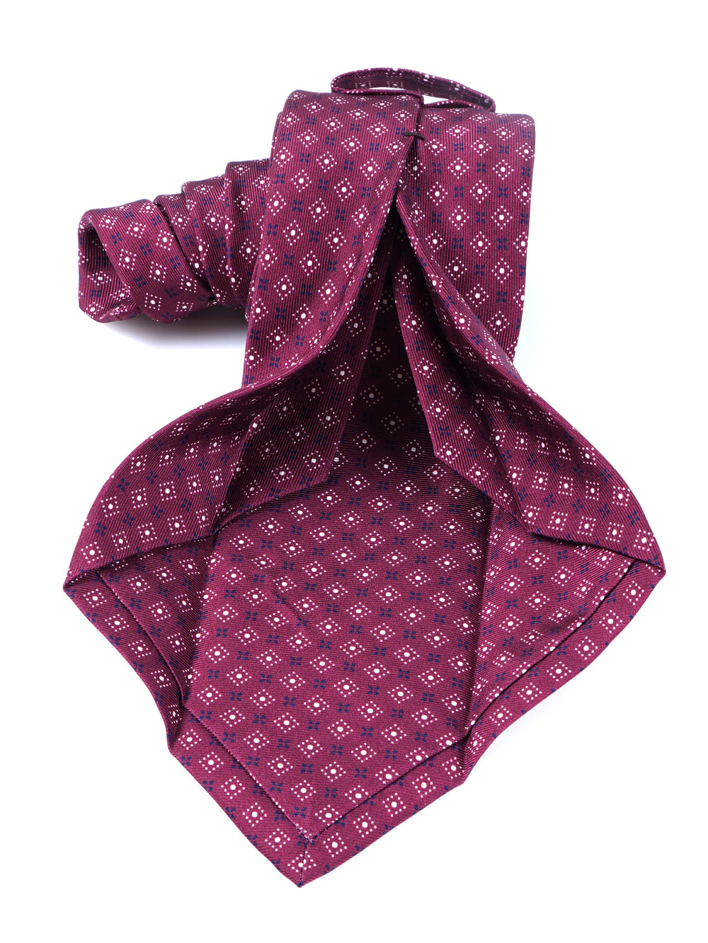 L'apice dell'artigianalità cravattaia, la Sette Pieghe è un'opera di pura sartoria. Questo modello è forgiato da un unico, ampio taglio di seta jacquard di altissima qualità, ripiegato più volte su se stesso per ottenere la forma e la consistenza della cravatta. Questa antica tecnica le conferisce un peso e un drappeggio inimitabili, creando un nodo voluminoso e una "fossetta" di eleganza suprema. La palette cromatica, un regale bordeaux impreziosito da un micro-disegno blu navy e bianco, la rende un accessorio di potere e raffinatezza.