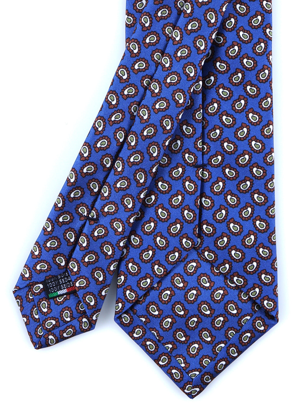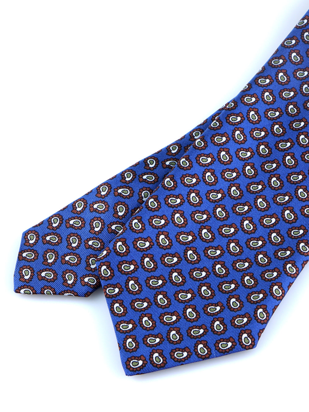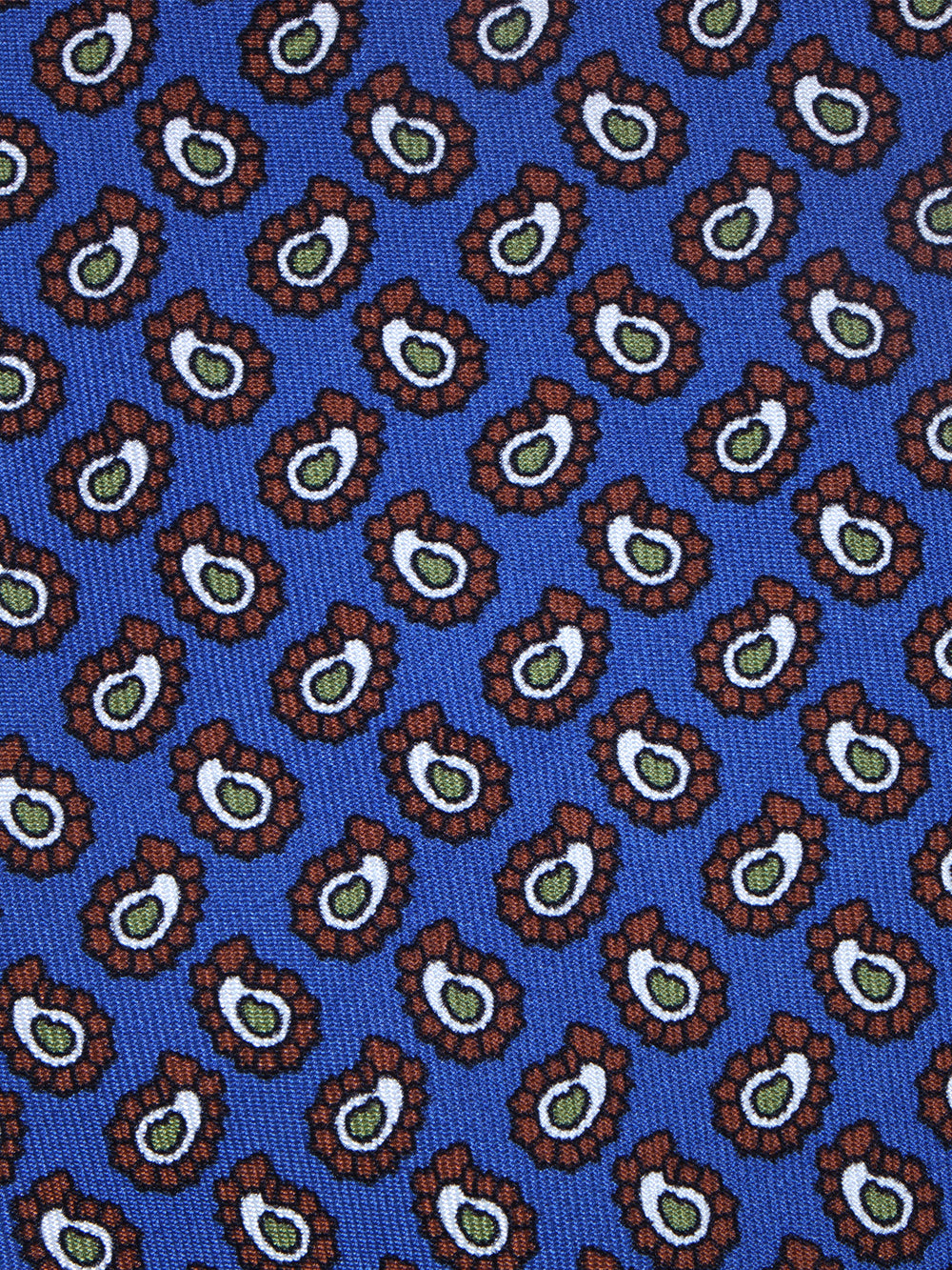 Questa cravatta è un caposaldo della collezione Autunno/Inverno, un vero e proprio "falso unito" che nasconde un'anima ricca di dettagli. Su un fondo blu royal, classico e vibrante, fiorisce una delicata fantasia che gioca con i toni caldi del bordeaux e del marrone. Realizzata in una preziosa saia di seta, è un pezzo di una versatilità straordinaria, pensato per essere il punto di partenza su cui costruire un intero outfit da intenditore.