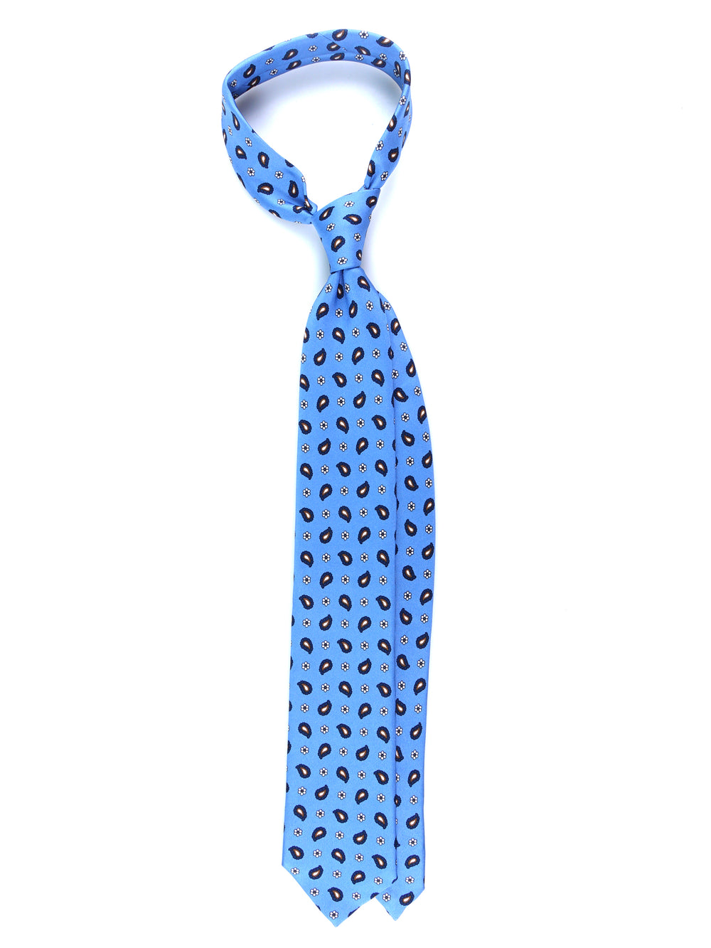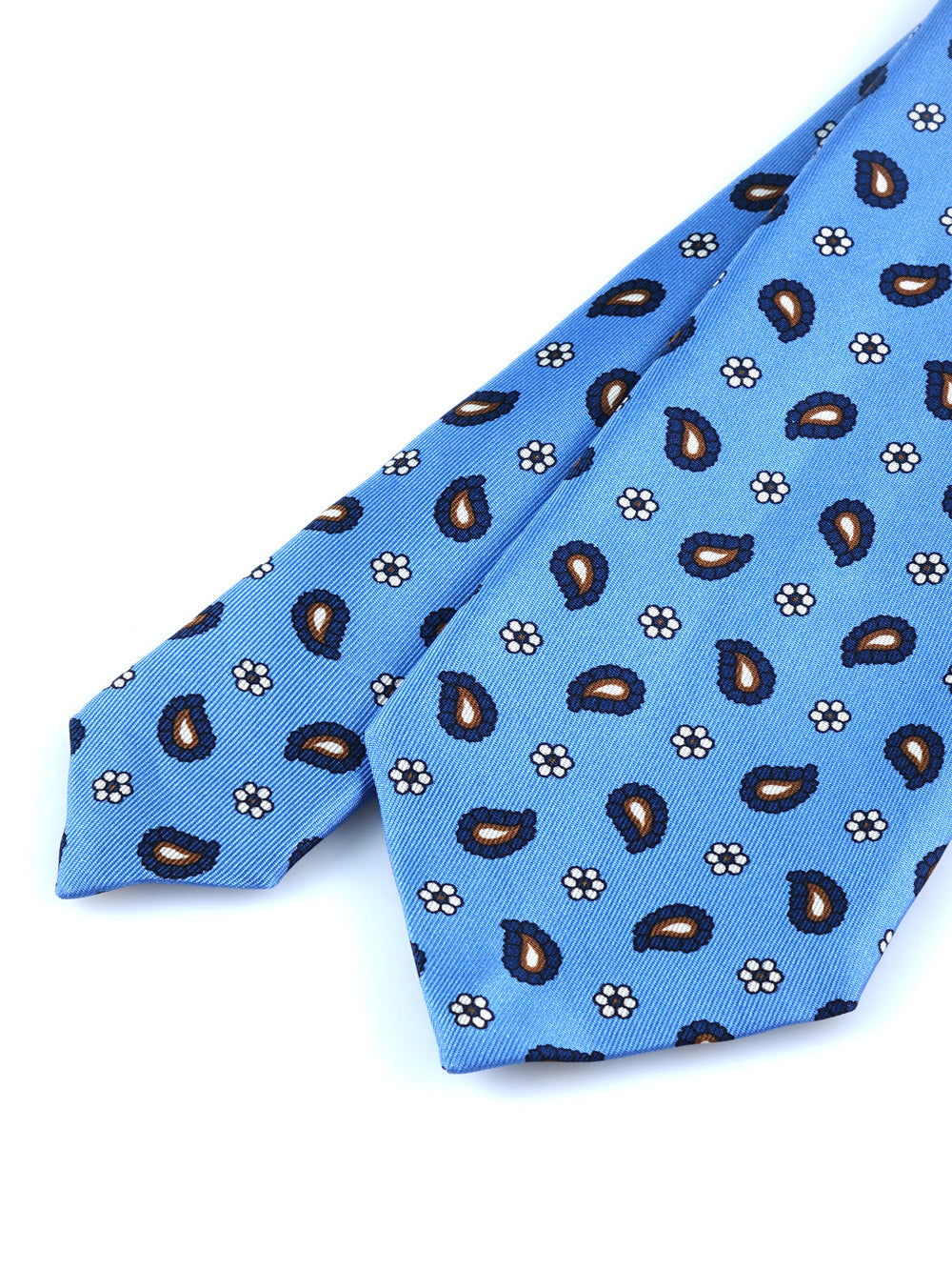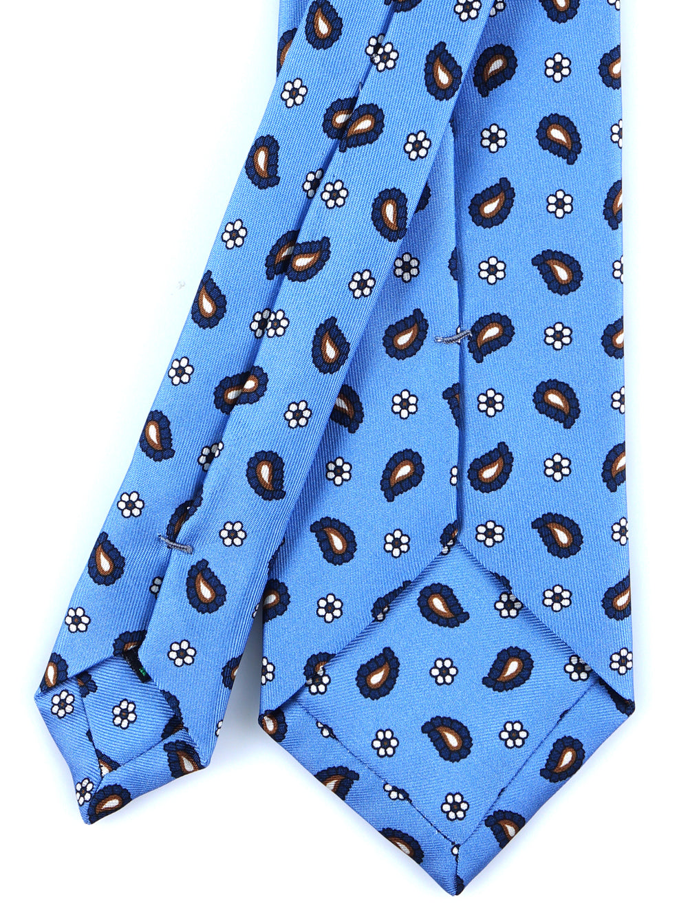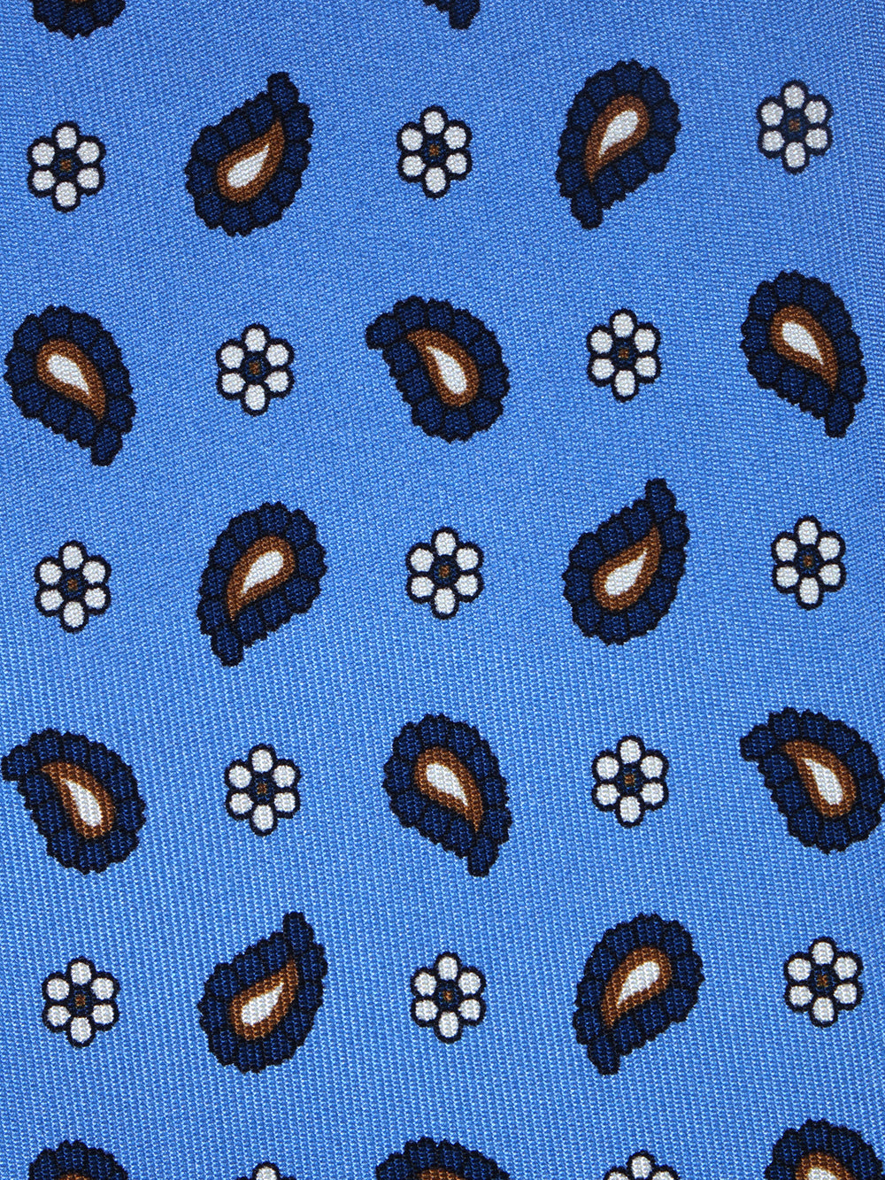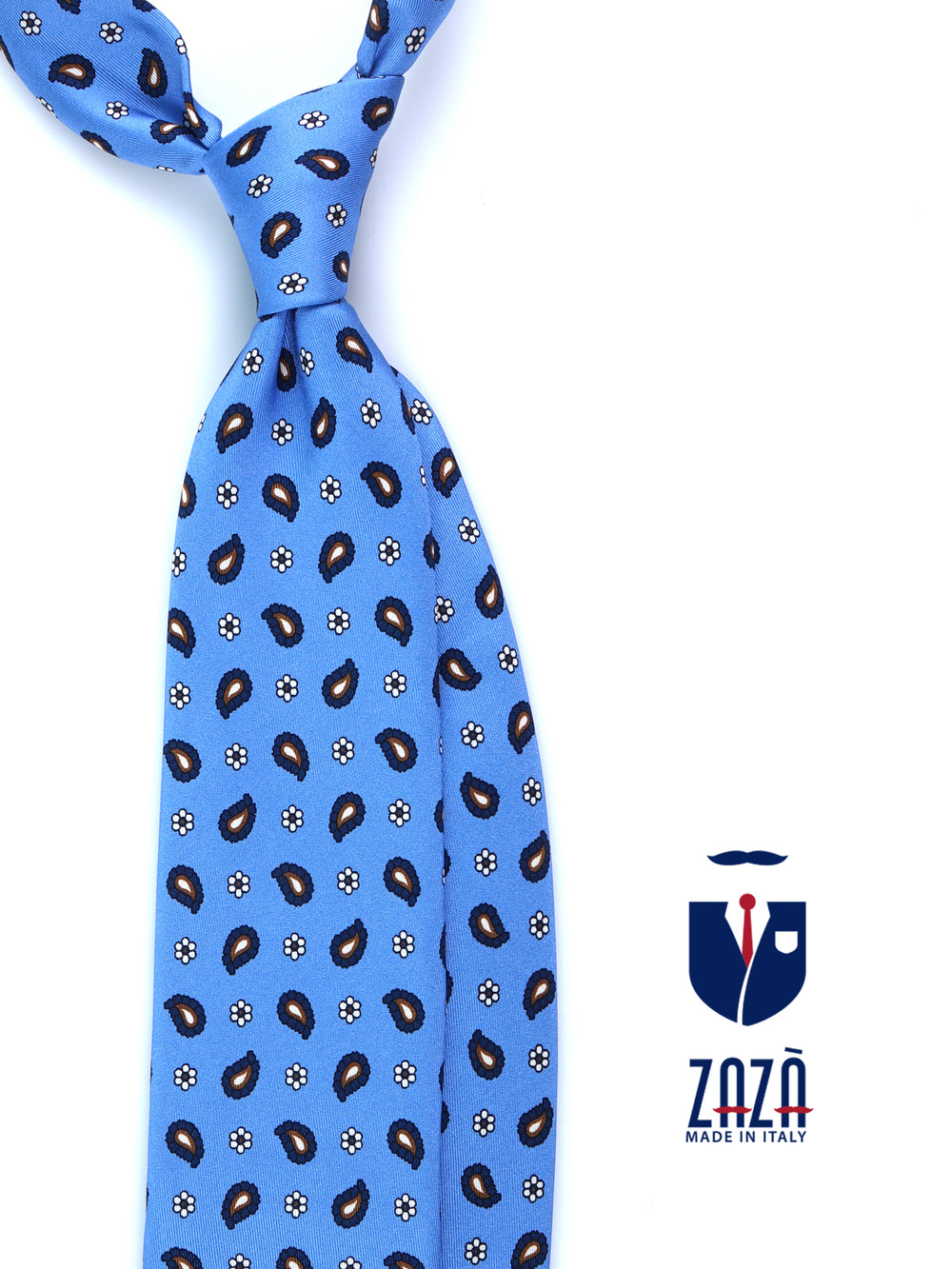 Un inno all'eleganza solare, questa cravatta ZAZÀ è un accessorio per l'uomo che vuole esprimere il proprio stile con raffinatezza. Realizzata in pregiata seta stampata, si distingue per la sua base in un luminoso azzurro vivo, una tela perfetta per un dialogo cromatico di grande gusto. Il raffinato micro-disegno, che alterna un cachemire stilizzato a piccoli fiori, unisce la profondità del blu navy e il calore del marrone, creando un pezzo che non passa inosservato ma che mantiene sempre un'eleganza impeccabile, firmata ZAZÀ Made in Italy.