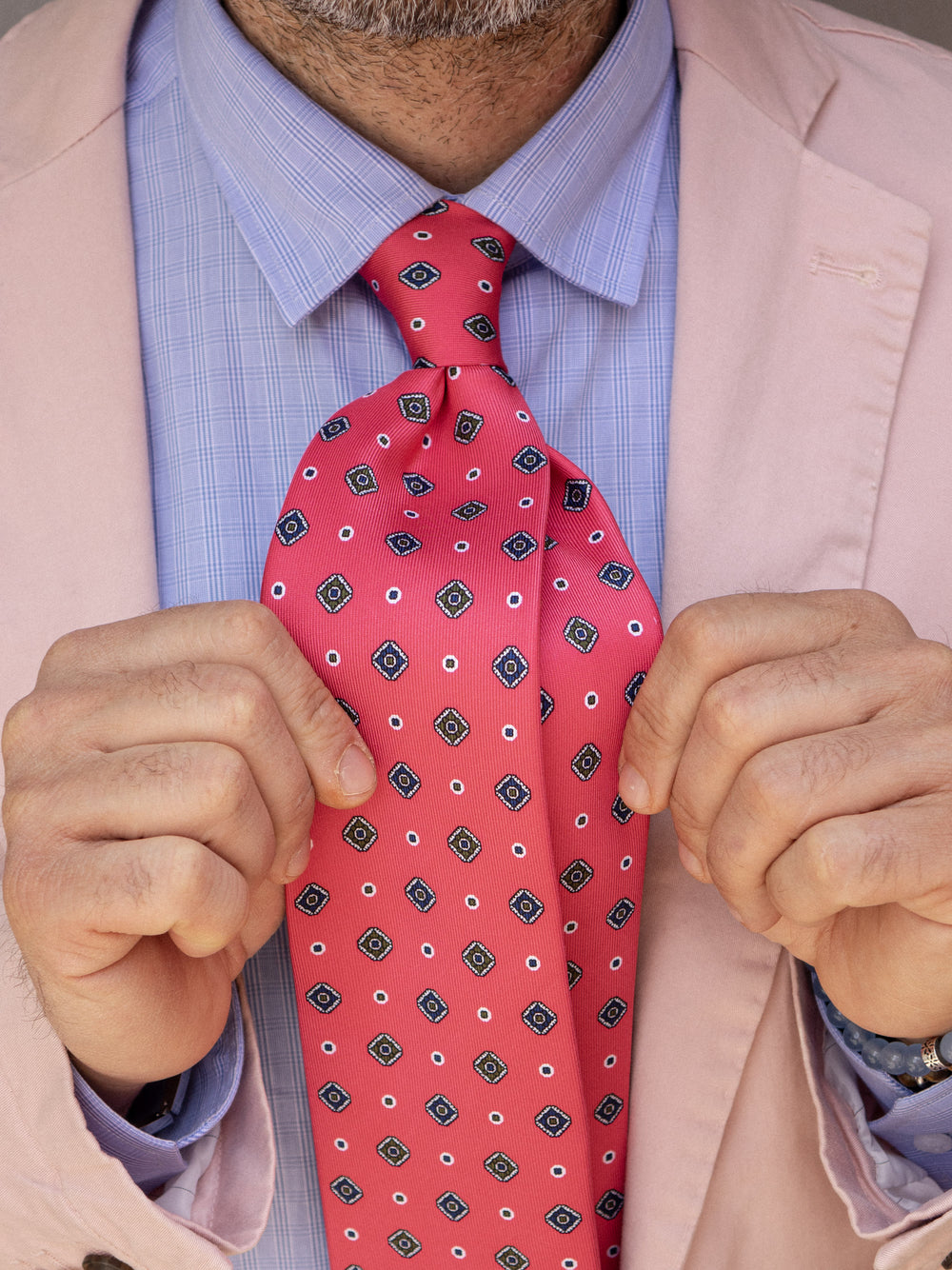 Questa cravatta in seta inglese stampata blu, arricchita da un raffinato motivo geometrico marrone e azzurro, è la scelta ideale per l’uomo che desidera un accessorio distintivo e versatile. Un perfetto equilibrio tra tradizione e modernità, realizzata a mano in Italia.