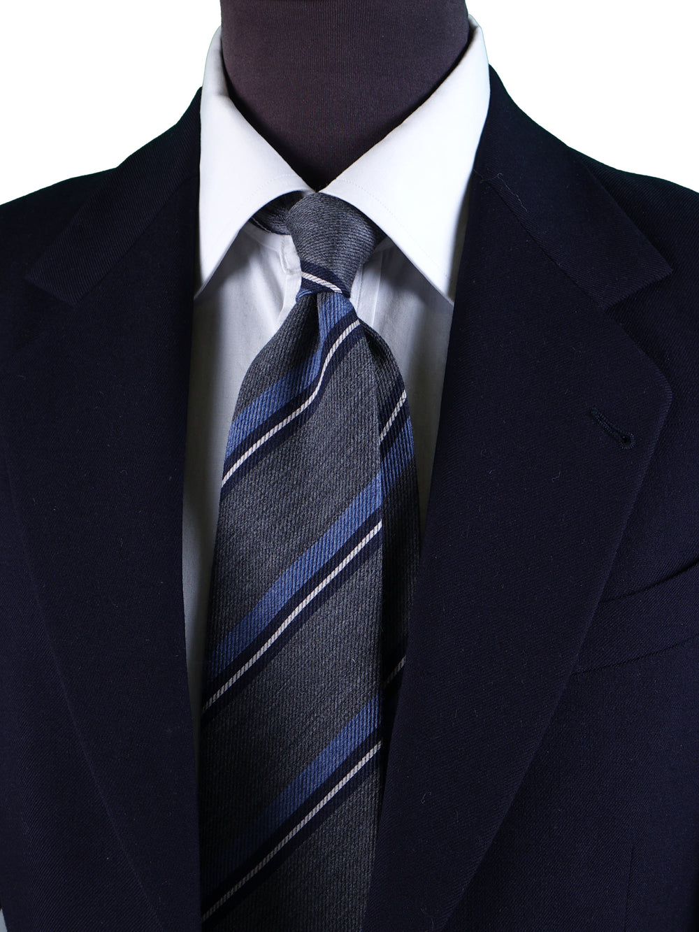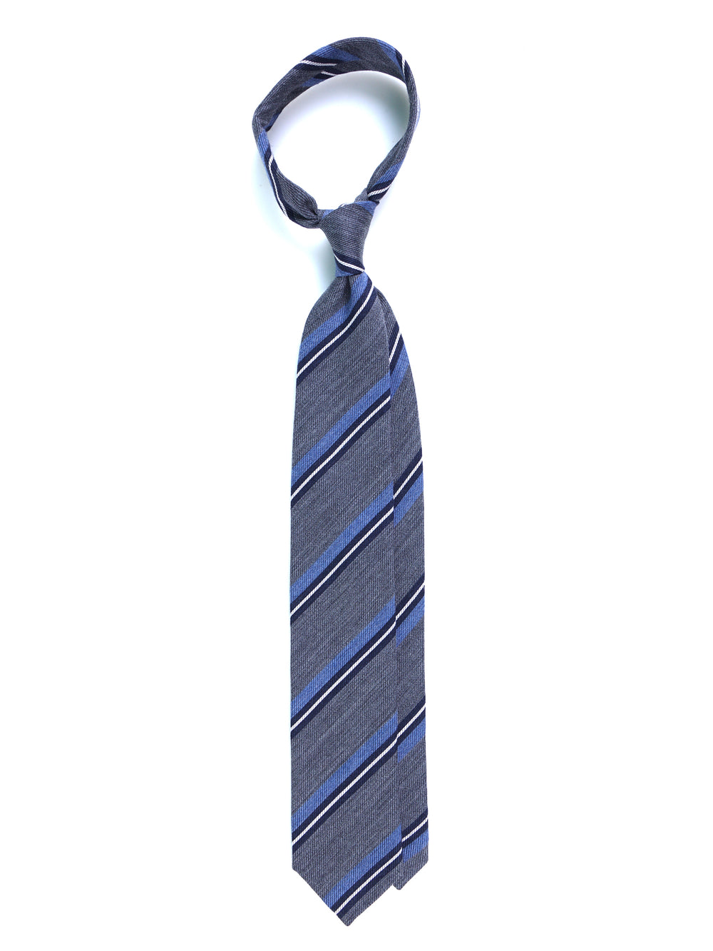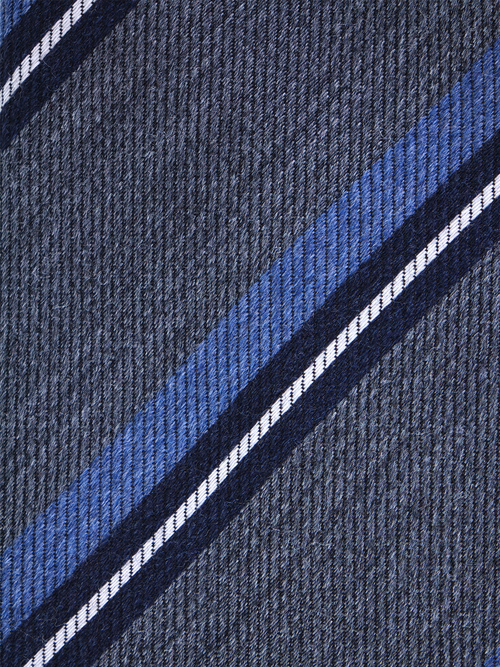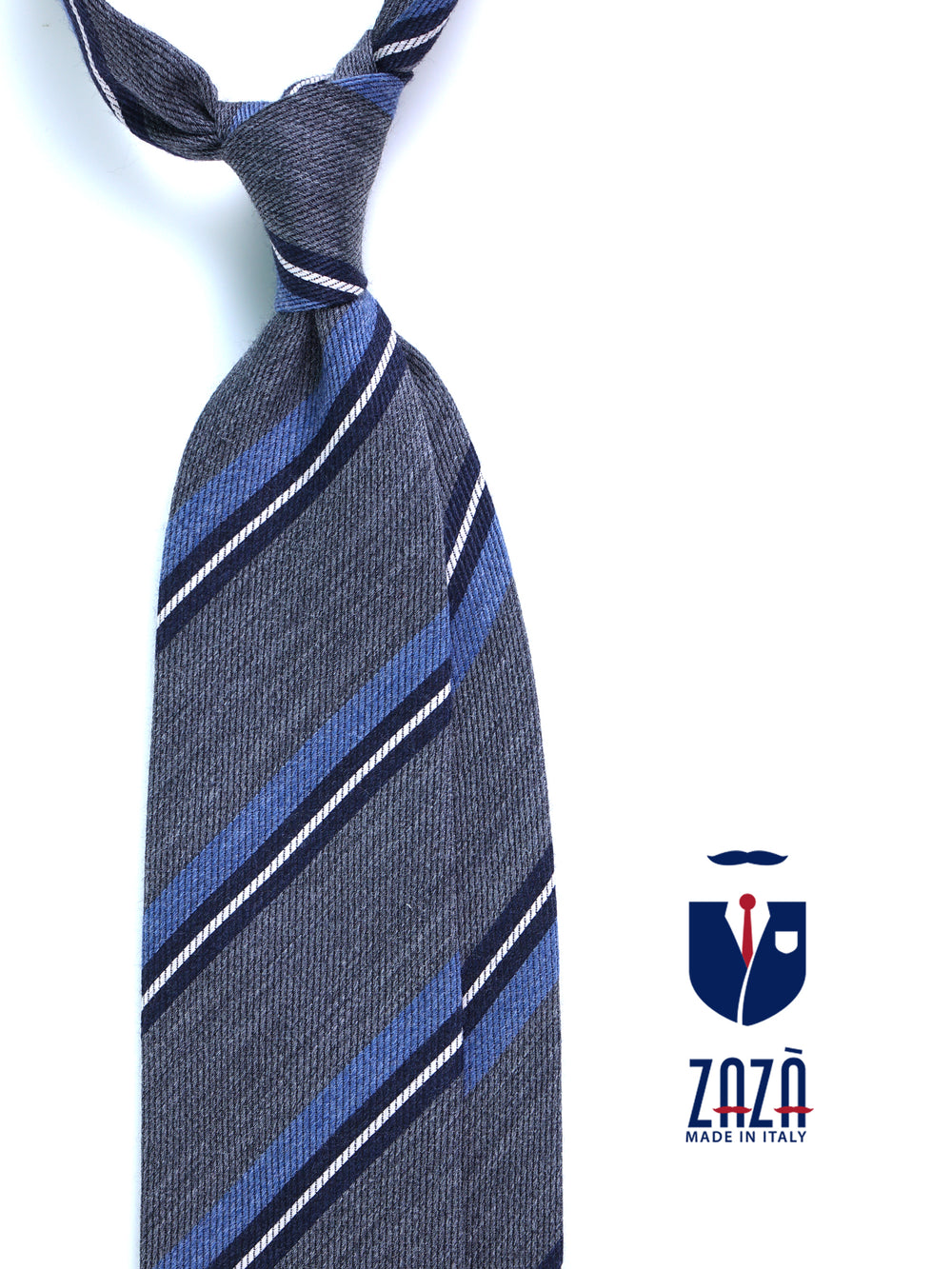Un pilastro della collezione Autunno/Inverno ZAZÀ, questa cravatta è un esempio di equilibrio e versatilità. Il prezioso blend di lana e seta le conferisce una mano ricca e una consistenza ideale per la stagione fredda. La base è un elegantissimo grigio mélange, un colore neutro che fa da sfondo perfetto per le righe dal carattere deciso, in una palette di azzurro vibrante e blu navy profondo, illuminate da un sottile filetto bianco. È un accessorio pensato per l'uomo che ama i classici, ma li sceglie con una sensibilità cromatica moderna e ricercata.