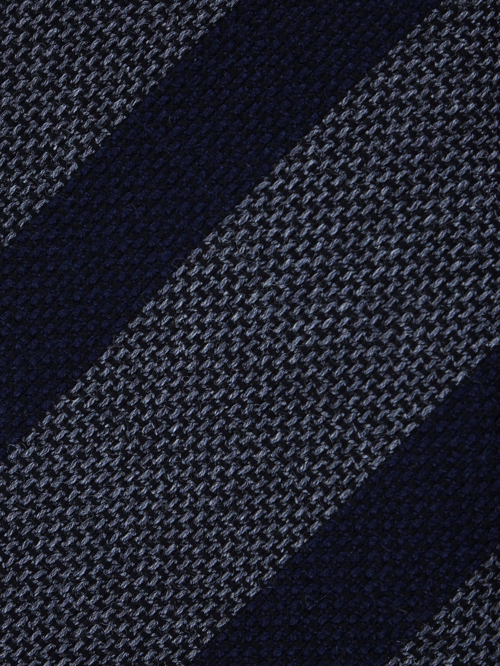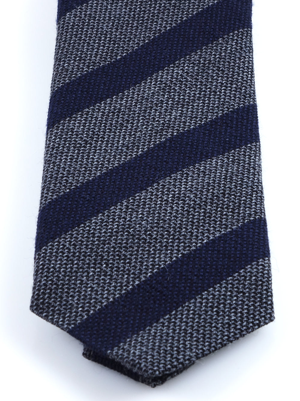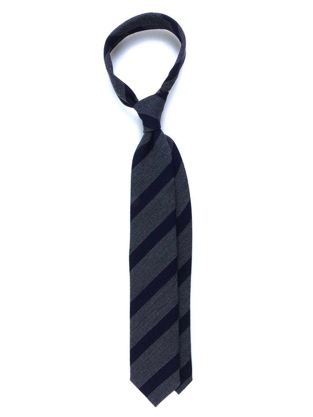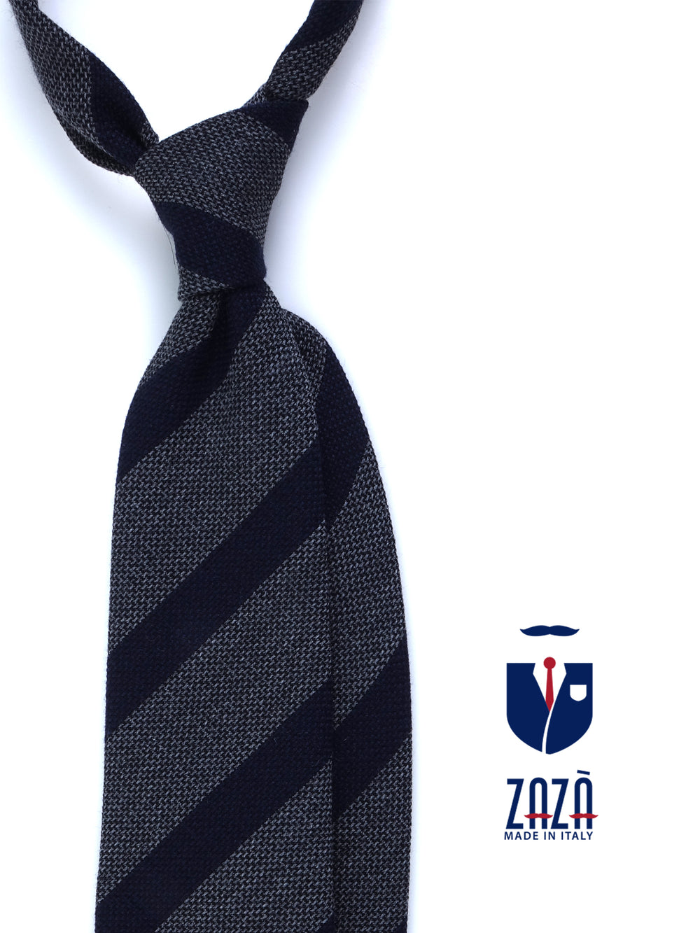 Un classico intramontabile del guardaroba maschile, reinterpretato secondo l'eccellenza ZAZÀ Made in Italy. Questa cravatta unisce la nobiltà della lana, che le dona struttura e una mano piacevolmente materica, alla luminosità della seta, che ne esalta i riflessi cromatici. Il disegno a righe regimental, nei toni classici del blu navy e di un grigio perla finemente operato, crea un effetto visivo dinamico e di grande impatto. È un accessorio pensato per l'uomo che apprezza la tradizione ma la vive con spirito contemporaneo.