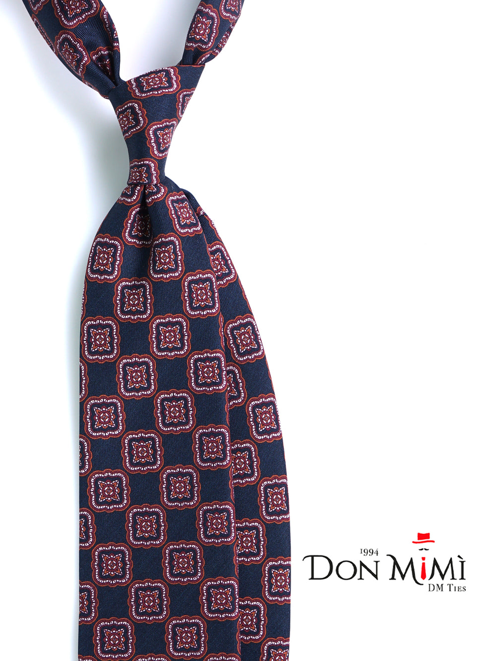 Un pilastro di eleganza classica, questa cravatta Don Mimì è realizzata in pregiata seta stampata, un tessuto che garantisce un drappeggio impeccabile, una lucentezza discreta e la capacità di creare un nodo perfetto. Il suo design si basa su un raffinato motivo geometrico a medaglione, dove il dialogo cromatico tra il calore del bordeaux e del terracotta e la profondità autorevole del fondo blu navy crea un equilibrio visivo di grande raffinatezza. È l'accessorio dell'uomo che apprezza un'eleganza classica ma non banale, firmata con l'inconfondibile gusto italiano di Don Mimì.