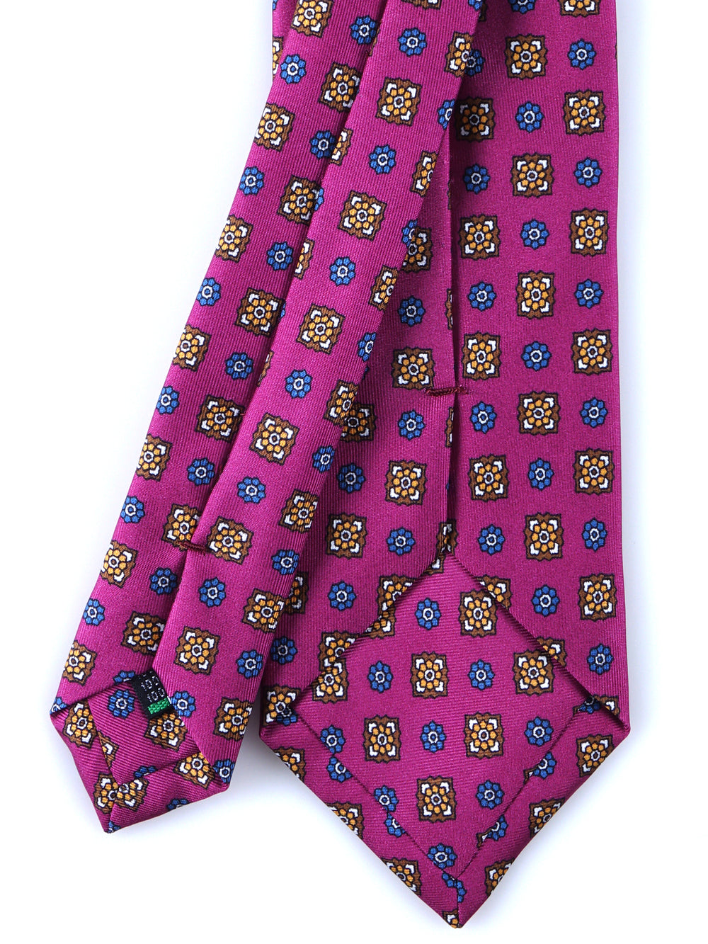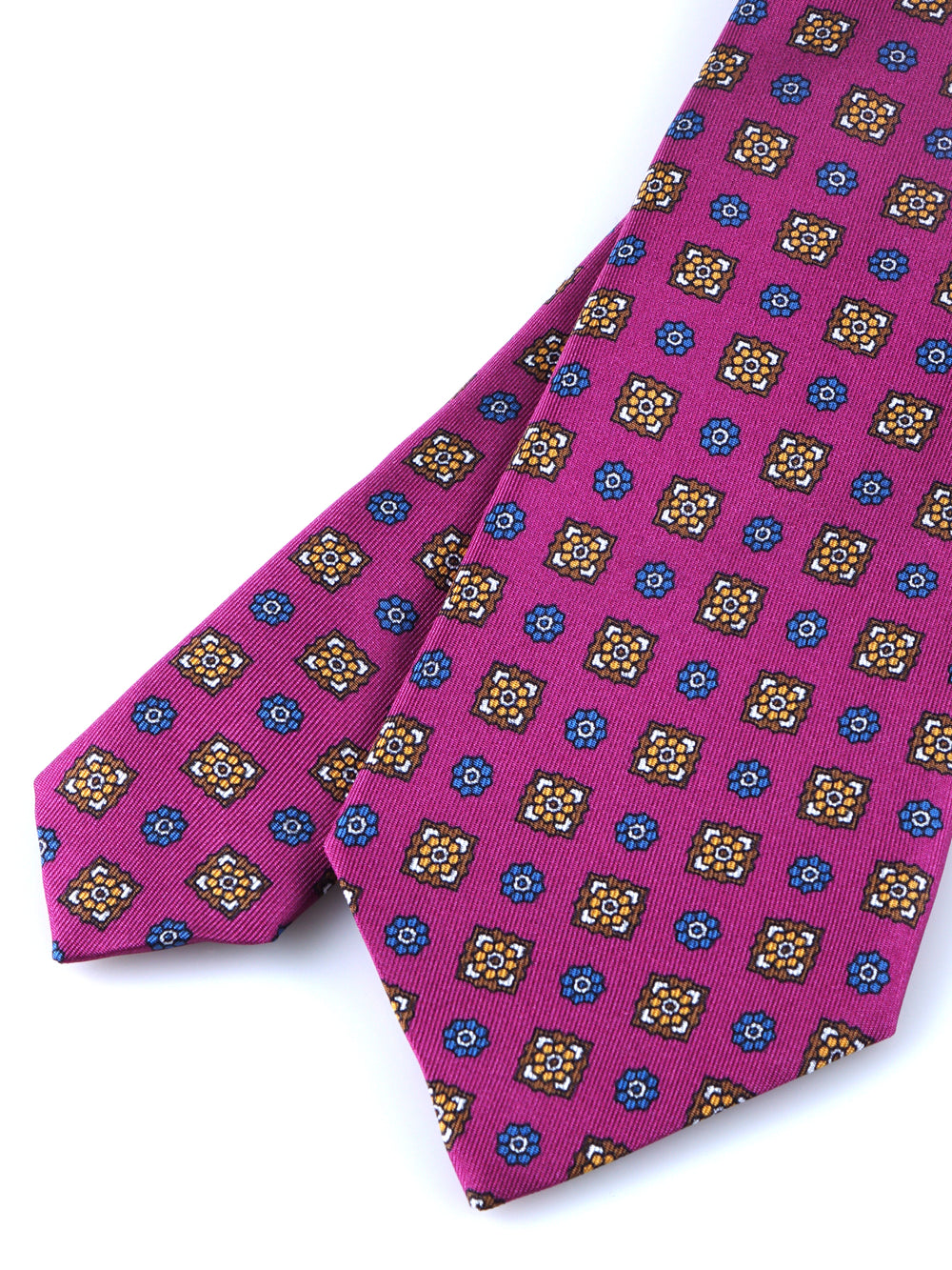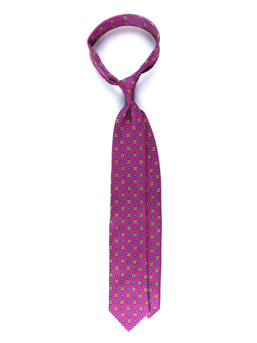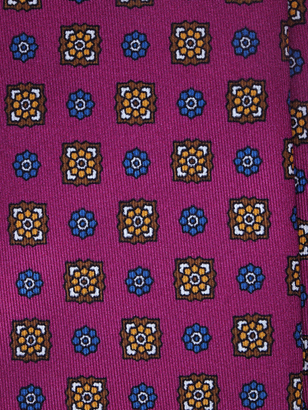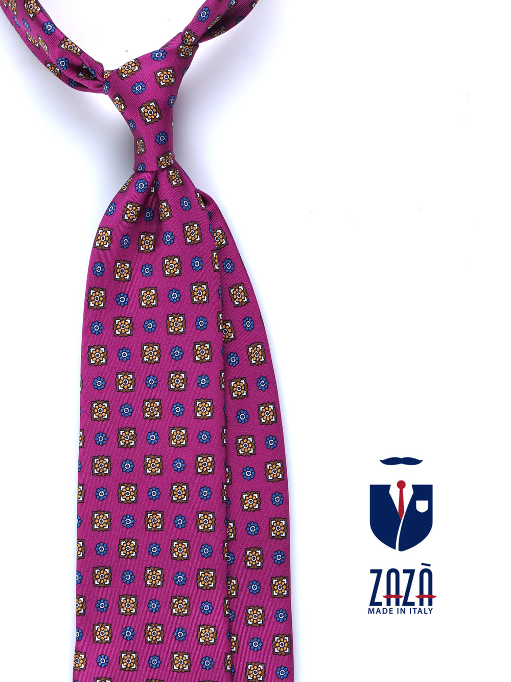 Questa cravatta è un'iniezione di pura energia stilistica, un pezzo forte della collezione Autunno/Inverno per l'uomo che non ha paura di essere notato. Il suo cuore pulsante è il colore: un magenta vibrante e audace, su cui fiorisce una fantasia che dialoga con note di marrone, ocra e blu. Realizzata in una preziosa saia di seta, questa cravatta è pensata per l'uomo che vive lo stile come una forma d'arte, un'espressione di sé.