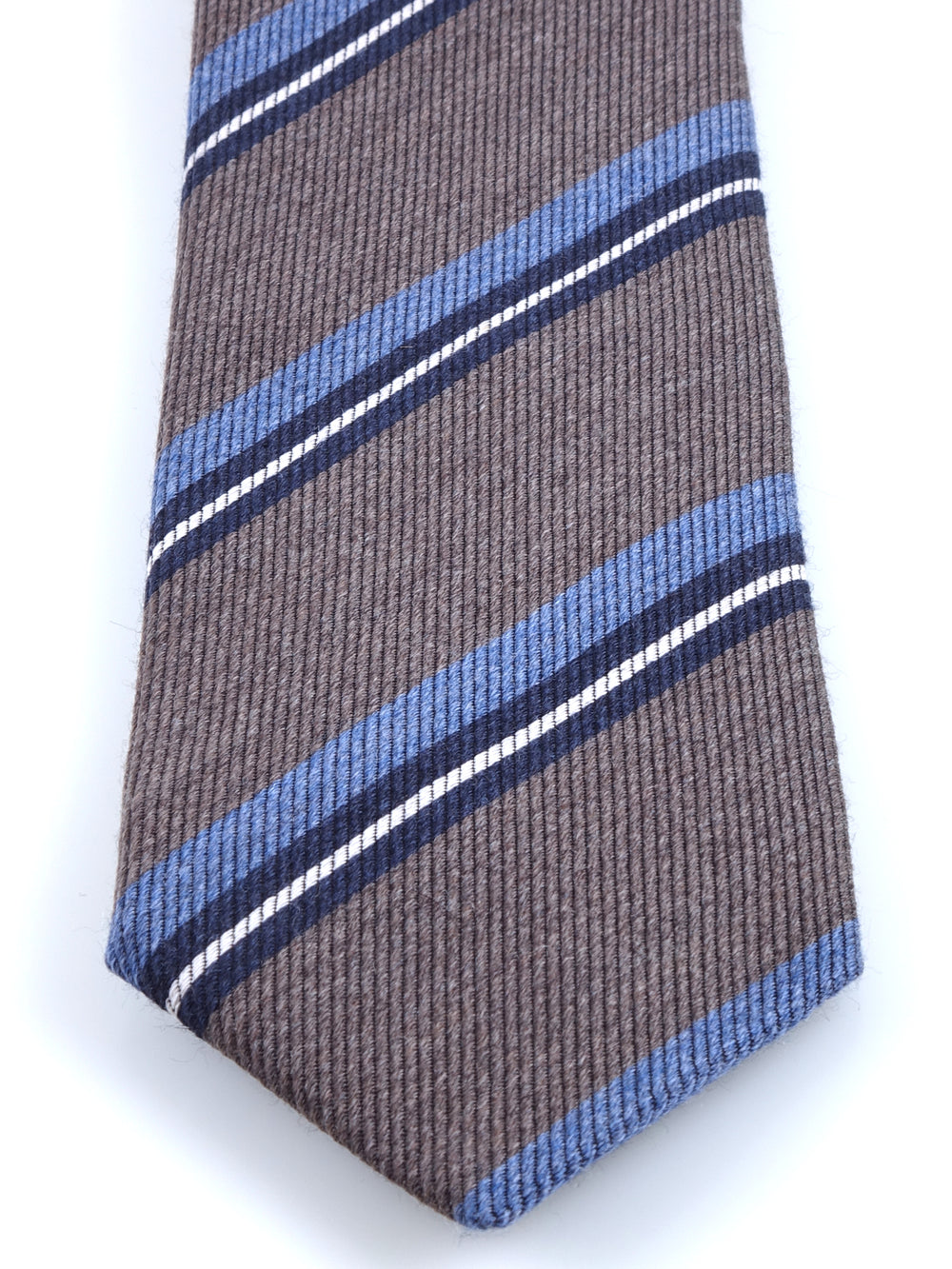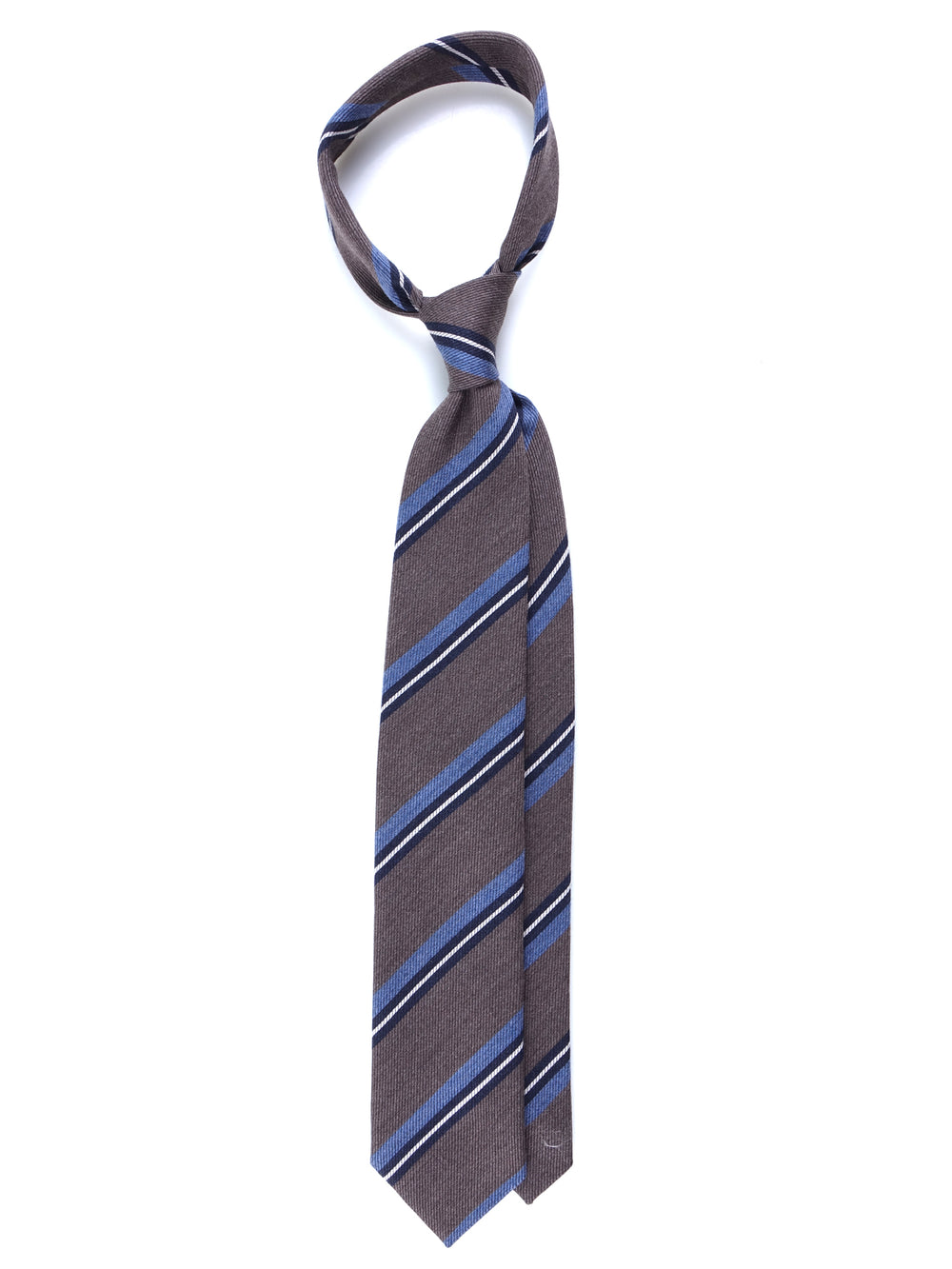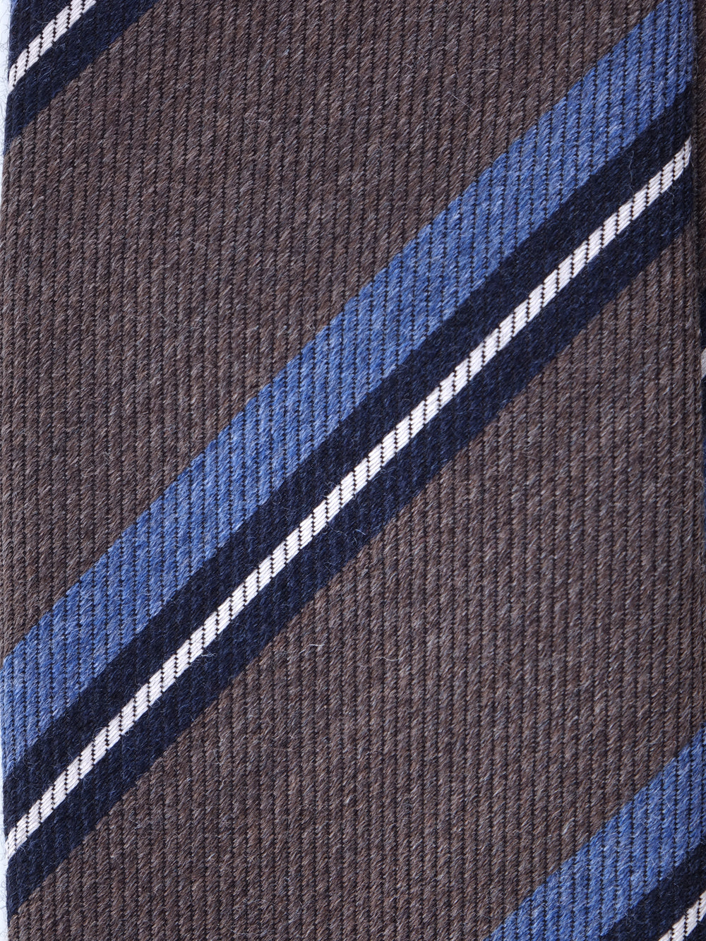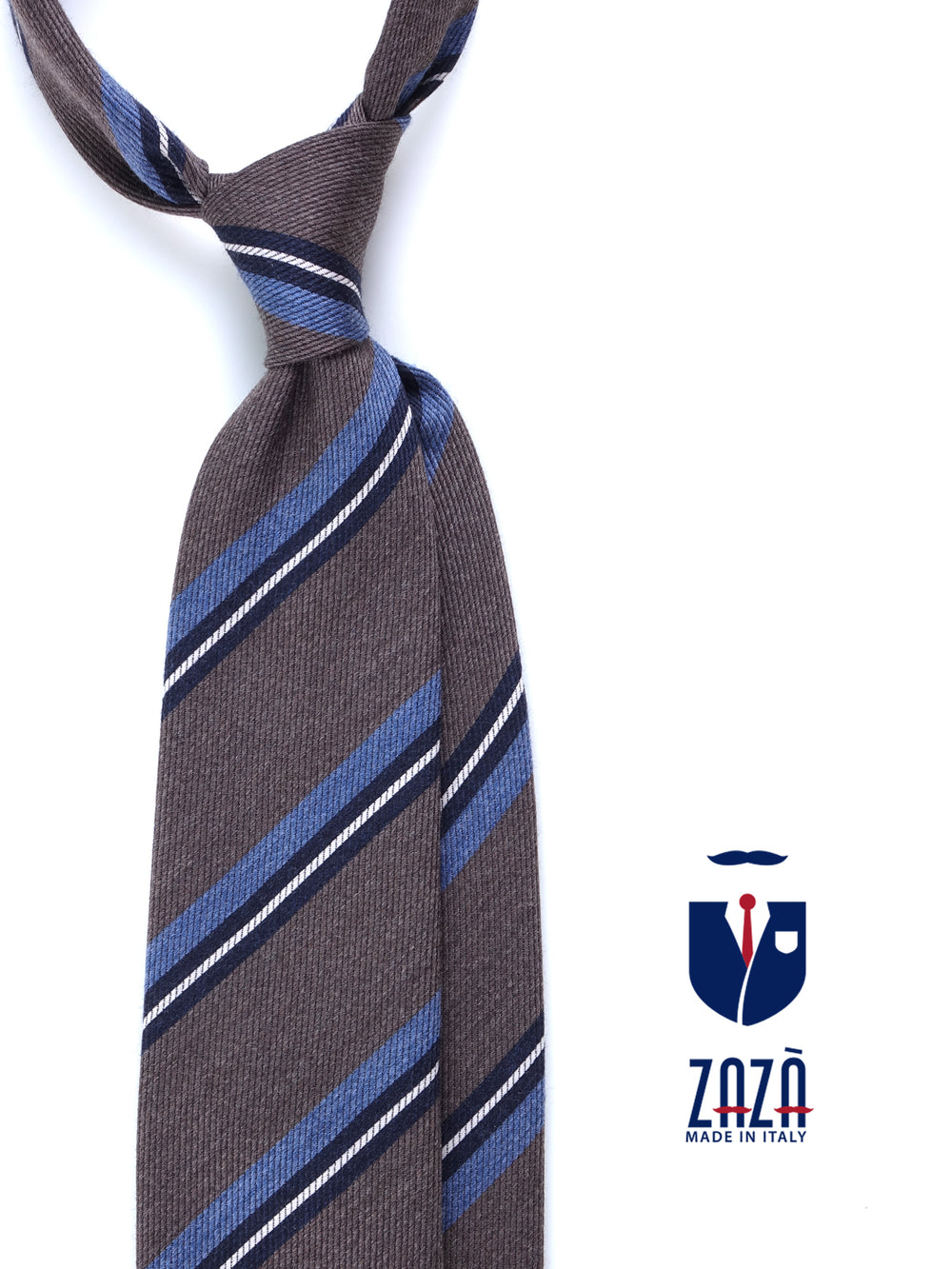 Un capolavoro di armonia cromatica che celebra uno degli abbinamenti più amati dagli intenditori di stile: il marrone e il blu. Questa cravatta ZAZÀ in pura lana presenta una base in un sofisticato marrone talpa, arricchita da righe azzurre e blu navy che creano un contrasto vibrante ma sempre equilibrato. La texture della lana conferisce all'accessorio una mano asciutta e un'eleganza materica, rendendolo perfetto per chi desidera distinguersi con classe, uscendo dai canoni più tradizionali. È la scelta dell'uomo sicuro del proprio gusto, che conosce il potere dei colori.