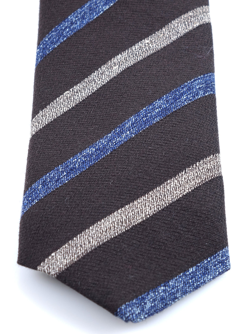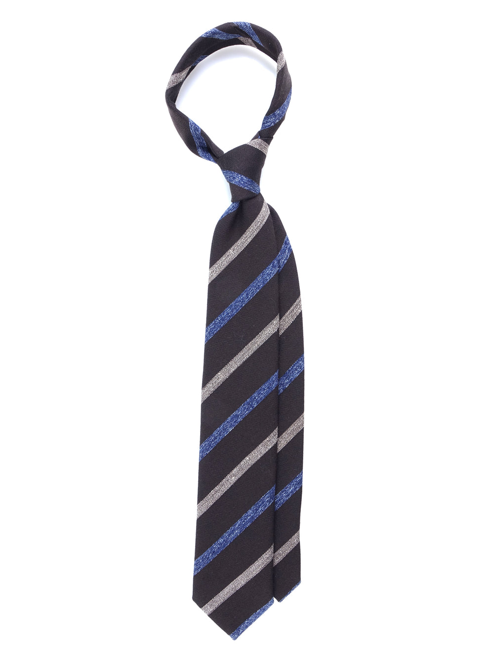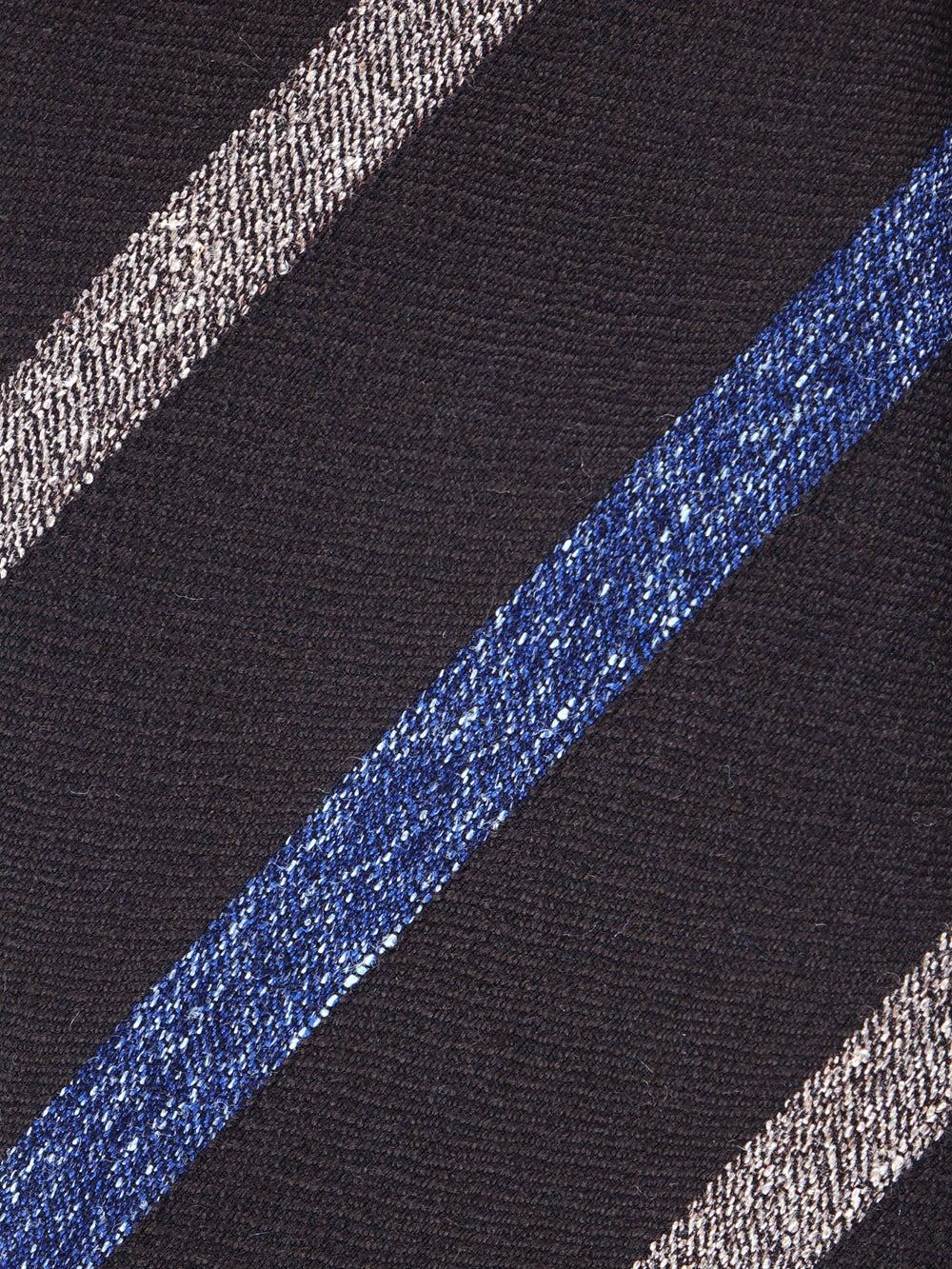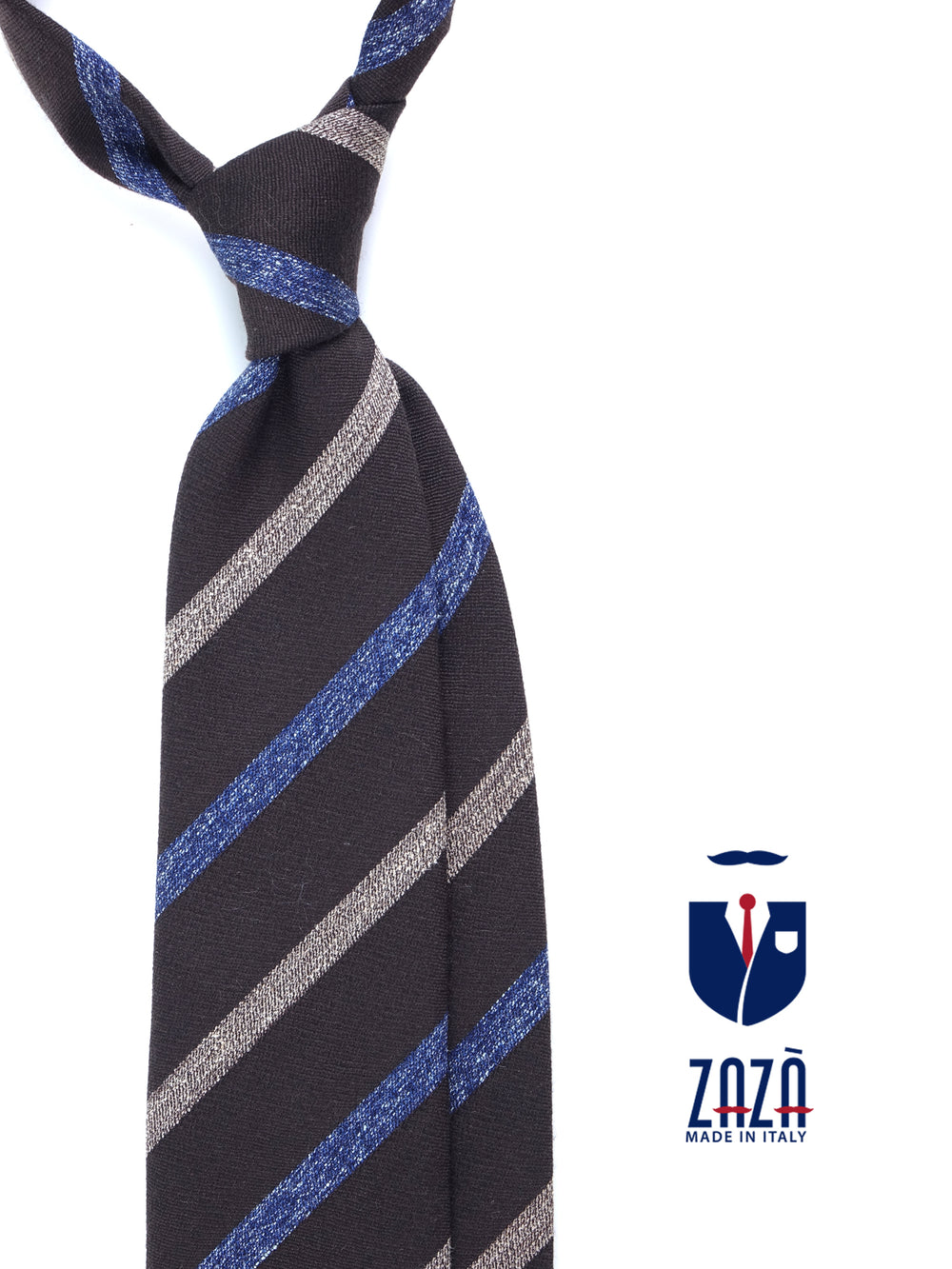 Questa cravatta è un pilastro della collezione Autunno/Inverno, un accessorio che celebra la ricchezza dei tessuti nobili. Realizzata in una pregiata miscela paritaria di lana e seta, possiede il calore e la texture della prima uniti alla lucentezza e fluidità della seconda. Il classico disegno Regimental è qui interpretato con una palette di colori intramontabile: il marrone testa di moro fa da sfondo a righe beige e blu dalla texture melangiata, un dettaglio che denota una qualità superiore. È la firma dell'uomo ZAZÀ: elegante, colto e mai banale.