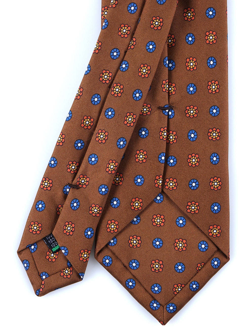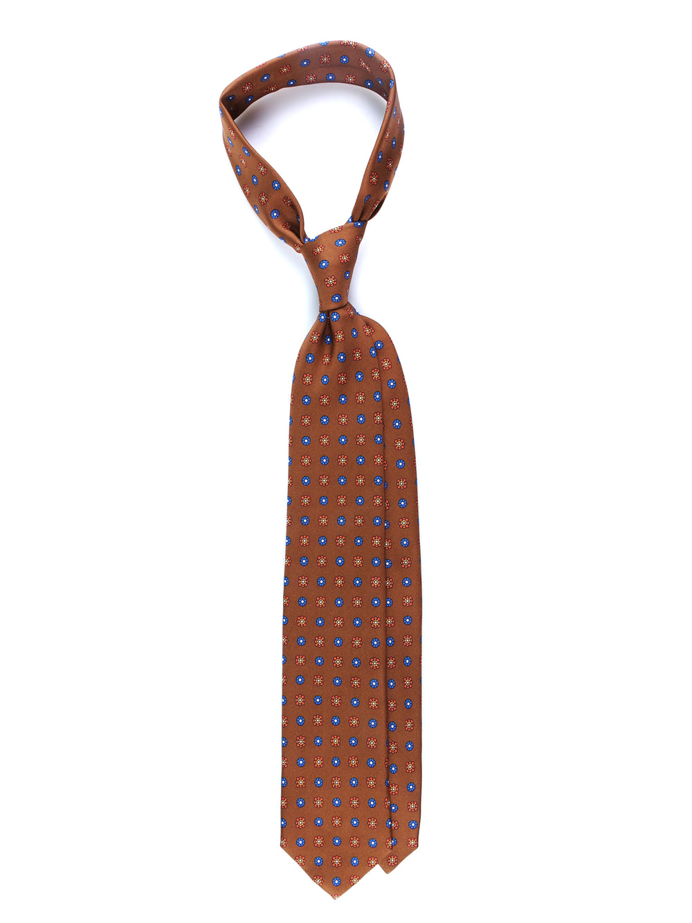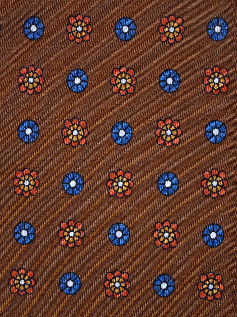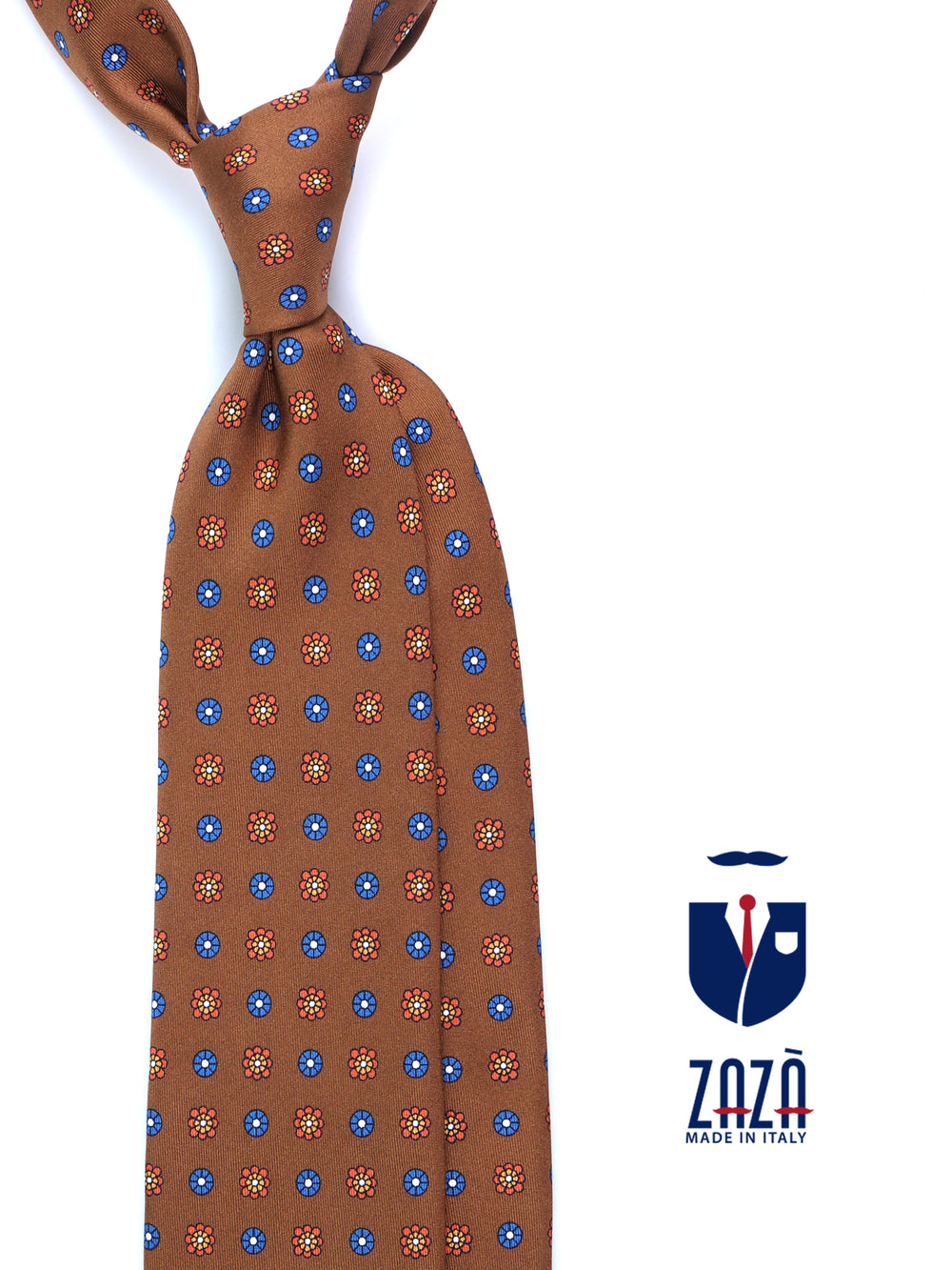 Un accessorio che celebra uno degli abbinamenti più amati dagli intenditori di stile: il marrone e il blu. Questa cravatta ZAZÀ in pregiata seta stampata si distingue per la sua base in un caldo color marrone tabacco, arricchita da un micro-motivo floreale che alterna la vivacità del blu royal e dell'arancio. È un pezzo di grande versatilità, che coniuga la tradizione con un gusto cromatico ricercato, perfetto per l'uomo che vuole distinguersi con classe e cultura sartoriale.