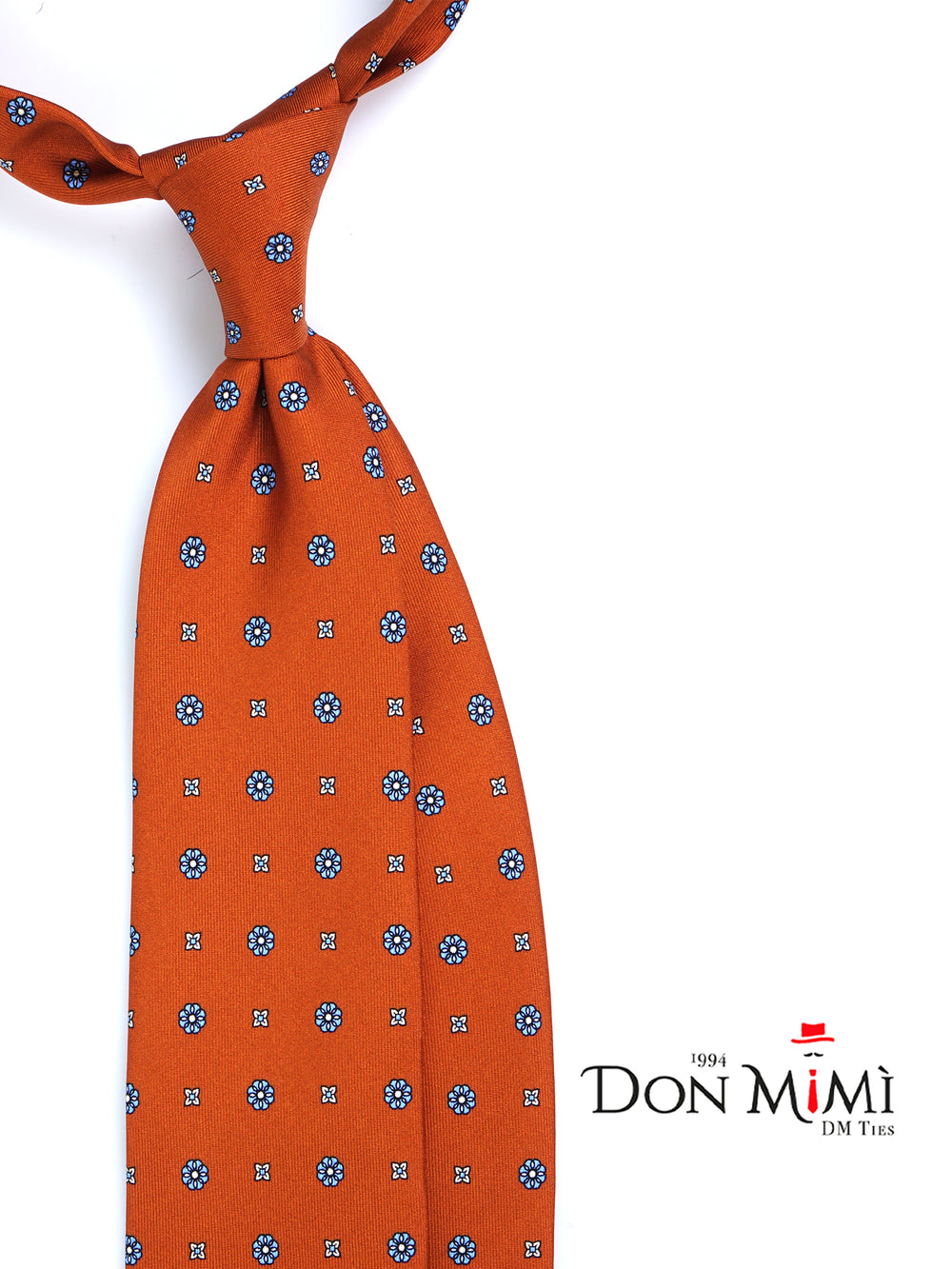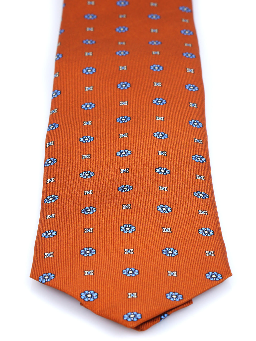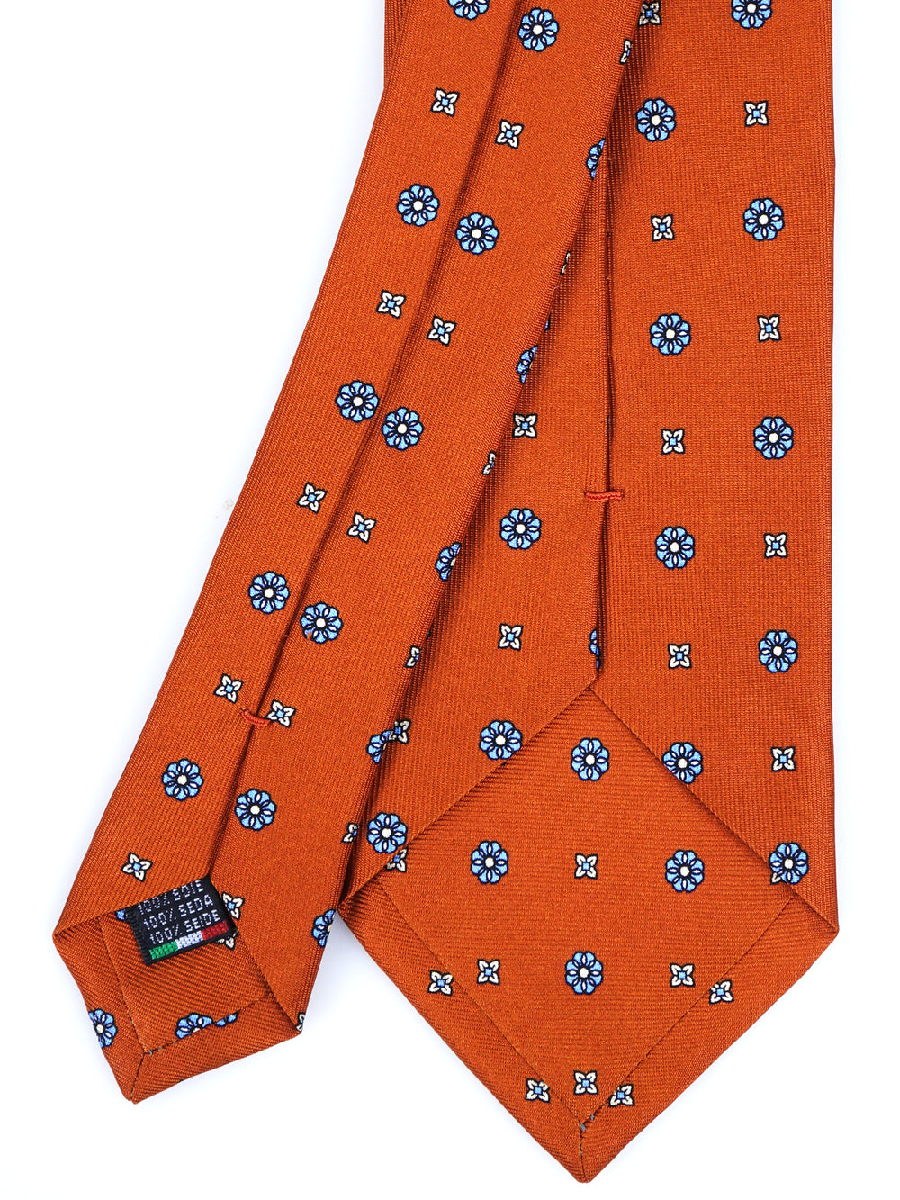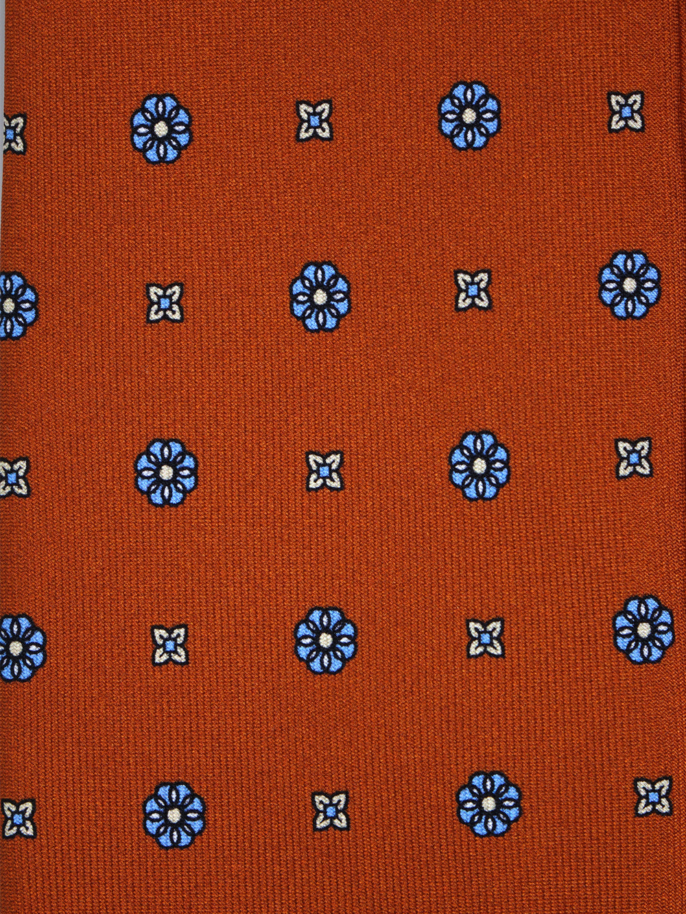 Questa cravatta in seta inglese stampata arancione, impreziosita da un delicato motivo floreale azzurro, è l’accessorio ideale per chi desidera un look sofisticato e distintivo. Un perfetto connubio tra tradizione sartoriale e stile contemporaneo, realizzata a mano in Italia.