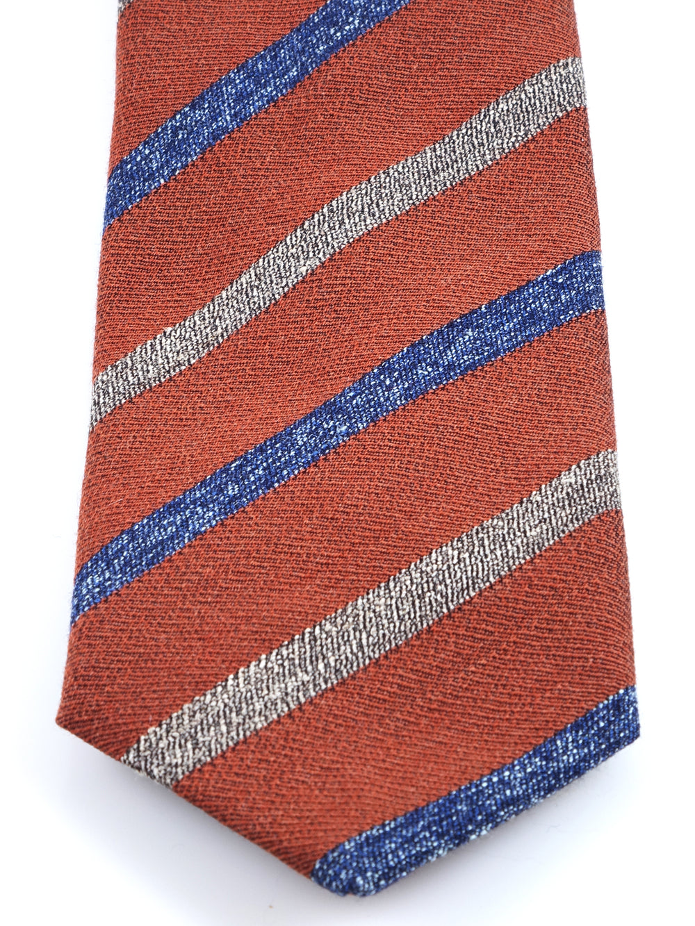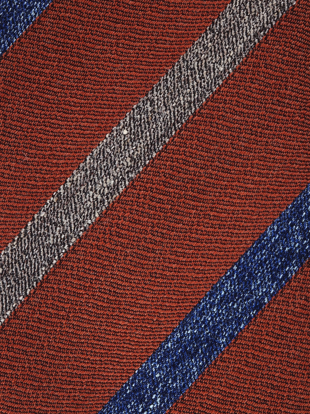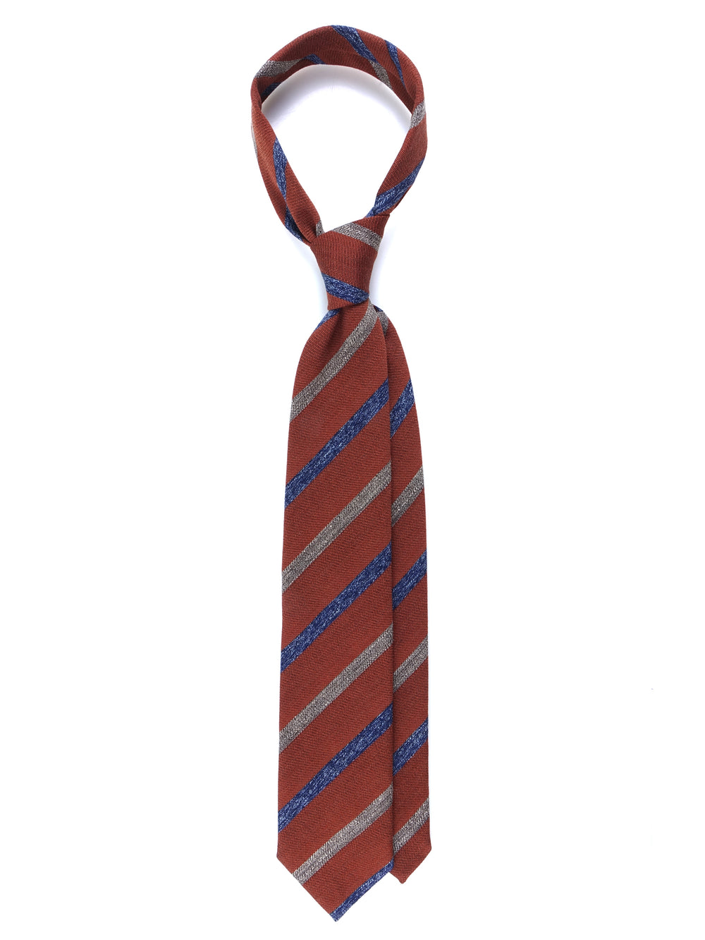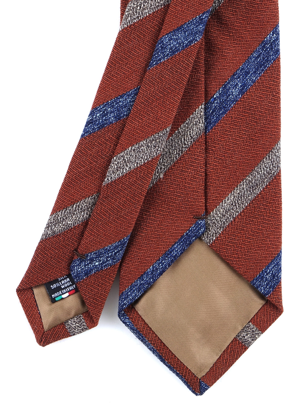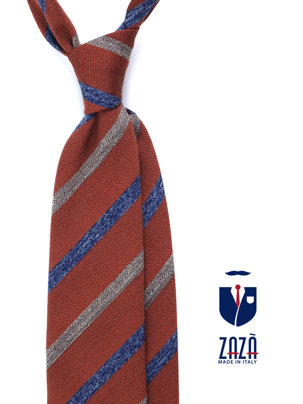Questa cravatta è un pilastro della collezione Autunno/Inverno, un accessorio che celebra la ricchezza dei tessuti nobili. Realizzata in una pregiata miscela paritaria di lana e seta, possiede il calore e la texture della prima uniti alla lucentezza e fluidità della seconda. Il classico disegno Regimental è qui interpretato con una palette di colori calda e sofisticata: il terracotta fa da sfondo a righe beige e blu dalla texture melangiata, un dettaglio che denota una qualità superiore. È la firma dell'uomo ZAZÀ: elegante, colto e mai banale.