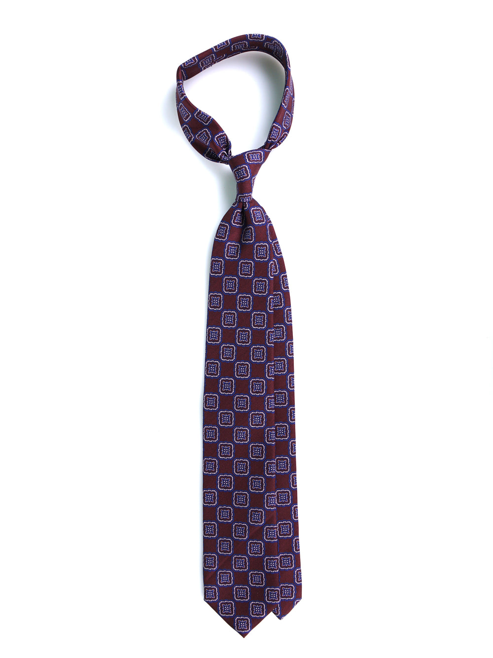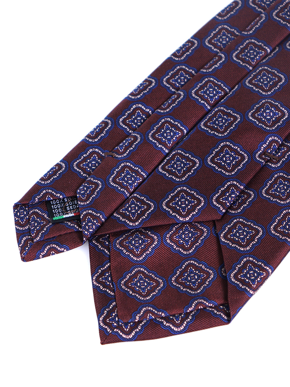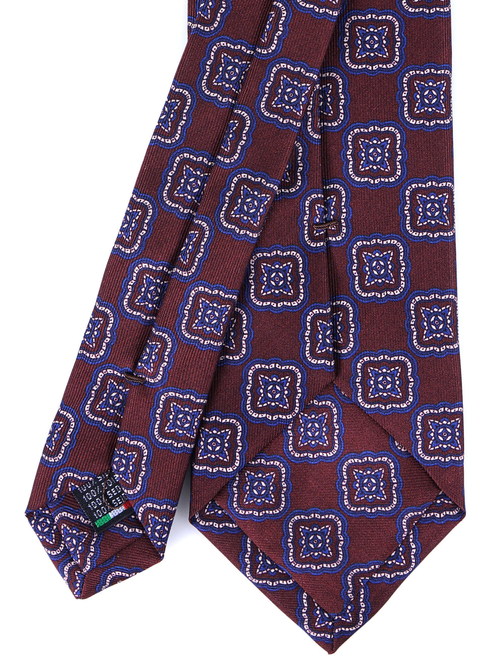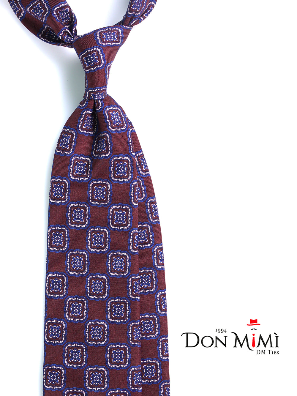 Un capolavoro di equilibrio cromatico, questa cravatta Don Mimì è realizzata in pregiata seta stampata, un tessuto che garantisce un drappeggio impeccabile e una lucentezza discreta. Il suo design si basa su un raffinato motivo geometrico a medaglione, dove la profondità di un ricco bordeaux scuro si sposa con la vivacità del blu royal e la purezza del bianco. È l'accessorio dell'uomo che apprezza un'eleganza classica e autorevole, arricchita da un tocco di colore distintivo e firmata con l'inconfondibile gusto italiano di Don Mimì.