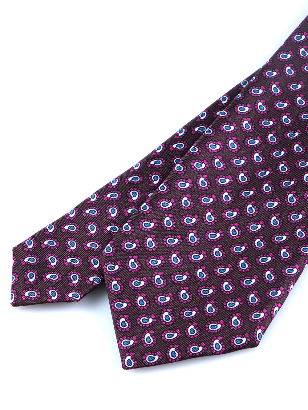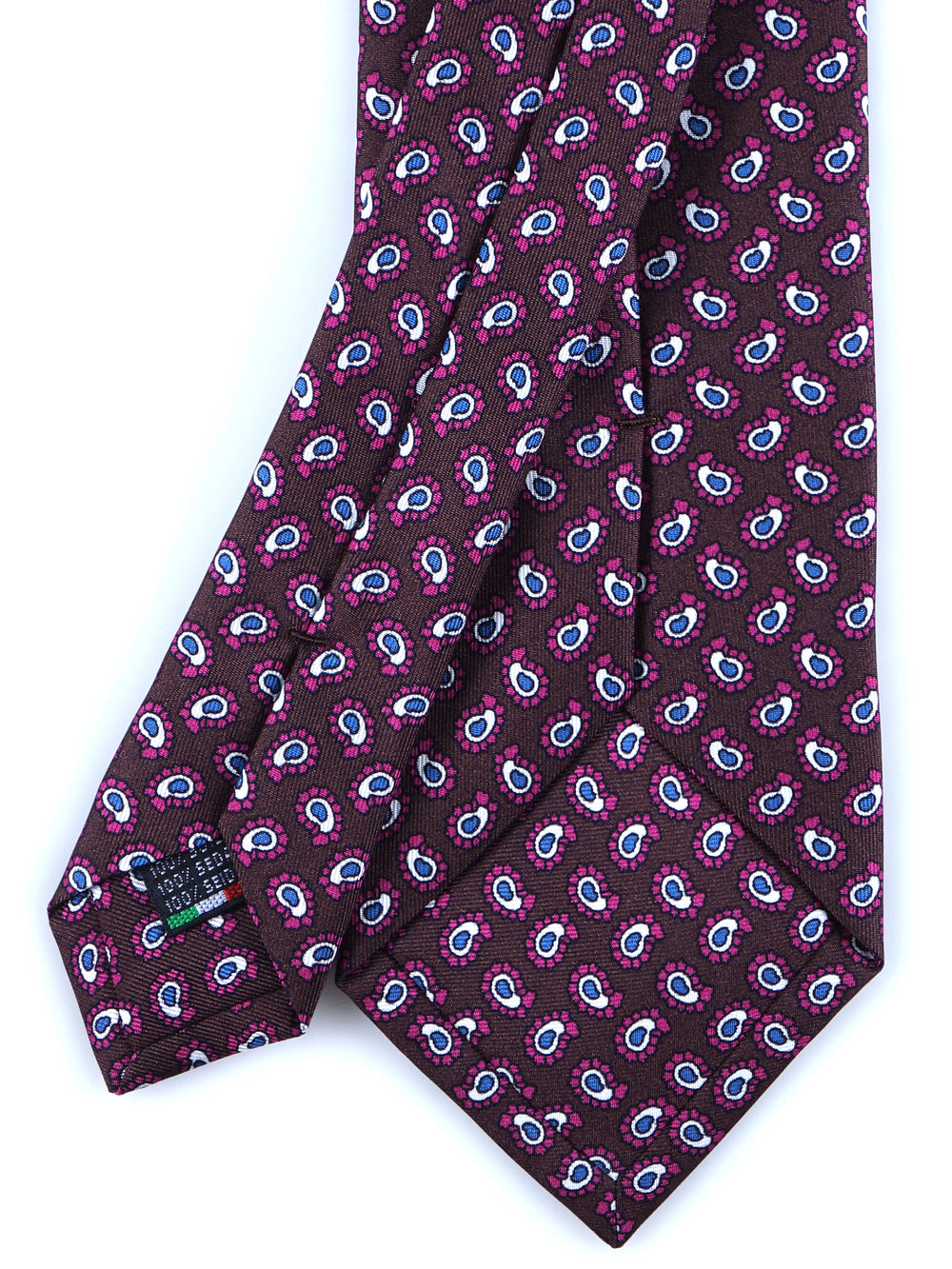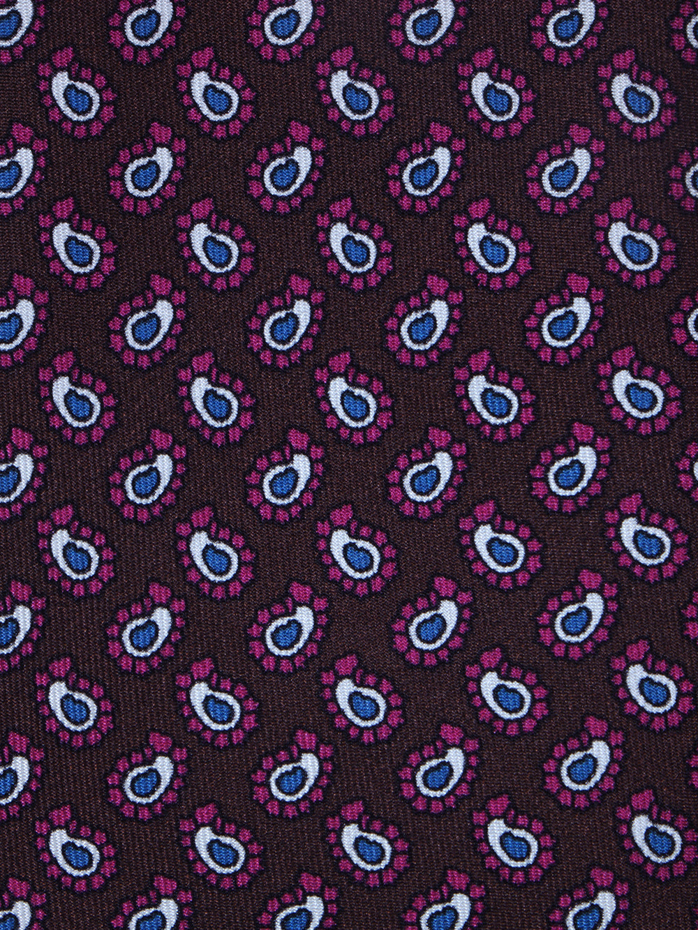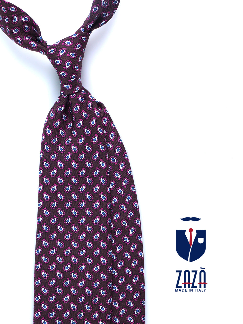 Questa cravatta è un'ode alla stagione autunnale, un pezzo chiave della collezione ZAZÀ per l'uomo che ama i colori caldi e gli abbinamenti ricercati. Su un fondo marrone terracotta, che ricorda le sfumature del cuoio e del foliage, fiorisce una fantasia che dialoga con note vibranti di blu e corallo. Realizzata in una preziosa saia di seta, è un accessorio che da solo può definire un intero outfit, portando calore e carattere.