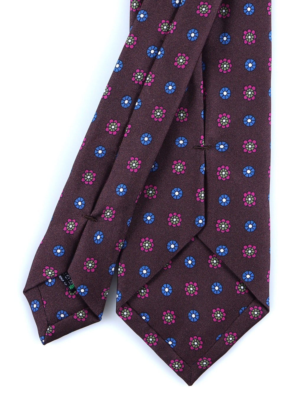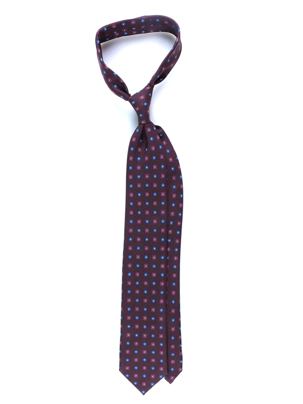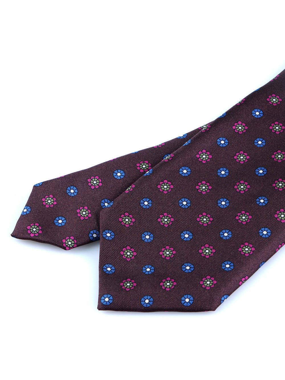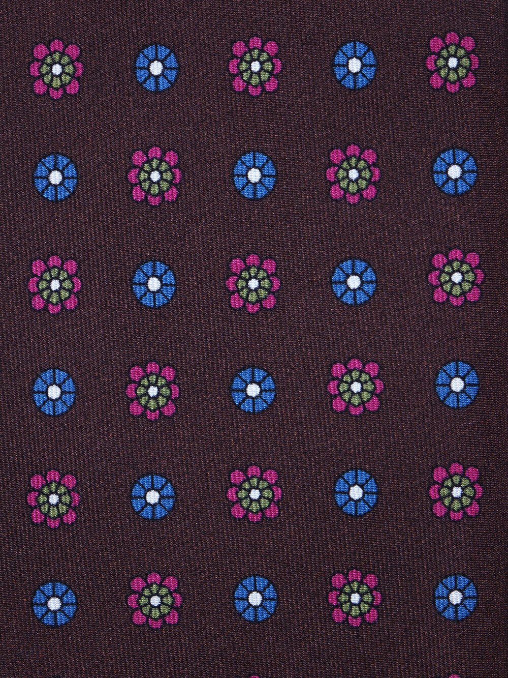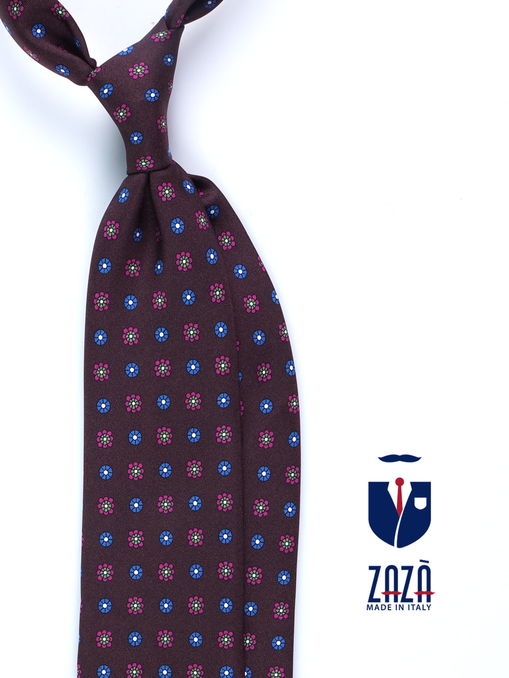 Un accessorio di grande personalità per l'uomo che non teme il colore e lo utilizza come strumento di stile. Questa cravatta ZAZÀ, realizzata in pregiata seta stampata, si distingue per la sua base in un profondo e ricco marrone/bordeaux scuro. Su questa tela classica fiorisce un dialogo cromatico inaspettato e di grande raffinatezza, con un micro-motivo floreale che unisce la vivacità del blu royal, la delicatezza del rosa e un tocco di verde. È un pezzo che cattura lo sguardo con cultura, perfetto per chi vuole definire il proprio stile con un dettaglio unico e Made in Italy.