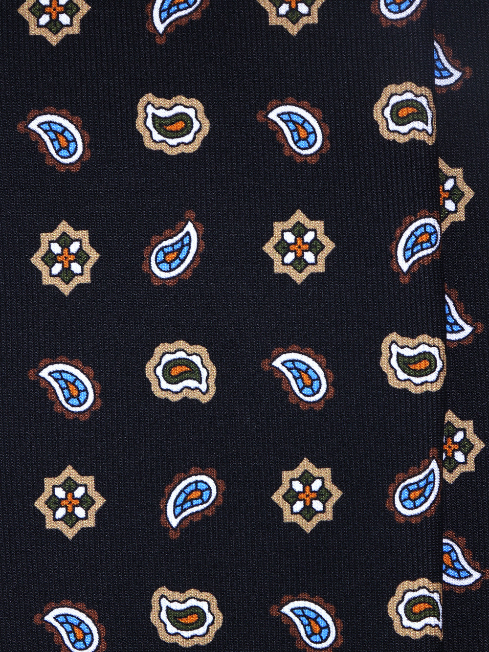 Questa cravatta è un pilastro della collezione Autunno/Inverno, un accessorio di un'intelligenza stilistica superiore. Su un fondo blu navy classico e autorevole, fiorisce una fantasia ricca di dettagli cromatici: il calore del marrone e dell'ocra si unisce alla freschezza dell'azzurro. Realizzata in pregiata seta inglese, questa cravatta è un "falso unito" che da lontano appare formale, ma da vicino rivela un carattere versatile, capace di legare gli elementi più disparati del tuo guardaroba.