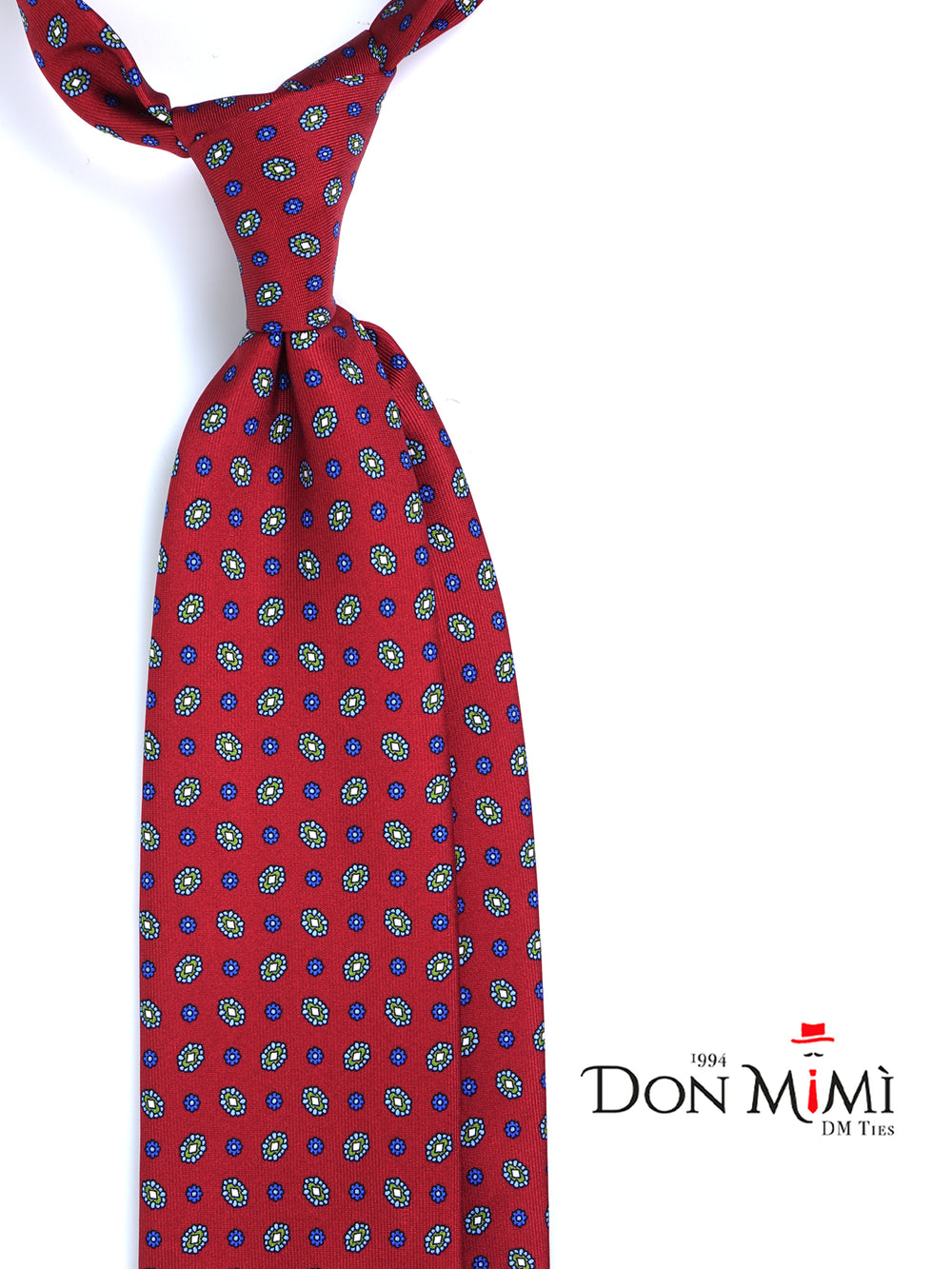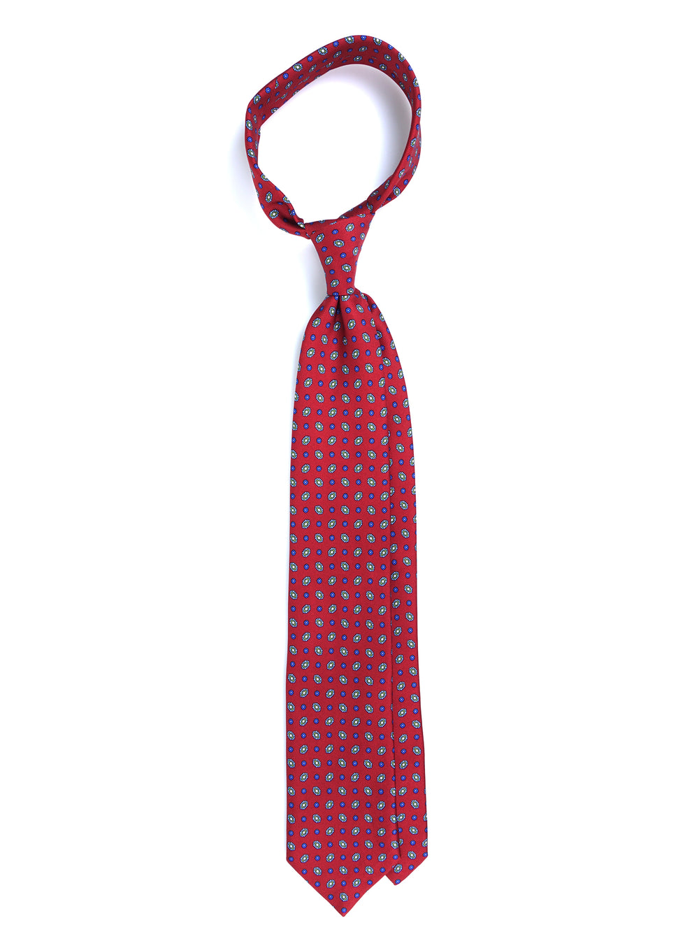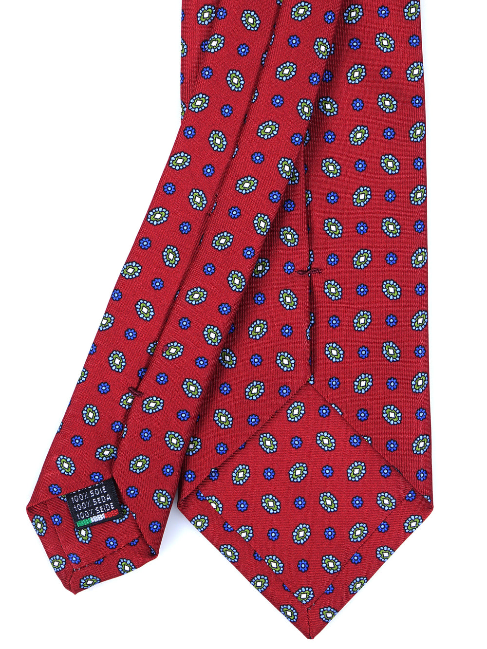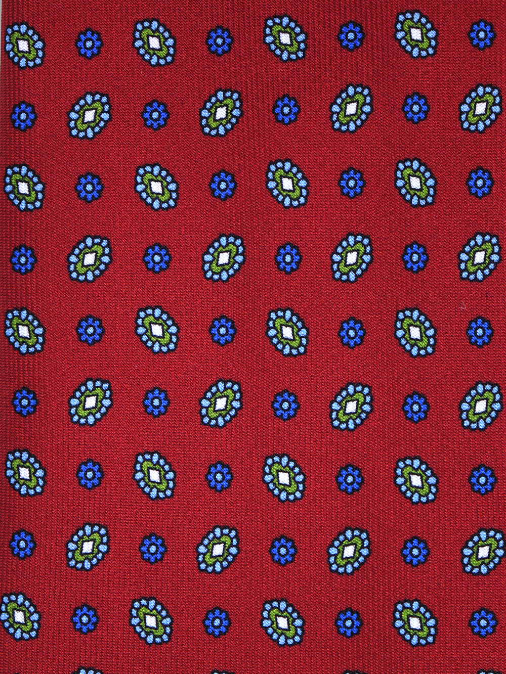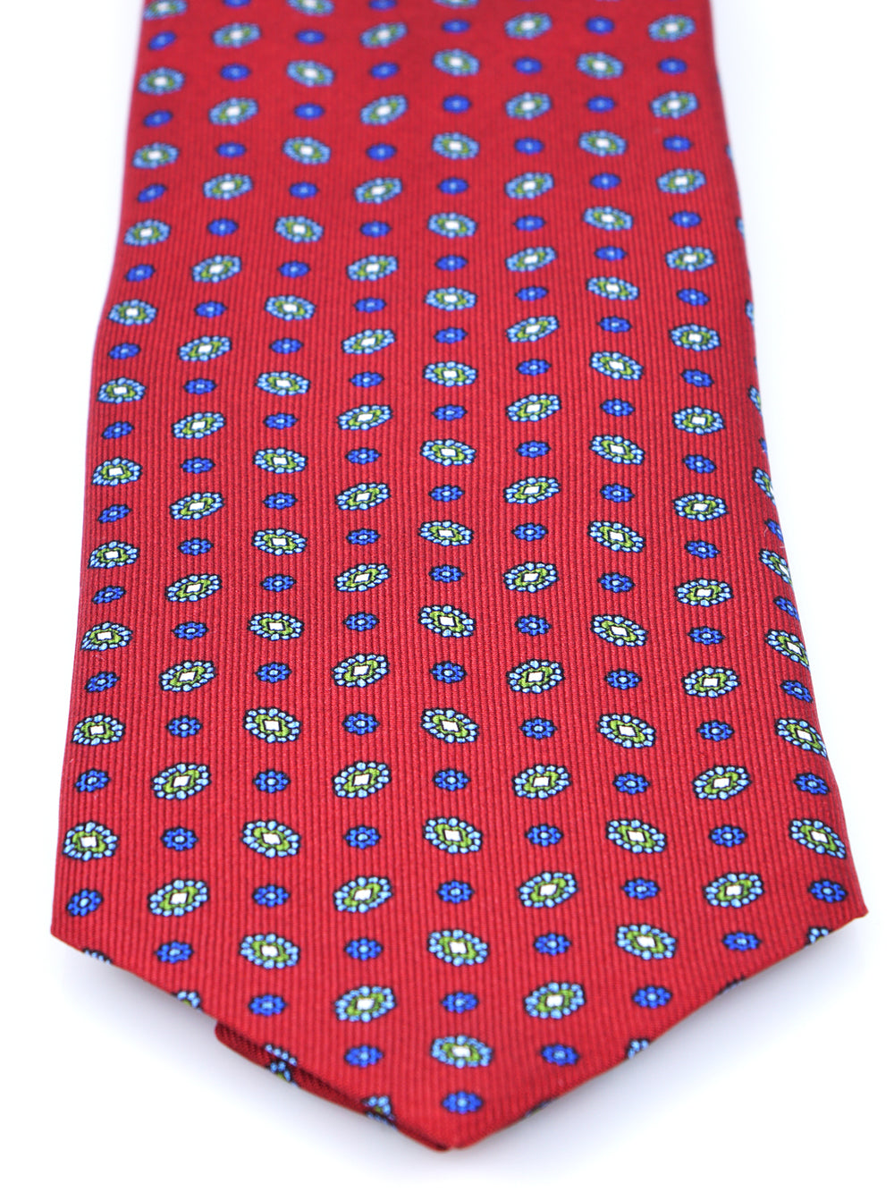 Questa cravatta in seta inglese stampata rossa con micro fantasia ovale verde e blu è pensata per l’uomo che vuole distinguersi con classe e personalità. Un mix perfetto di tradizione sartoriale e stile moderno.