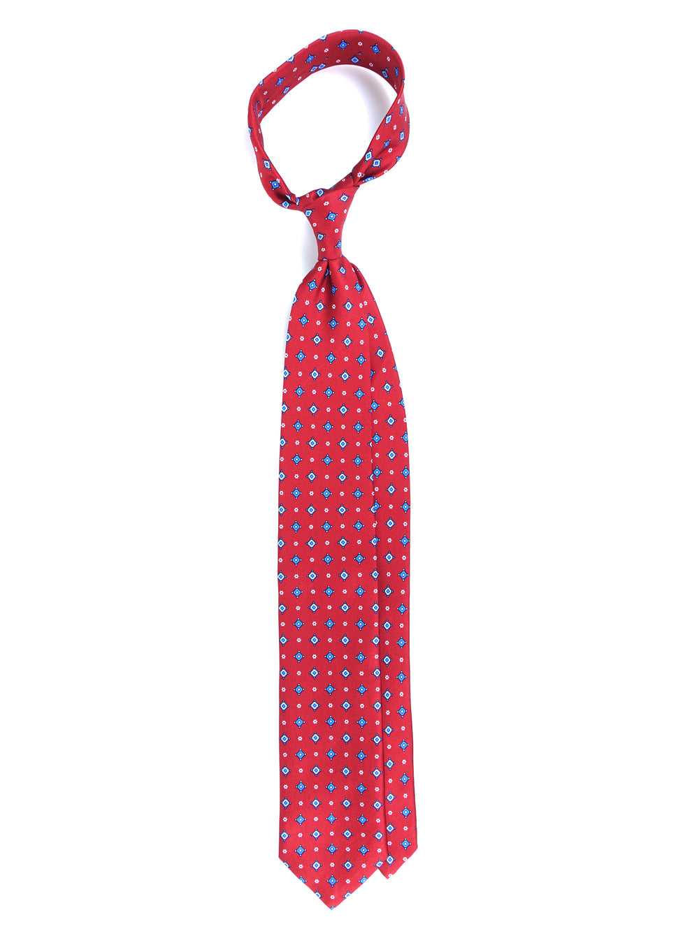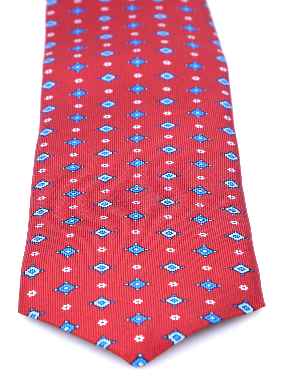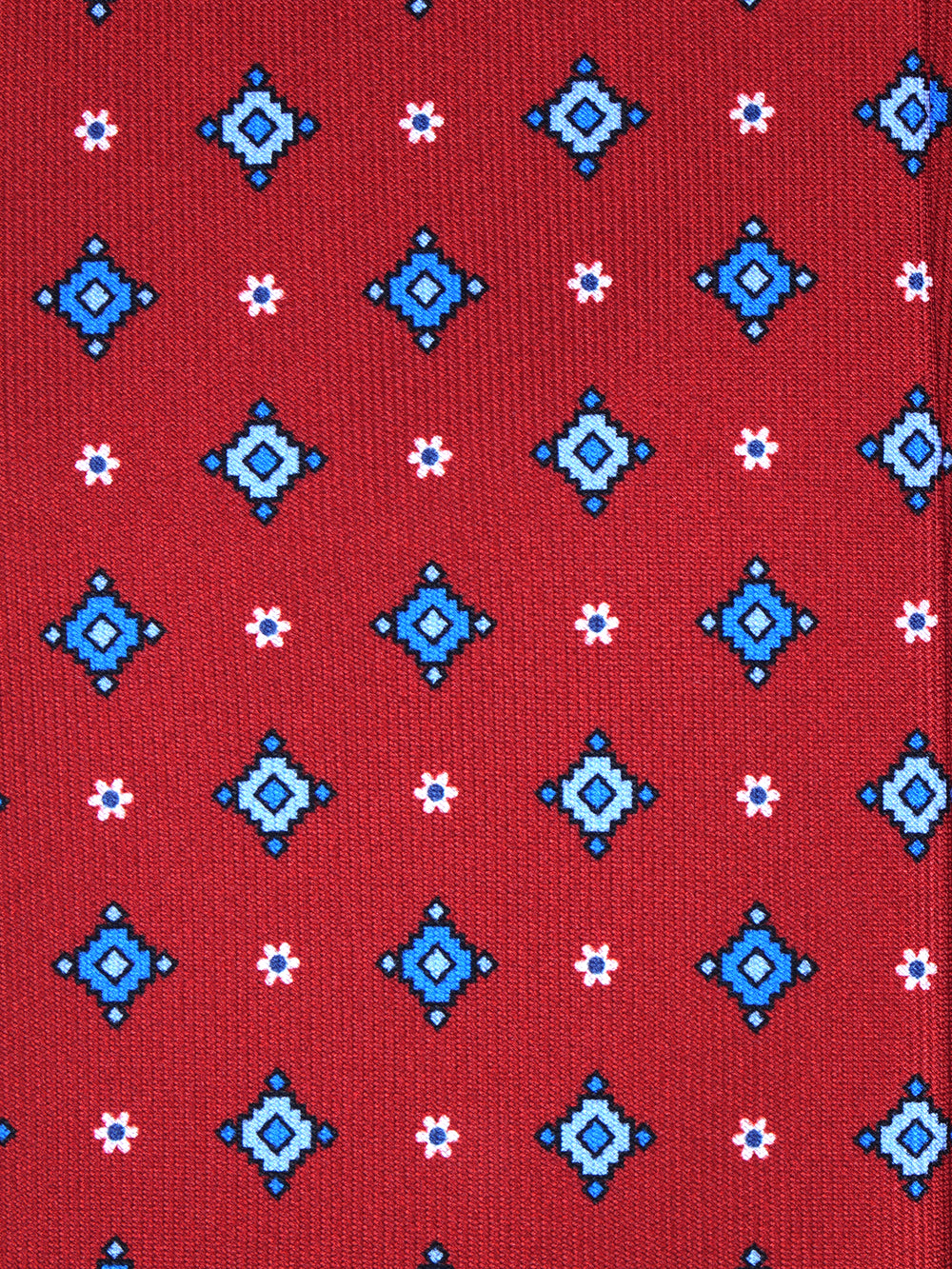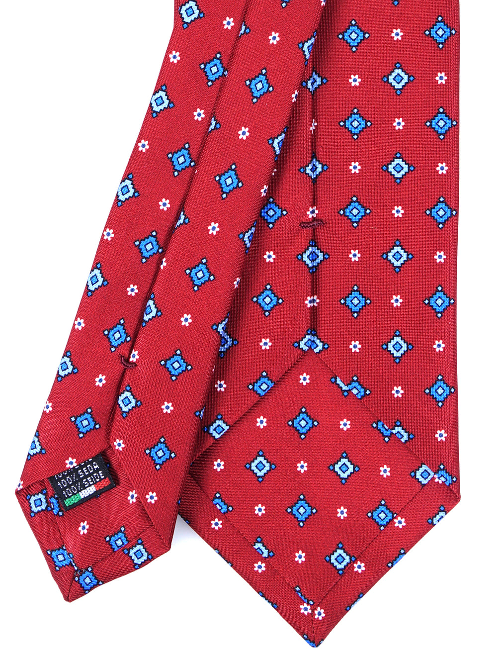 Questa cravatta in seta inglese stampata rossa, arricchita da un raffinato motivo geometrico azzurro, è l’accessorio perfetto per chi desidera distinguersi con stile. Un equilibrio perfetto tra tradizione e modernità, realizzata a mano in Italia.