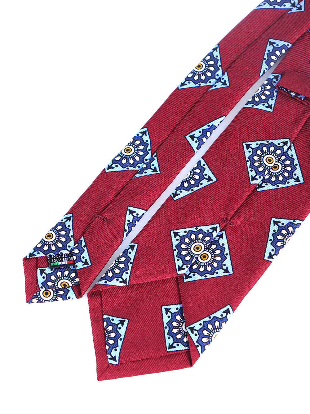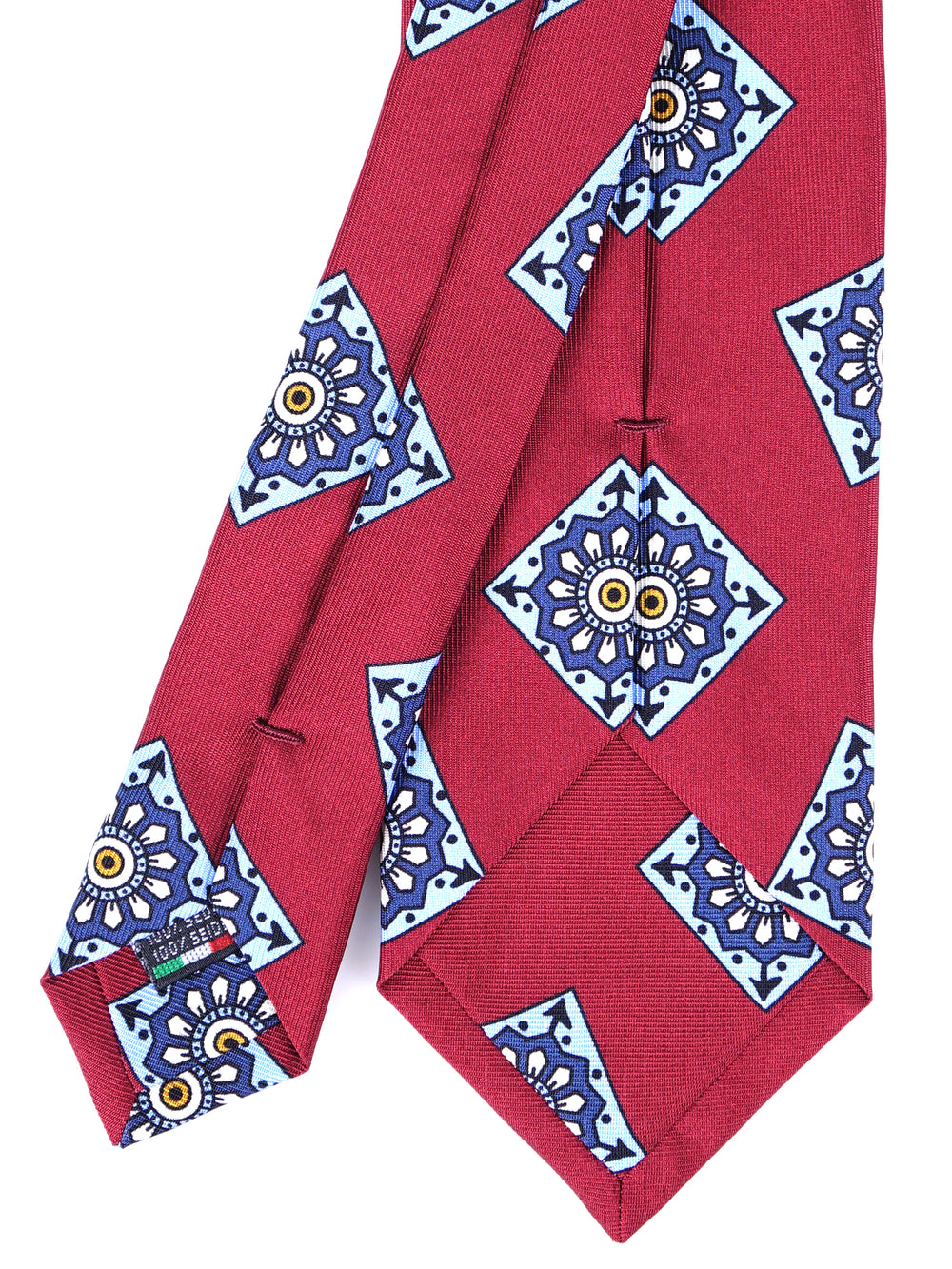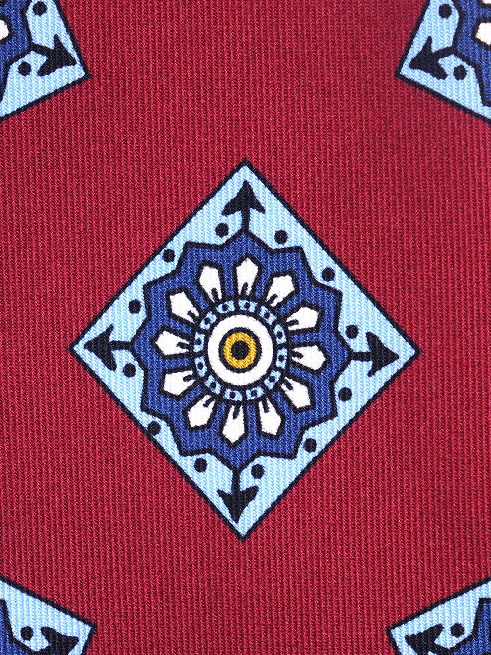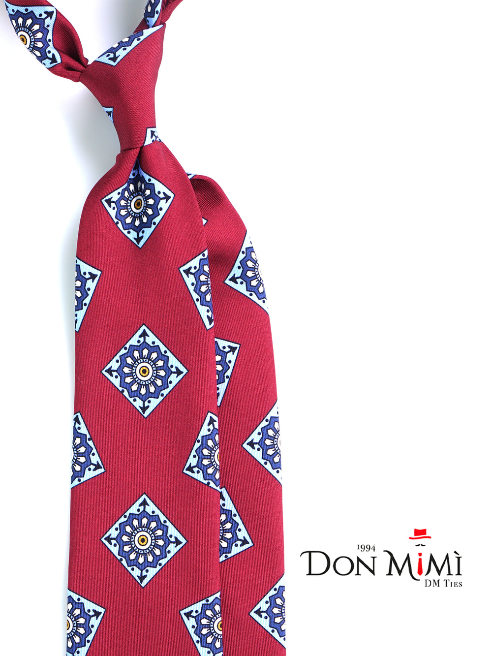 Un pezzo di grande impatto visivo, questa cravatta Don Mimì celebra l'incontro tra la tradizione sartoriale e l'ispirazione mediterranea. È realizzata in pregiata seta stampata inglese, un tessuto dalla mano liscia e dalla lucentezza discreta che garantisce un drappeggio perfetto. Il design si distingue per un maxi-motivo a medaglione che ricorda le antiche maioliche, dove il calore di un profondo rosso rubino si sposa con la freschezza delle diverse tonalità di azzurro e blu. È un accessorio per l'uomo che vuole affermare il proprio stile con un pezzo unico e di carattere.