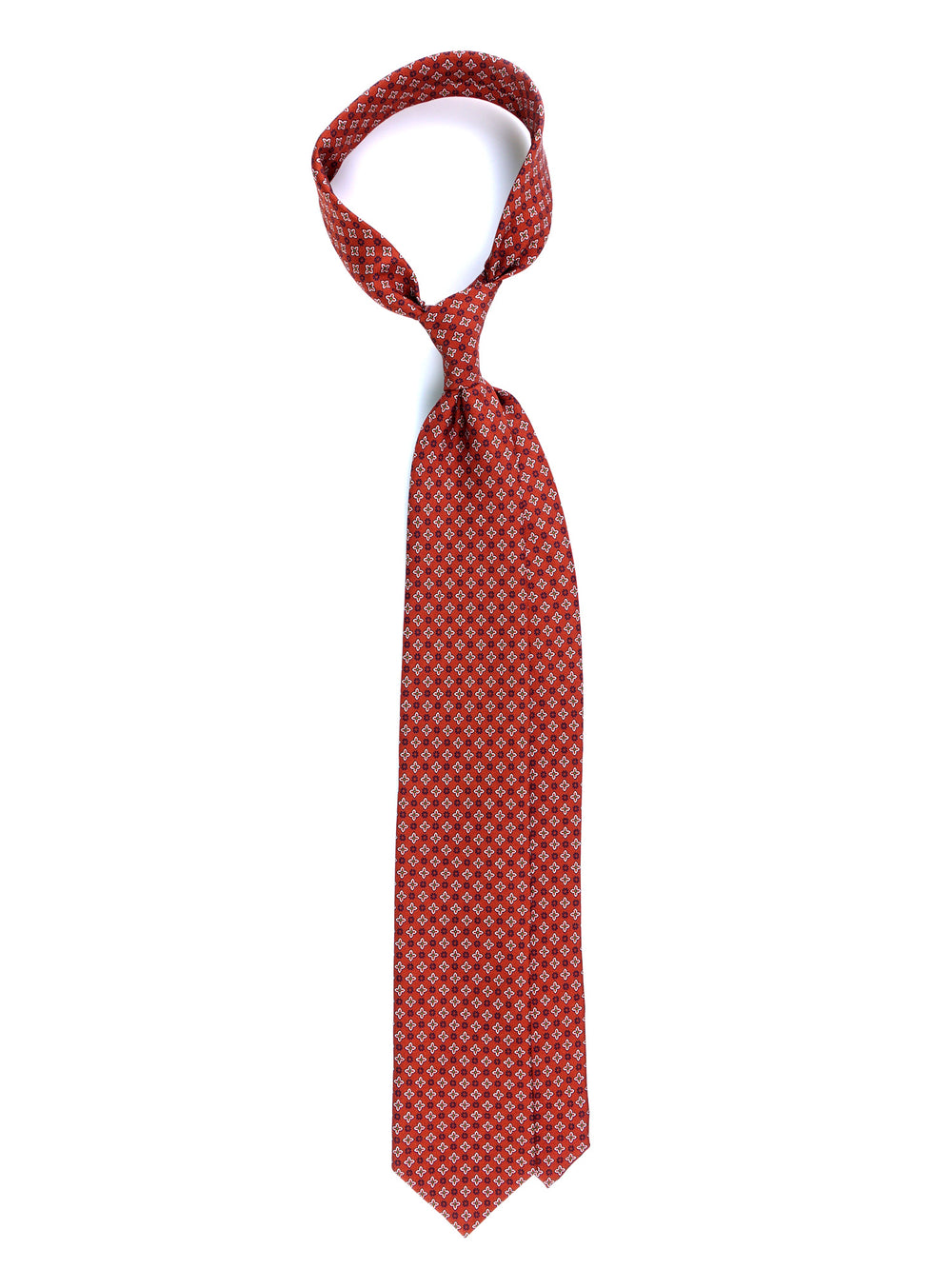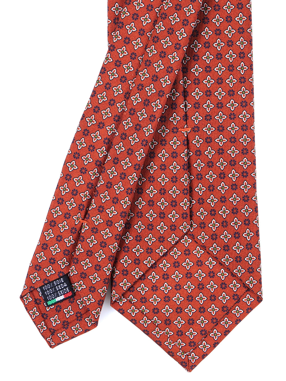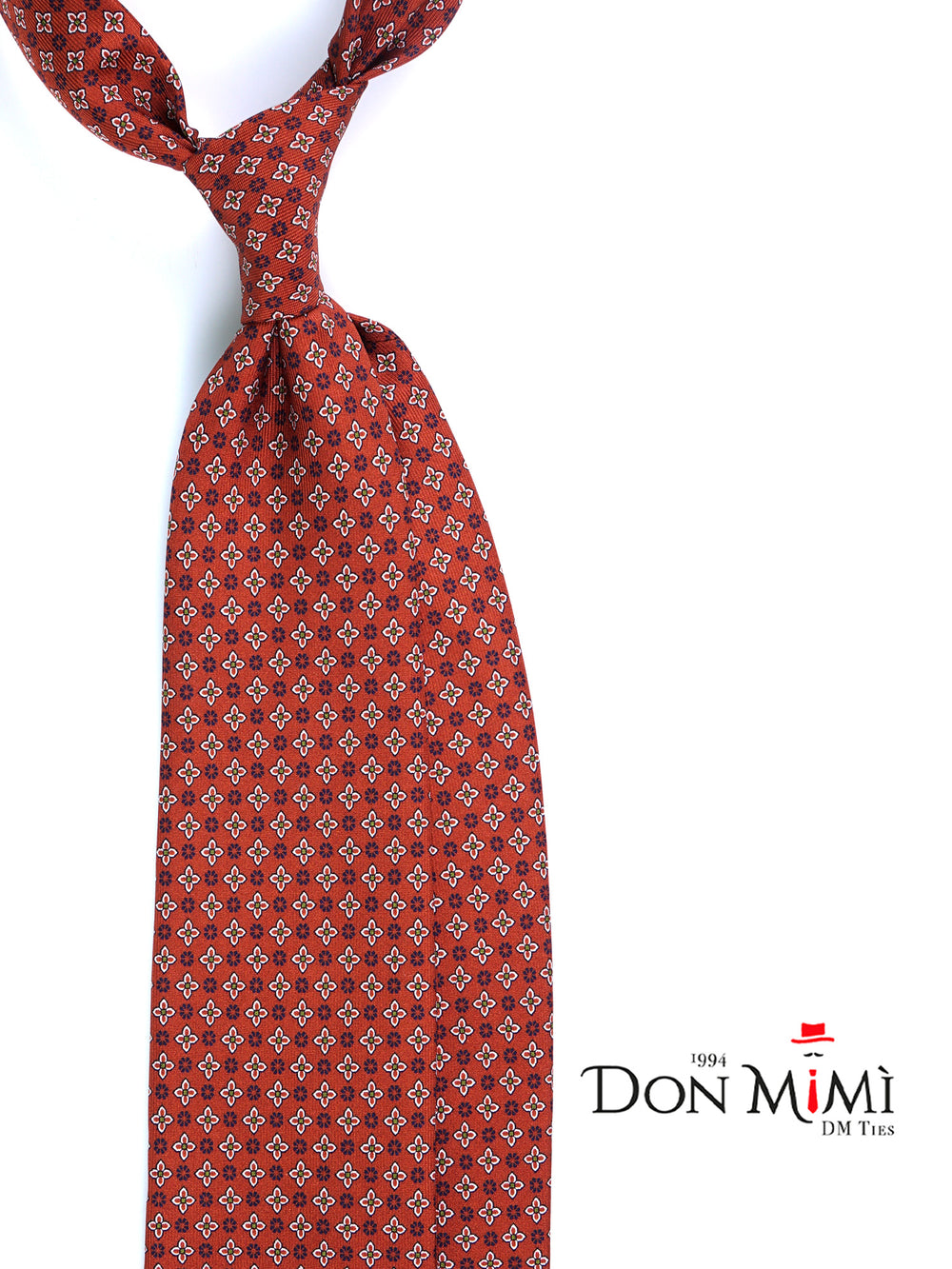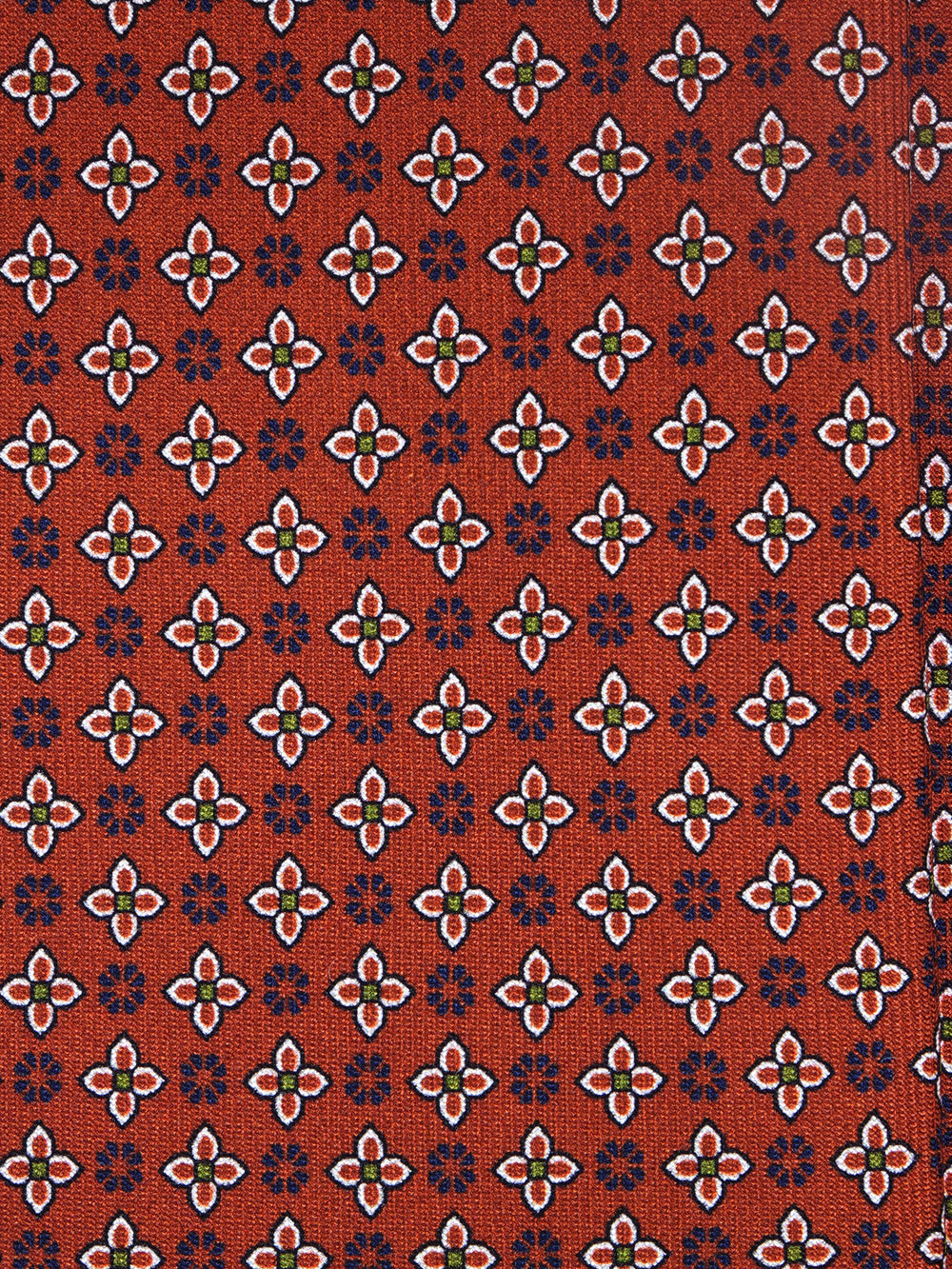 Questa cravatta è la quintessenza dello stile autunnale. È un pezzo caldo e avvolgente, il cui colore protagonista è un ricco Terracotta, che ricorda le sfumature della terra e del foliage. Realizzata in pregiata seta inglese, la sua stampa garantisce una purezza cromatica eccezionale, mentre la trama in saia di seta le conferisce corpo e una mano impeccabile. È l'accessorio perfetto per l'uomo che vuole portare un tocco di calore e di carattere nel suo guardaroba invernale.