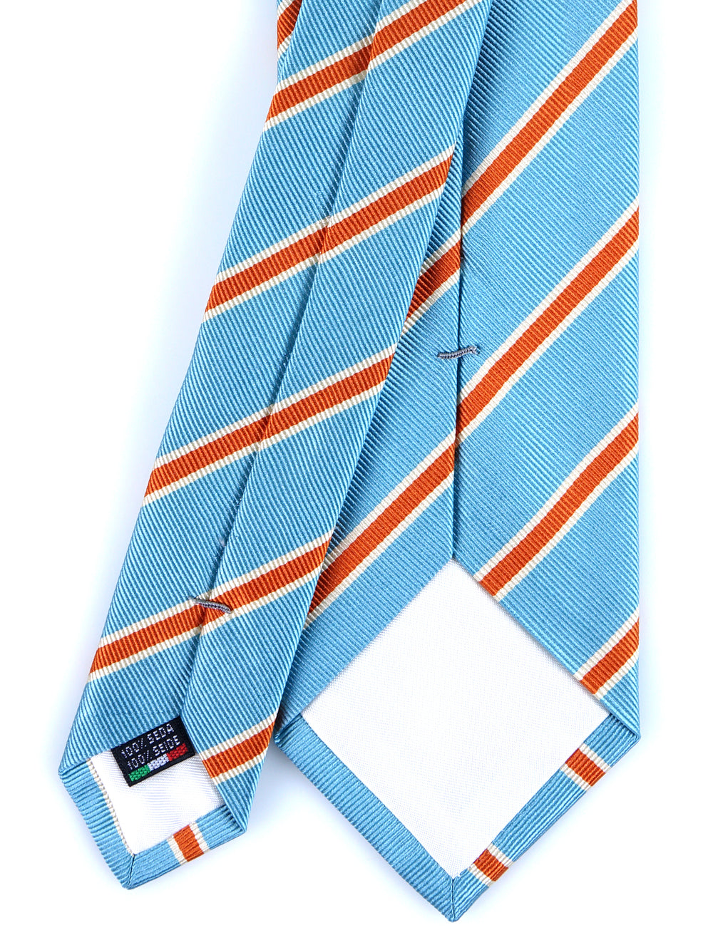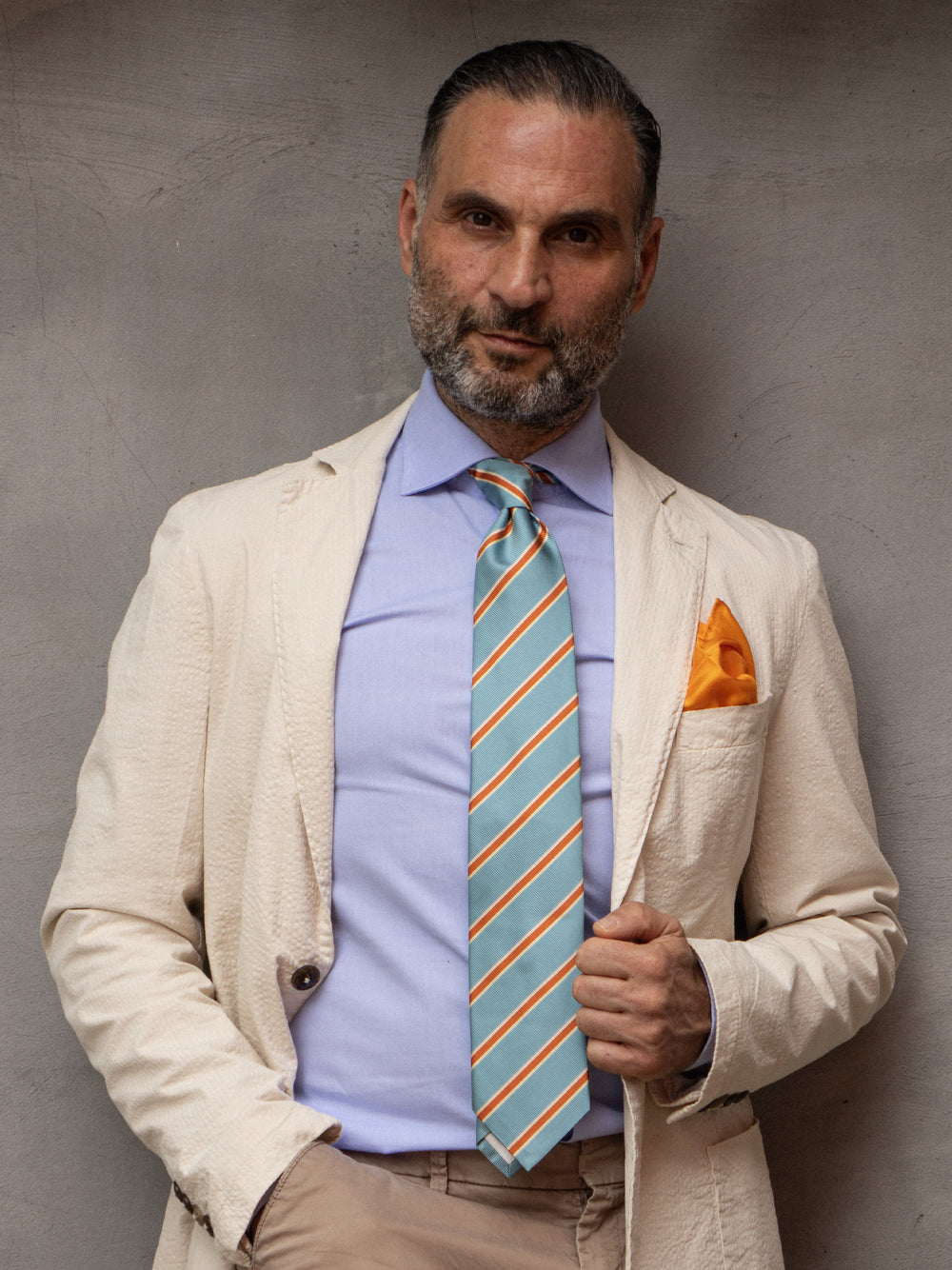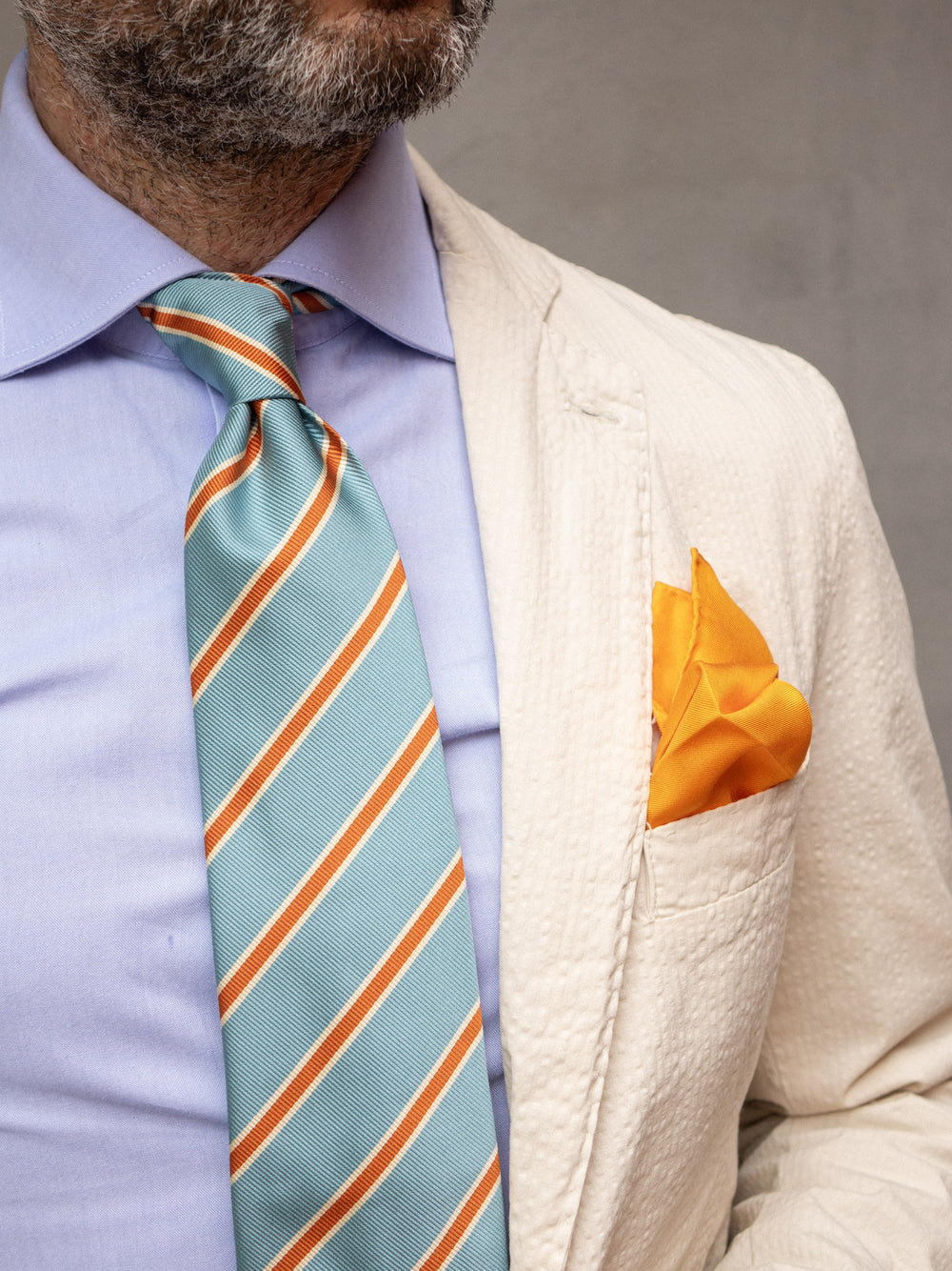 Questa cravatta regimental in jacquard è un accessorio che interpreta la classicità con energia e freschezza, perfetta per l’uomo che ama distinguersi con gusto.