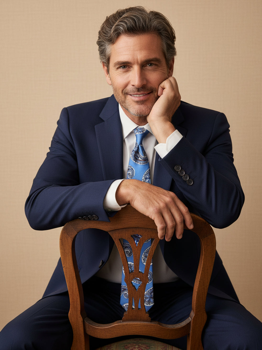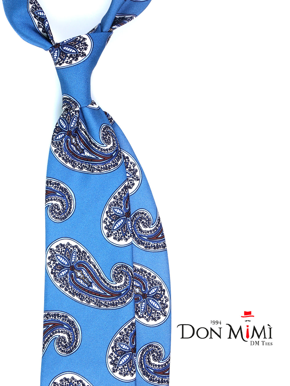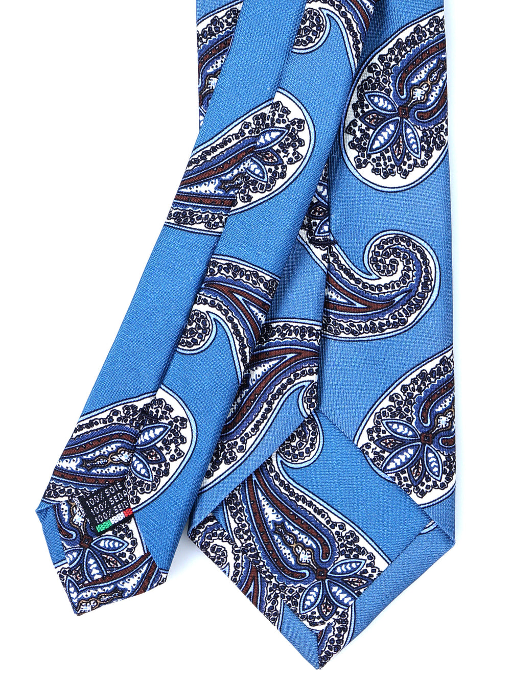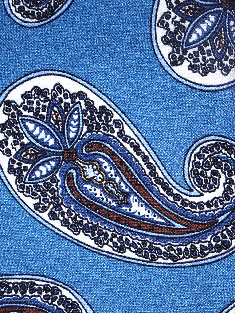 Questa non è una cravatta, è una dichiarazione di stile. Pezzo forte della collezione Autunno/Inverno, celebra uno dei disegni più iconici del guardaroba maschile, il Paisley, qui interpretato in una versione maxi di grande impatto. Su un fondo azzurro vibrante e luminoso, esplode una ricca palette di blu e marrone. Realizzata in pregiata seta inglese, questa cravatta è pensata per l'uomo che ama gli accessori protagonisti, capaci di raccontare una storia di cultura e di gusto.