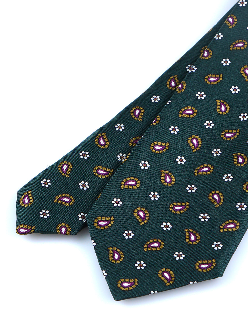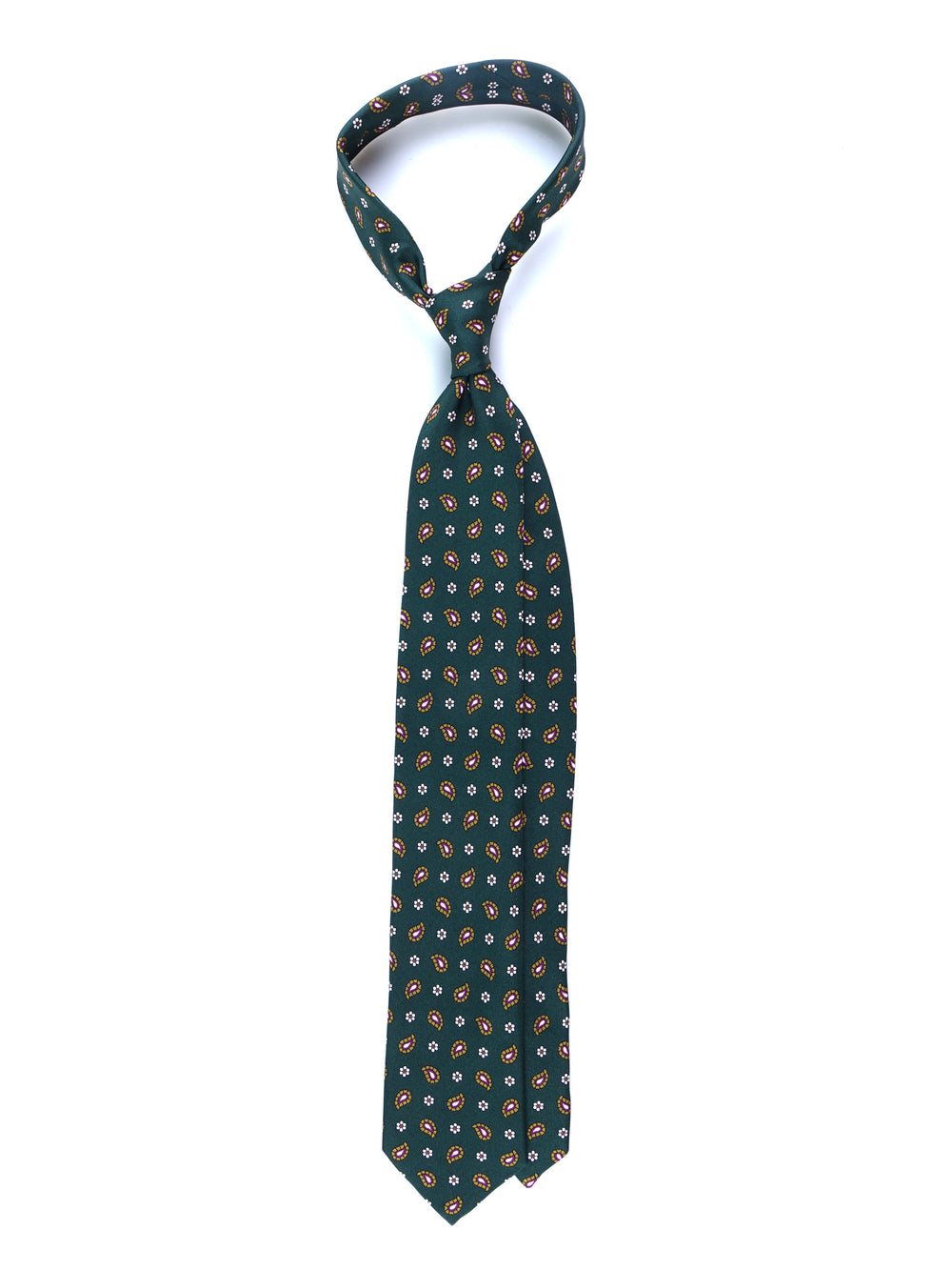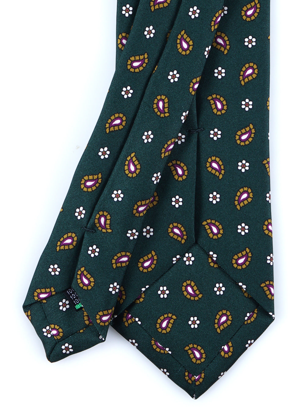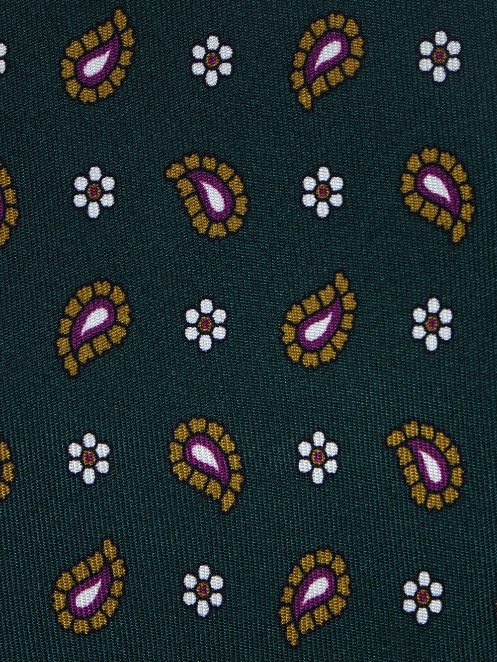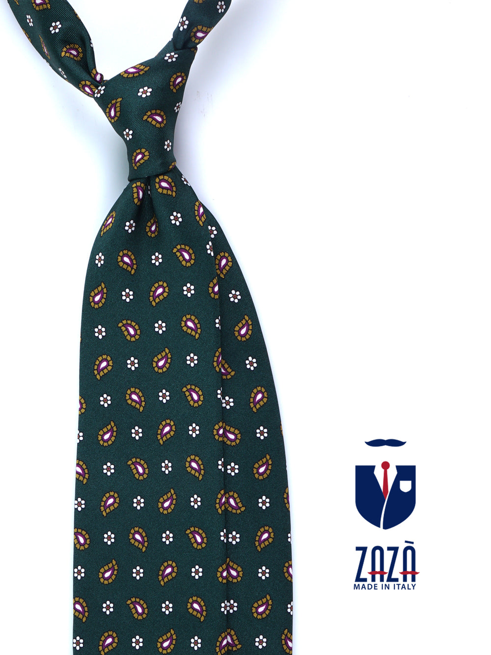 Un accessorio che parla di eleganza colta e non convenzionale, questa cravatta ZAZÀ è un pezzo per veri intenditori. Realizzata in pregiata seta stampata, si distingue per la sua base in un profondo verde bosco, colore che evoca la tradizione del country inglese. Su questa tela si sviluppa un raffinato micro-disegno che alterna un cachemire stilizzato, con dettagli oro e magenta, a piccoli fiori bianchi. È la cravatta per l'uomo che apprezza un'eleganza che si distingue per cultura e personalità, firmata ZAZÀ Made in Italy.