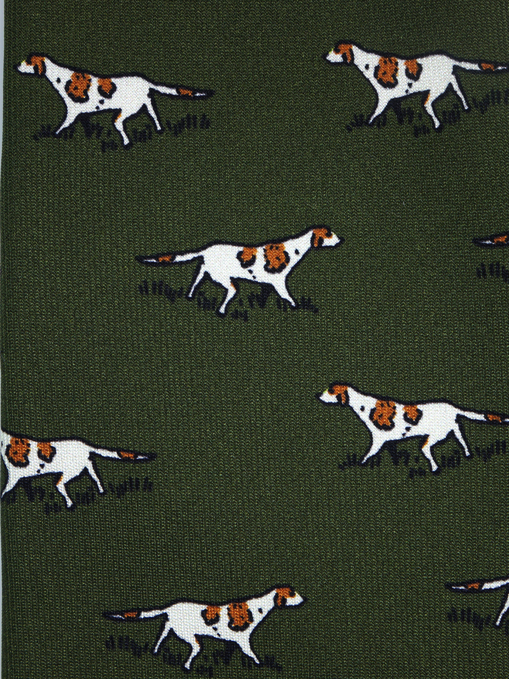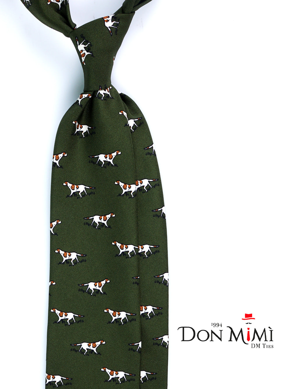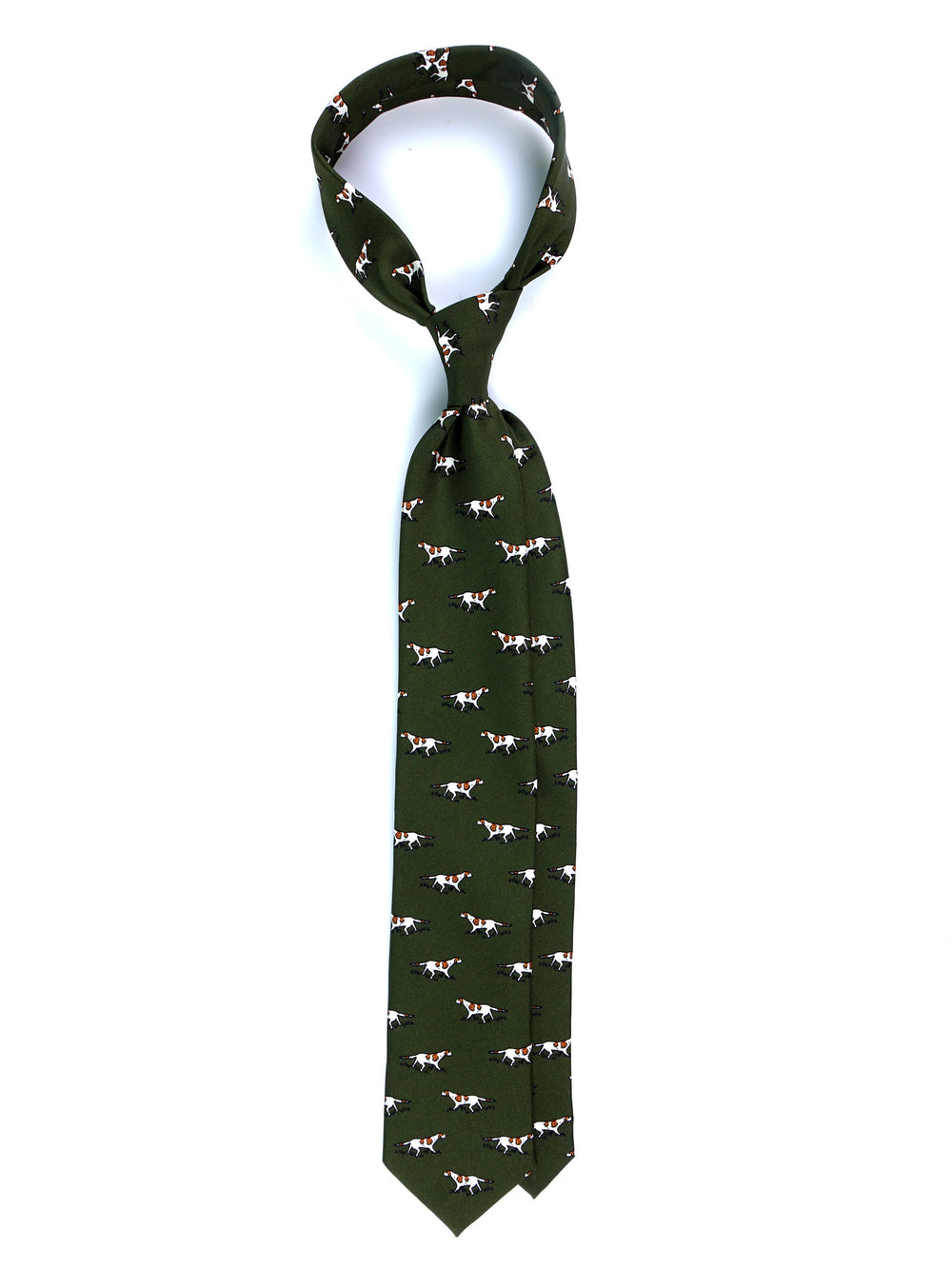 Questa cravatta è un'ode alla grande tradizione dello stile inglese, un pezzo forte della collezione Autunno/Inverno per l'uomo che ama l'eleganza che racconta una storia. Su un fondo verde bosco, classico e profondo, si staglia un elegante cane da caccia, un disegno iconico delle "sporting ties". Realizzata in pregiata seta inglese, questa cravatta non è solo un accessorio, ma un simbolo di appartenenza a un mondo fatto di passioni, natura e amore per la tradizione.