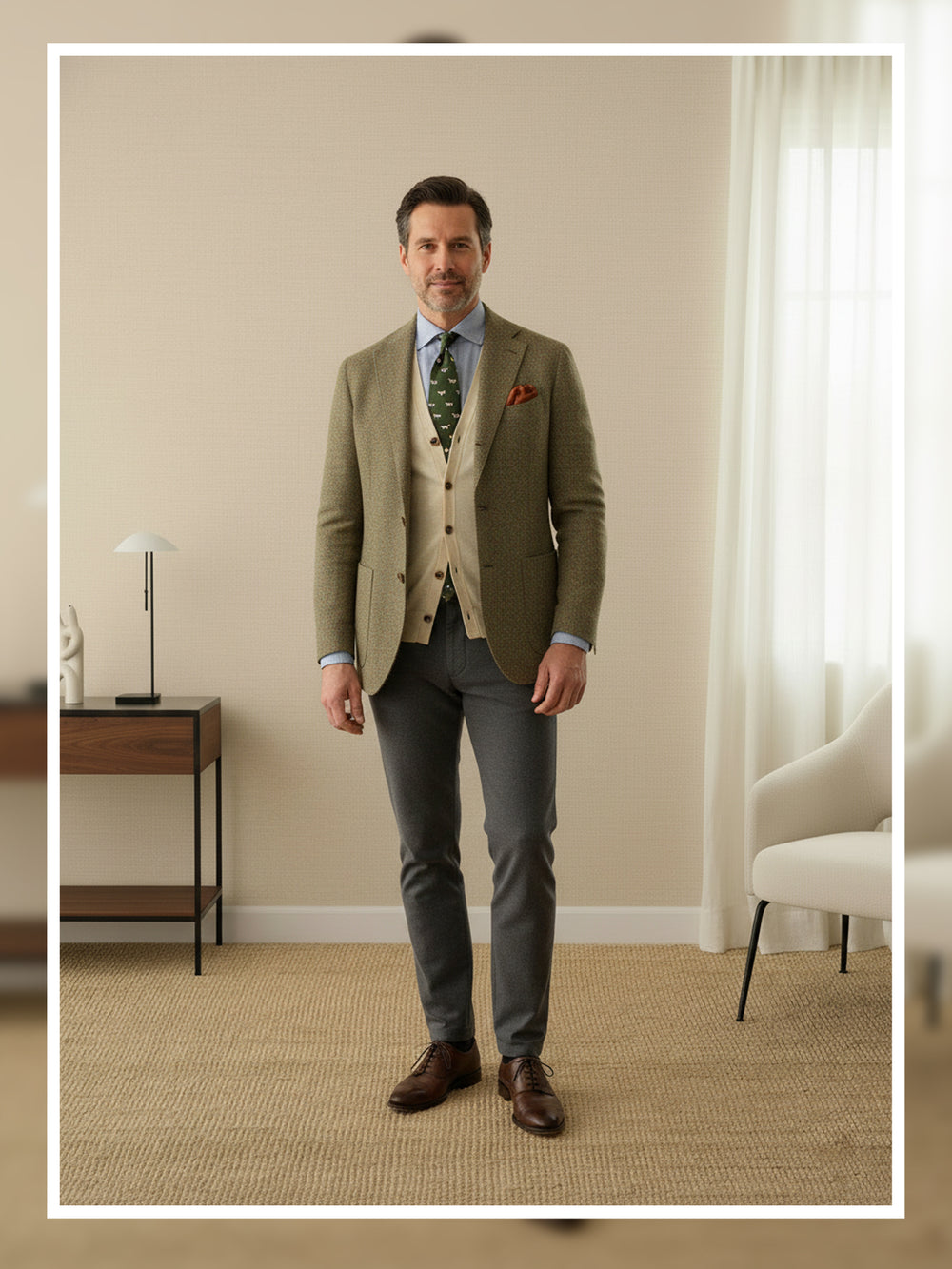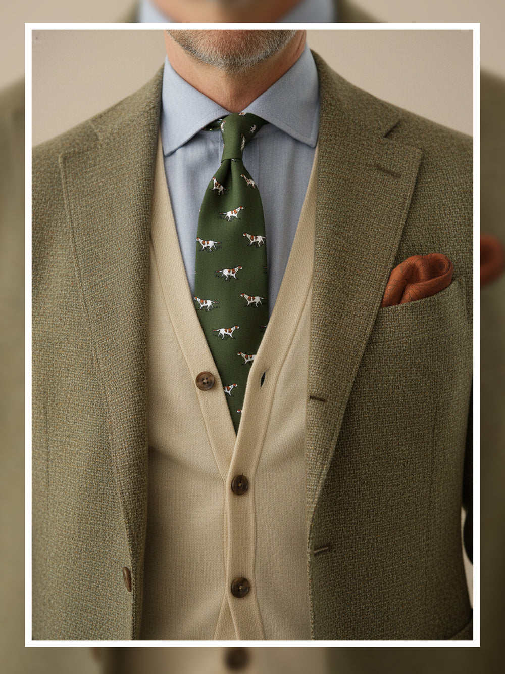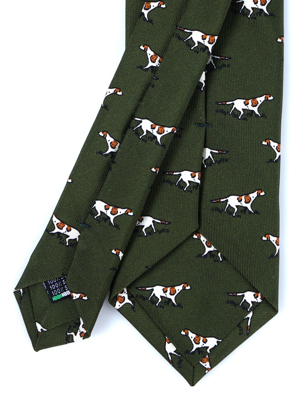 Questa cravatta è un'ode alla grande tradizione dello stile inglese, un pezzo forte della collezione Autunno/Inverno per l'uomo che ama l'eleganza che racconta una storia. Su un fondo verde bosco, classico e profondo, si staglia un elegante cane da caccia, un disegno iconico delle "sporting ties". Realizzata in pregiata seta inglese, questa cravatta non è solo un accessorio, ma un simbolo di appartenenza a un mondo fatto di passioni, natura e amore per la tradizione.