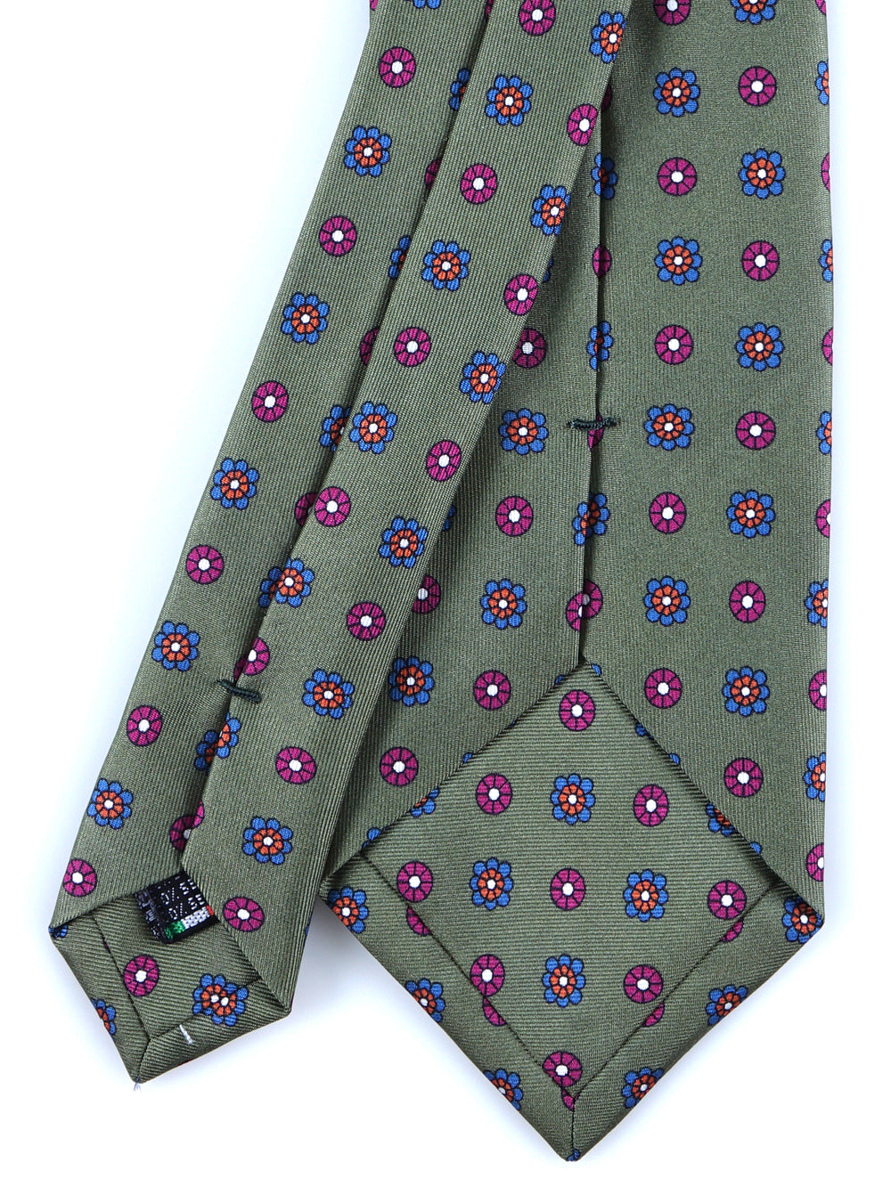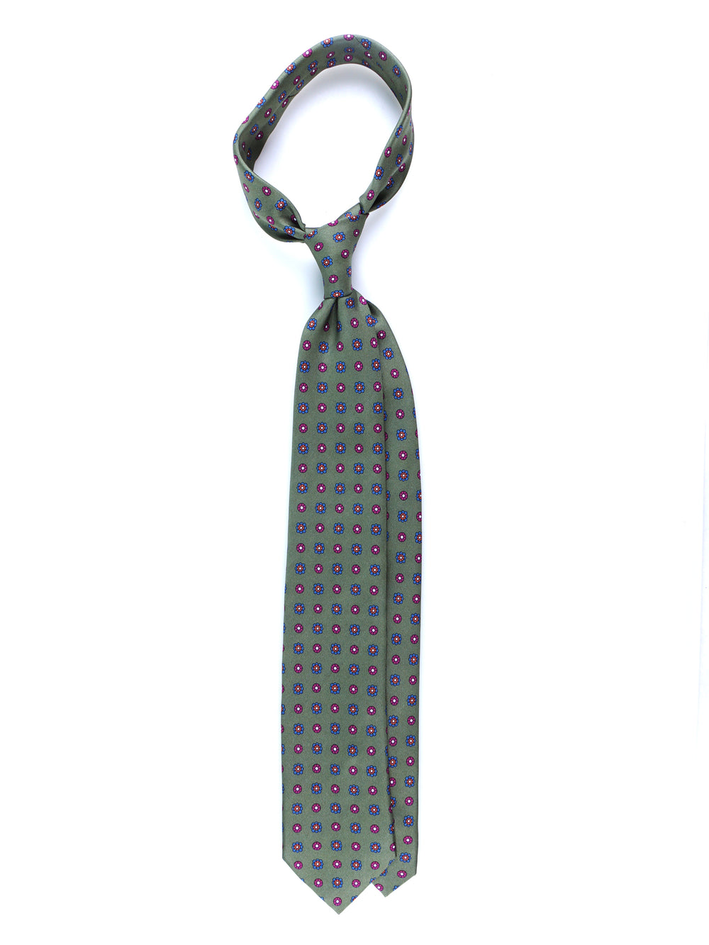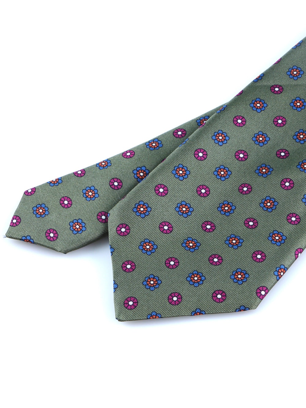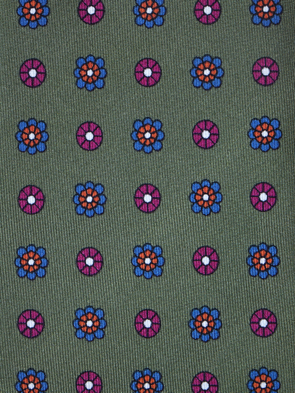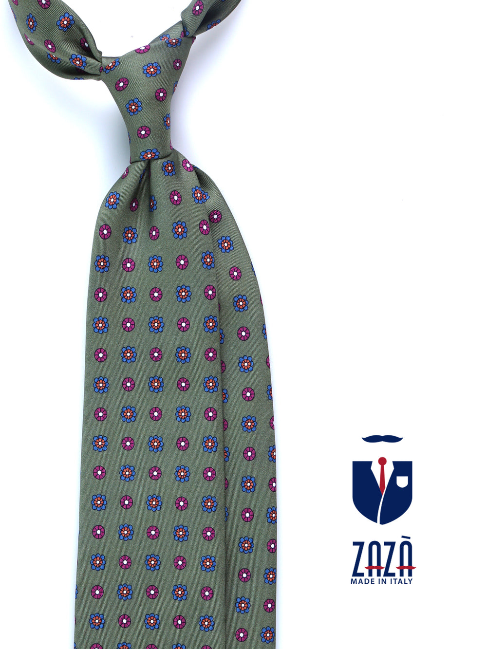 Un accessorio per l'uomo che apprezza i colori e li sa usare con maestria. Questa cravatta ZAZÀ, realizzata in pregiata seta stampata, si distingue per la sua base in un sofisticato verde salvia, una tela che fa da sfondo a un dialogo cromatico vivace e di grande gusto. Il micro-motivo floreale unisce il blu royal, l'arancio e un audace tocco di magenta, creando un pezzo che esprime una personalità sicura e un'eleganza non convenzionale, firmata ZAZÀ Made in Italy.
