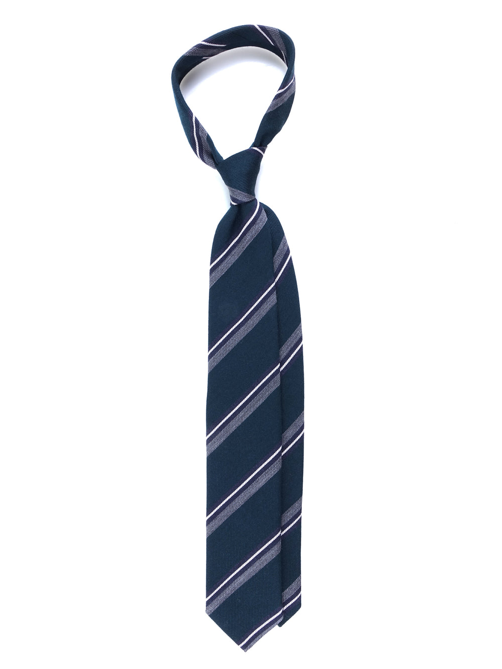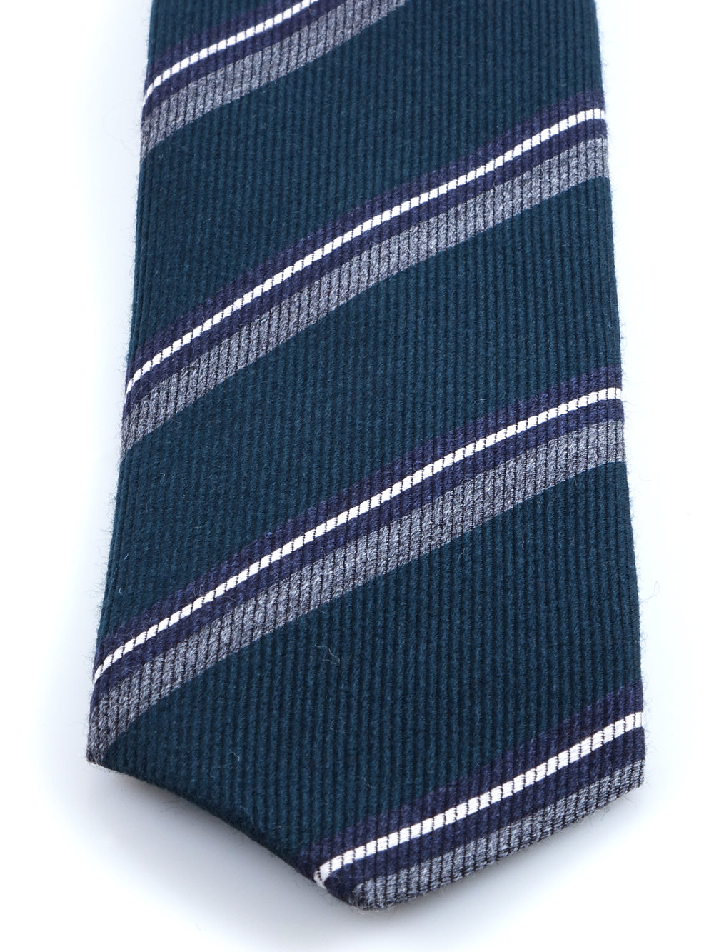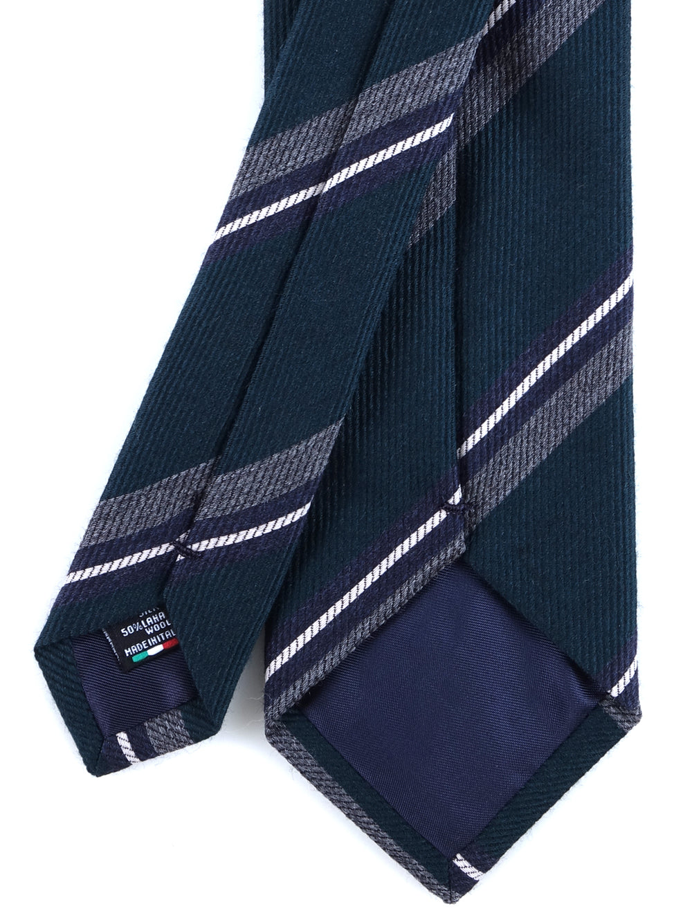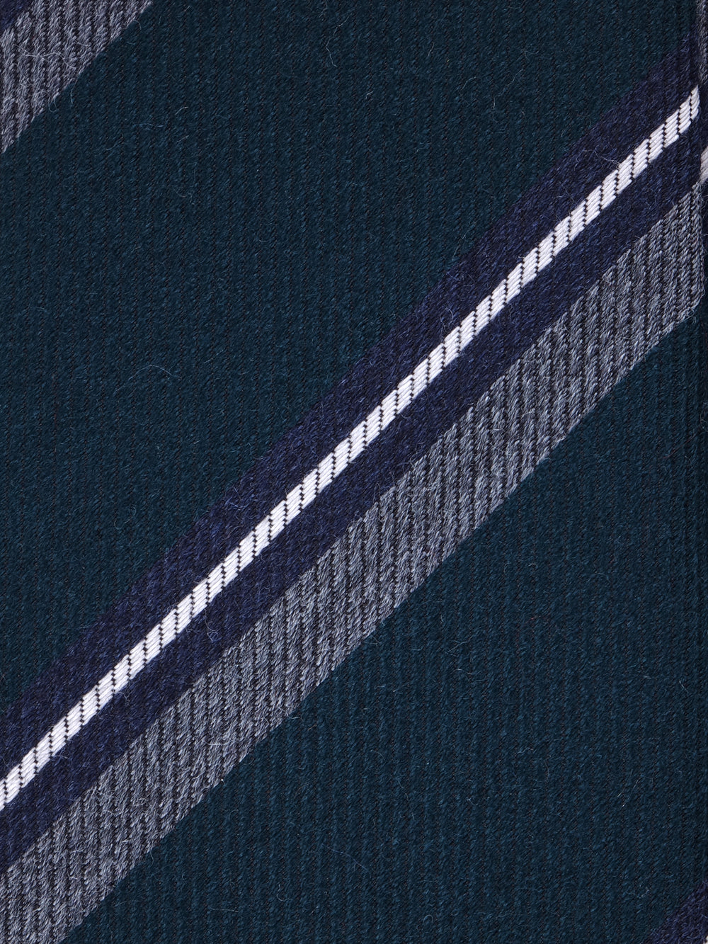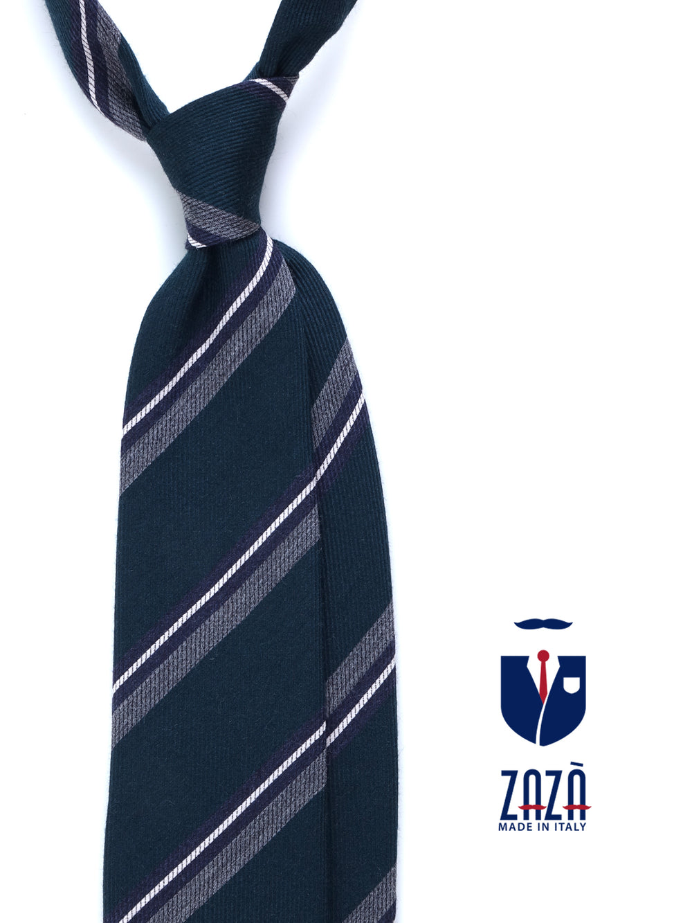 Direttamente dalla collezione Autunno/Inverno ZAZÀ, questa cravatta è un tributo all'eleganza materica e ai colori della natura. Il blend di lana e seta crea un equilibrio perfetto: la lana conferisce corpo, una mano calda e una profondità cromatica opaca, mentre la seta aggiunge un riflesso discreto e una fluidità impeccabile. La base, un sofisticato verde foresta, evoca i paesaggi del country inglese ed è la tela ideale per le righe a contrasto in grigio mélange, blu notte e bianco, che donano un tocco di dinamismo grafico. È l'accessorio per l'uomo che cerca un'eleganza non scontata, radicata nella tradizione ma con un'anima contemporanea.