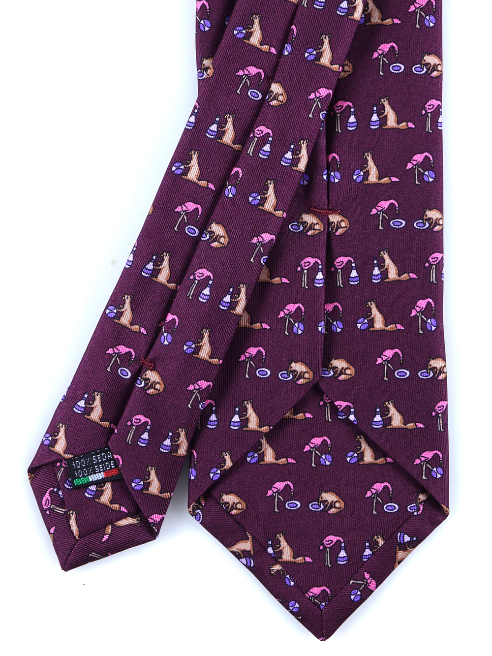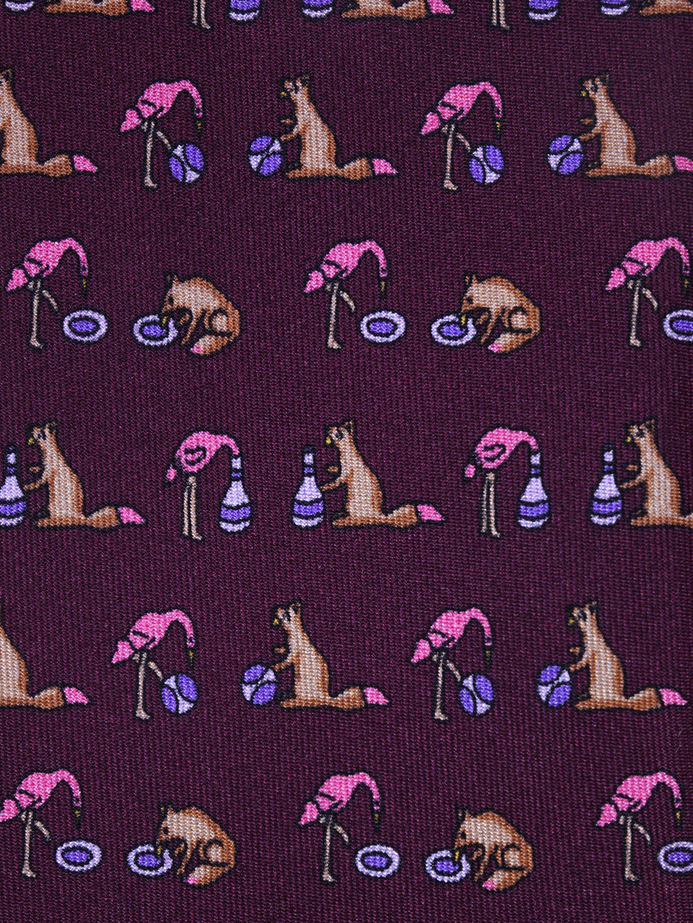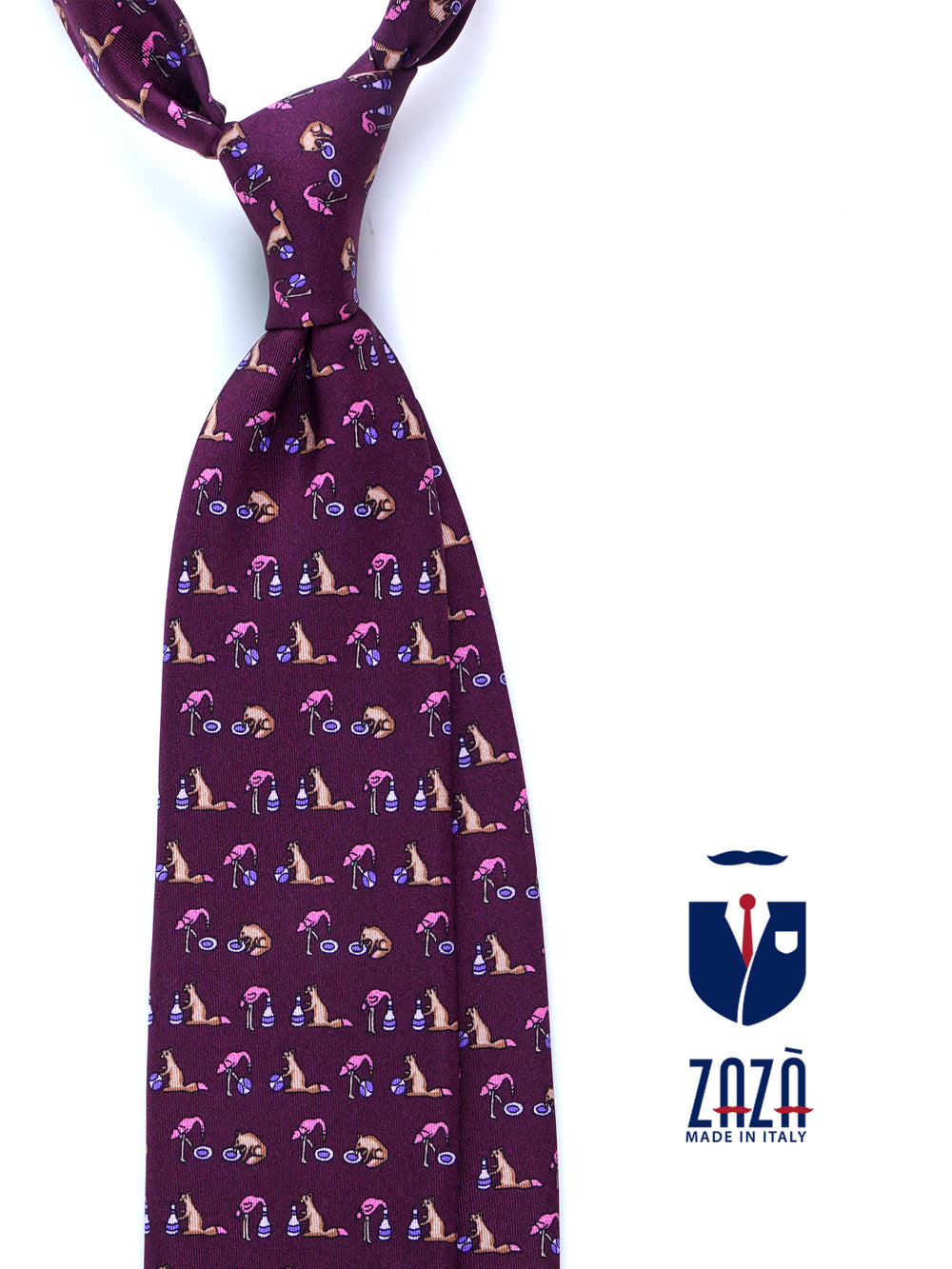 Un tocco di ironia e di colore per definire il guardaroba della stagione fredda. Questa cravatta "conversazionale" della collezione Autunno/Inverno ZAZÀ è un accessorio per l'uomo con senso dell'umorismo, che non rinuncia mai alla qualità. Realizzata in pregiata seta stampata, si distingue per il suo design unico: su un ricco fondo color bordeaux/melanzana si alternano fenicotteri rosa in posa yoga e simpatiche volpi che si rilassano. È un pezzo che esprime una personalità sicura e un'eleganza spiritosa, firmata ZAZÀ Made in Italy.