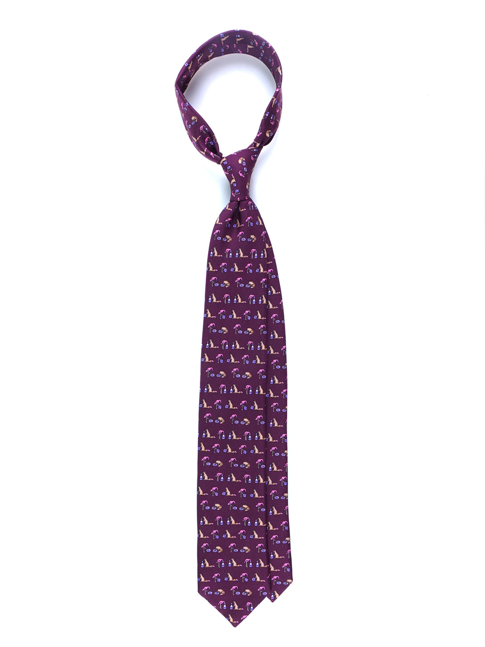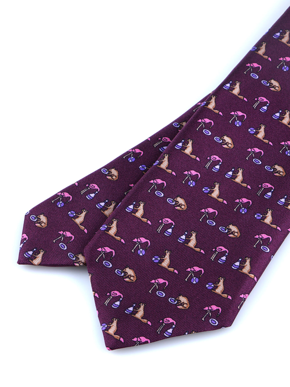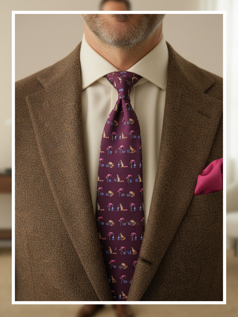 Un tocco di ironia e di colore per definire il guardaroba della stagione fredda. Questa cravatta "conversazionale" della collezione Autunno/Inverno ZAZÀ è un accessorio per l'uomo con senso dell'umorismo, che non rinuncia mai alla qualità. Realizzata in pregiata seta stampata, si distingue per il suo design unico: su un ricco fondo color bordeaux/melanzana si alternano fenicotteri rosa in posa yoga e simpatiche volpi che si rilassano. È un pezzo che esprime una personalità sicura e un'eleganza spiritosa, firmata ZAZÀ Made in Italy.