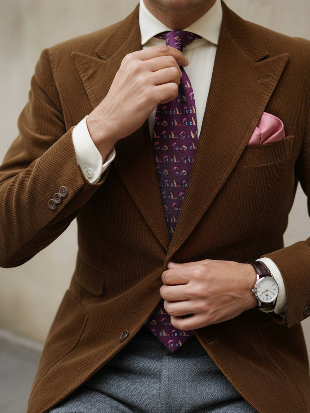Per portare un tocco di personalità in ufficio (quando il dress code lo permette). L'abbinamento più efficace è con un abito in flanella grigio antracite, che crea una base neutra perfetta per esaltare i colori della cravatta. La camicia deve essere un'impeccabile bianca in popeline. Come fazzoletto da taschino, una pochette bianca con bordino bordeaux è la scelta più sicura e di classe. Delle bretelle in seta bordeaux aggiungeranno un tocco di lusso.