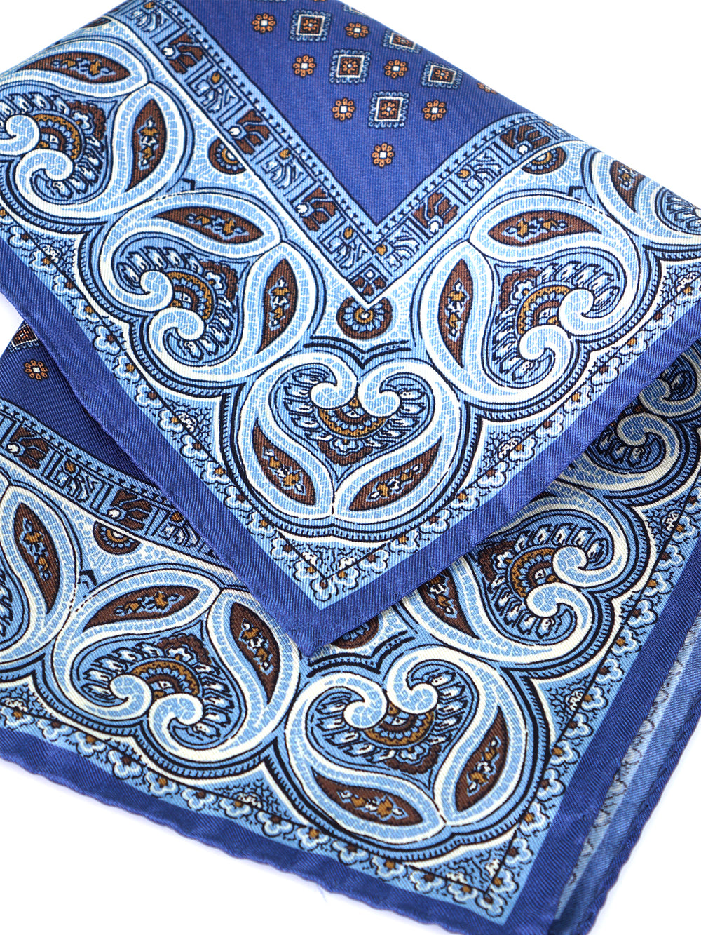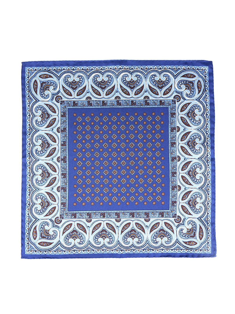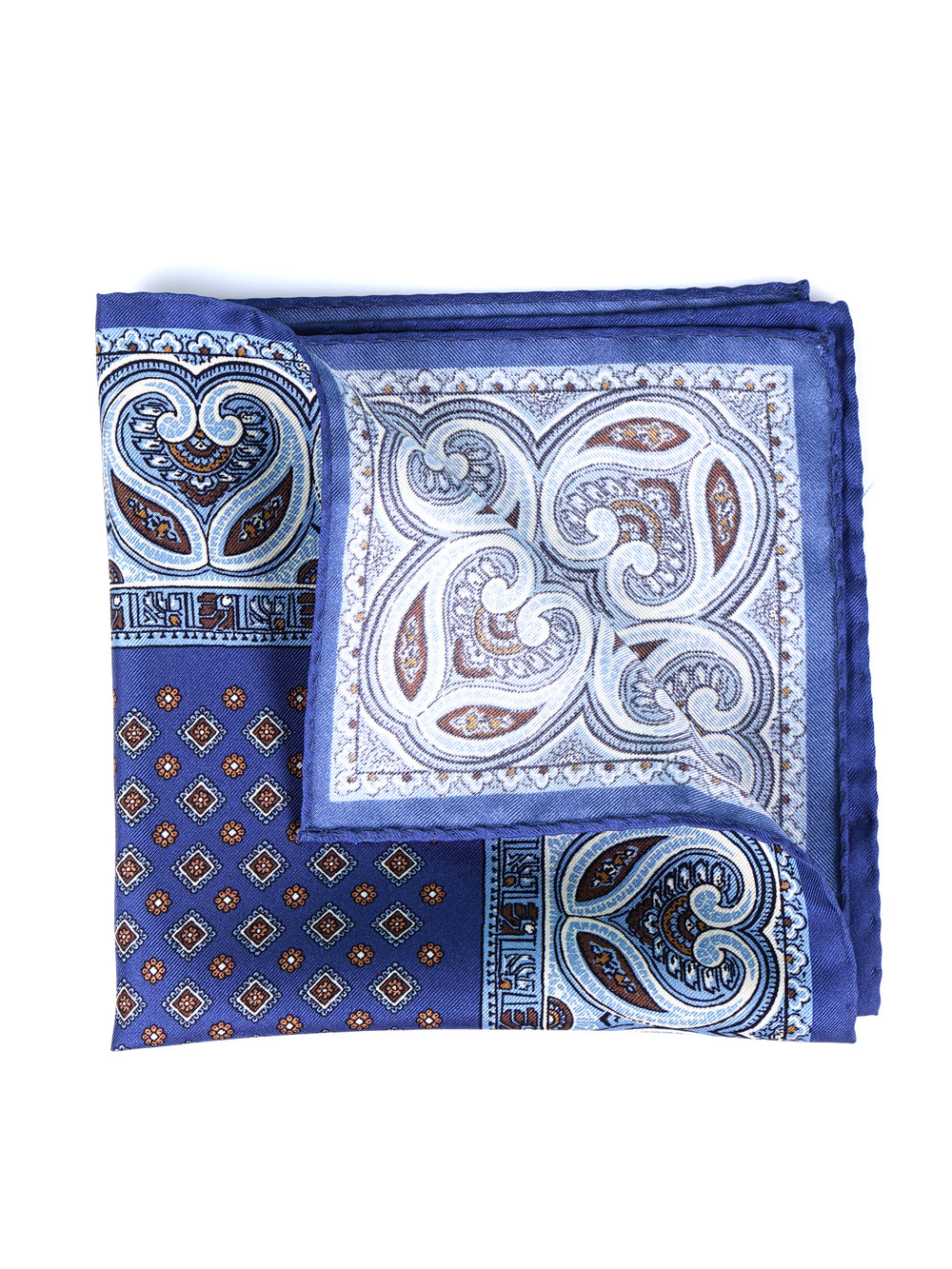 Un accessorio che è un vero e proprio "quattro fazzoletti in uno", pensato per l'uomo che ama la versatilità e l'eleganza. Questo fazzoletto da taschino è realizzato in purissima seta stampata italiana, dalla lucentezza vibrante e dalla mano morbida. Il suo design unico combina due anime: un centro con un micro-motivo geometrico su fondo blu, e un bordo sontuoso con un classico motivo cachemire (paisley) nei toni del blu, del bianco e del marrone. Questa costruzione permette, a seconda della piega, di creare look completamente diversi con un solo accessorio.