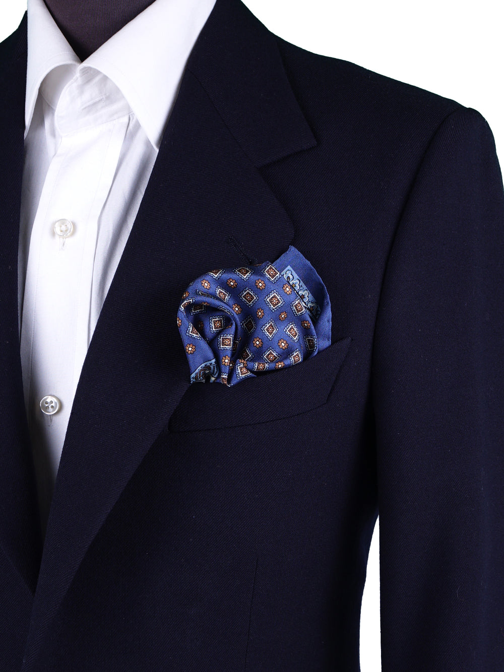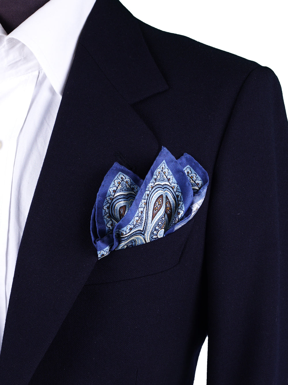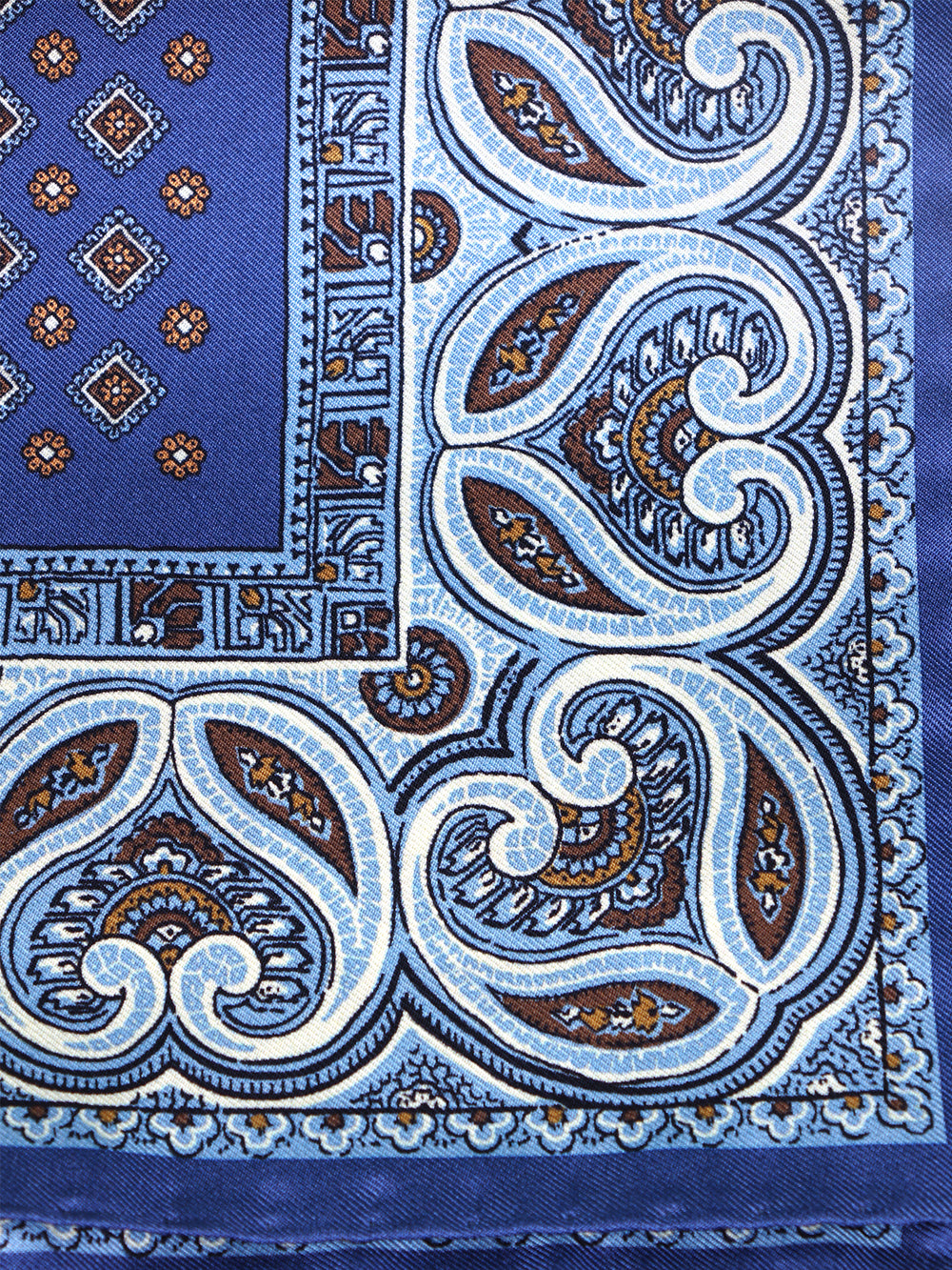 Un accessorio che è un vero e proprio "quattro fazzoletti in uno", pensato per l'uomo che ama la versatilità e l'eleganza. Questo fazzoletto da taschino è realizzato in purissima seta stampata italiana, dalla lucentezza vibrante e dalla mano morbida. Il suo design unico combina due anime: un centro con un micro-motivo geometrico su fondo blu, e un bordo sontuoso con un classico motivo cachemire (paisley) nei toni del blu, del bianco e del marrone. Questa costruzione permette, a seconda della piega, di creare look completamente diversi con un solo accessorio.