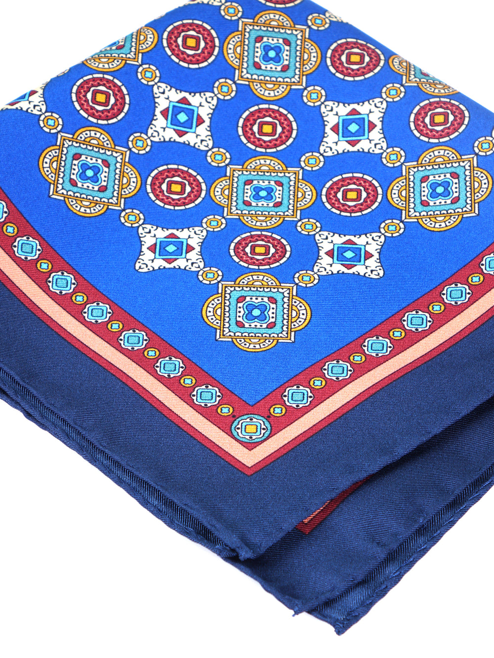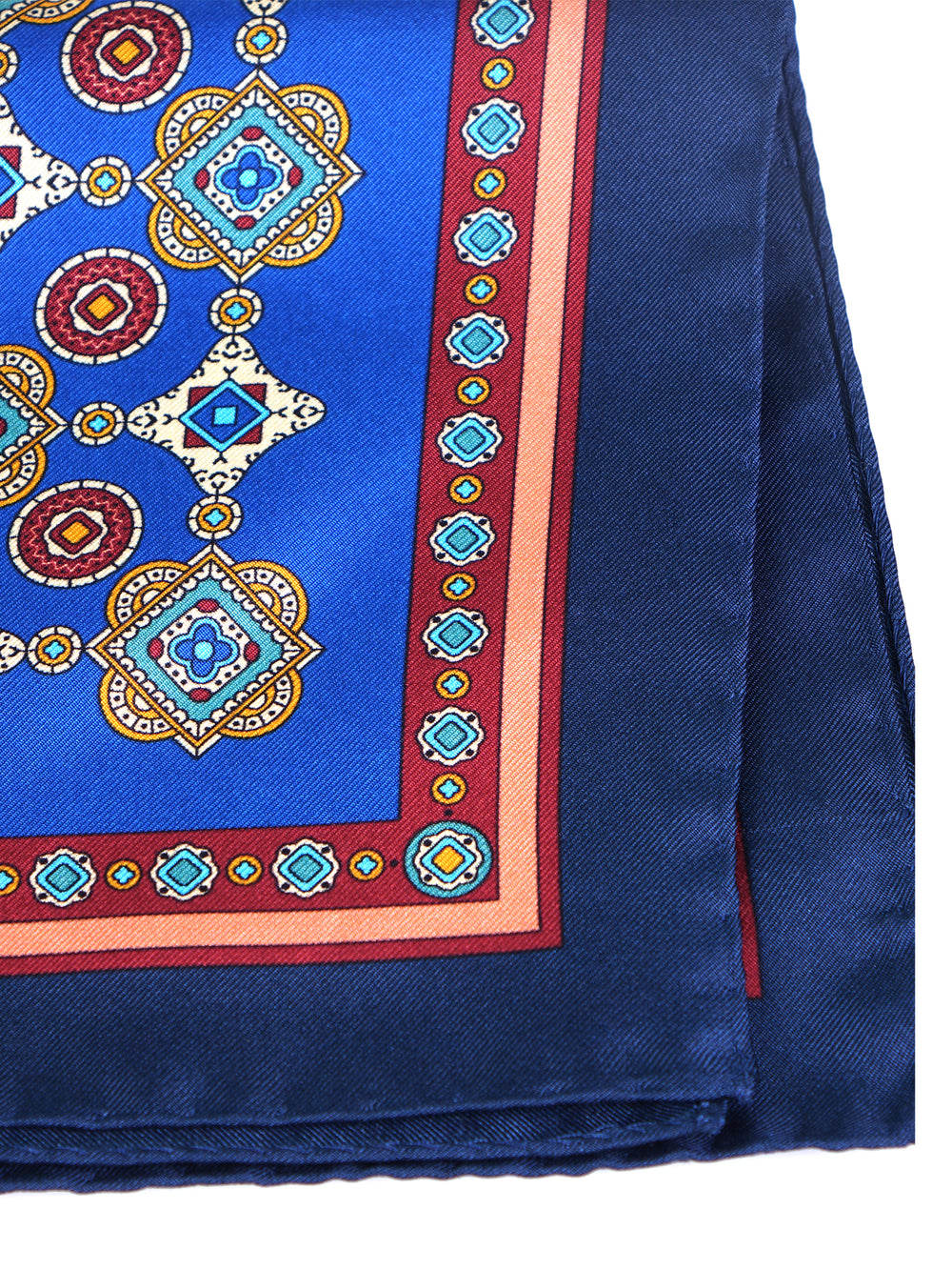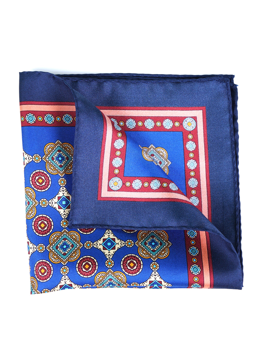 Un accessorio che è un vero e proprio "quattro fazzoletti in uno", pensato per l'uomo che ama la versatilità e l'eleganza. Questo fazzoletto da taschino è realizzato in purissima seta stampata italiana, dalla lucentezza vibrante e dalla mano morbida. Il suo design unico combina due anime: un centro con un motivo a maiolica su fondo blu royal, e un bordo più formale e discreto con un motivo geometrico su fondo blu navy. Questa costruzione permette, a seconda della piega, di creare look completamente diversi con un solo accessorio.