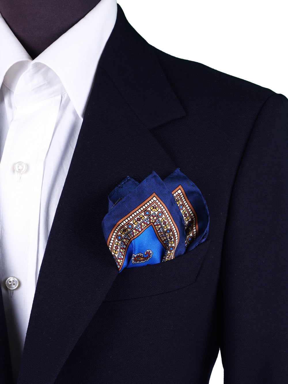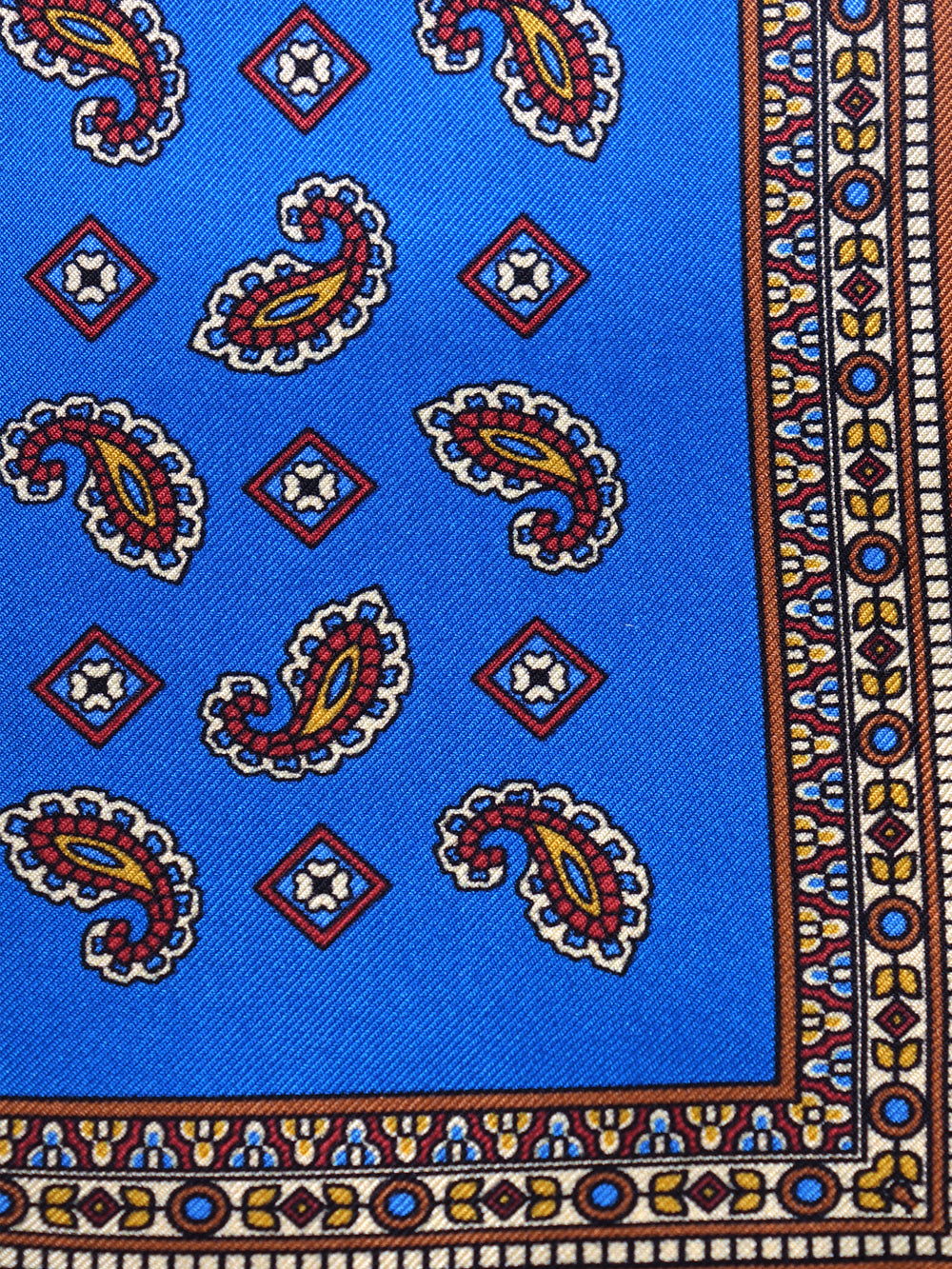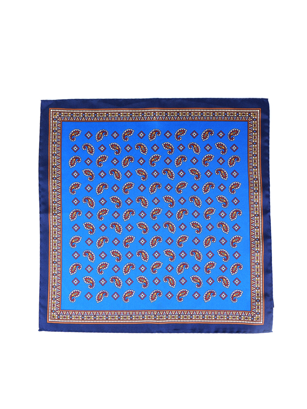 Un accessorio che è una pura dichiarazione di stile, per l'uomo che apprezza i classici intramontabili. Questo fazzoletto da taschino è realizzato in purissima seta stampata italiana, un tessuto dalla lucentezza ricca e dalla mano morbida e scivolosa. Il suo design è un capolavoro di equilibrio: un campo blu royal vibrante è impreziosito dall'iconico motivo cachemire (paisley), ricco di dettagli rossi, gialli e marroni. Il tutto è incorniciato da un ricco bordo blu navy, che rende questo pezzo unico e di grande personalità.