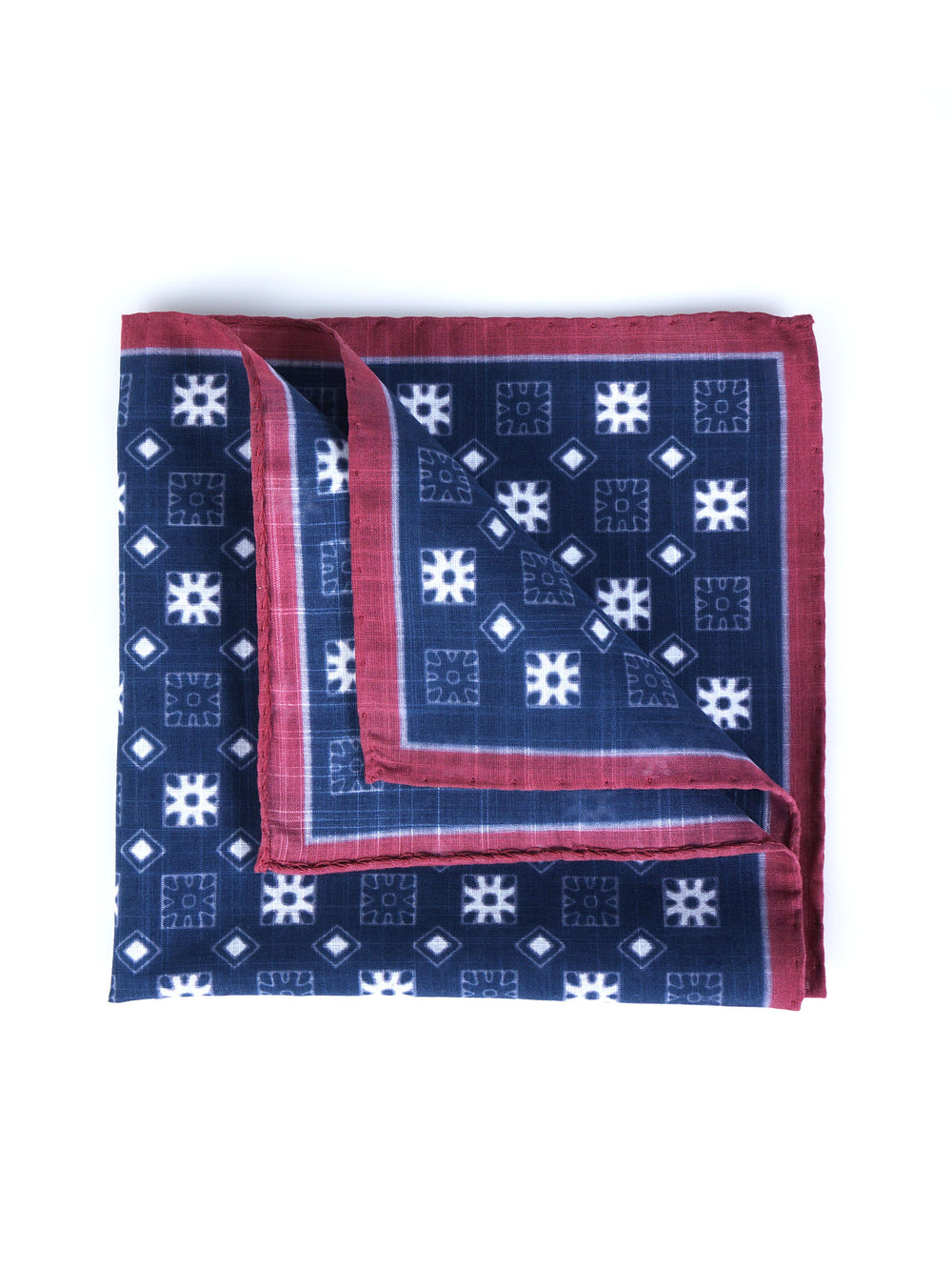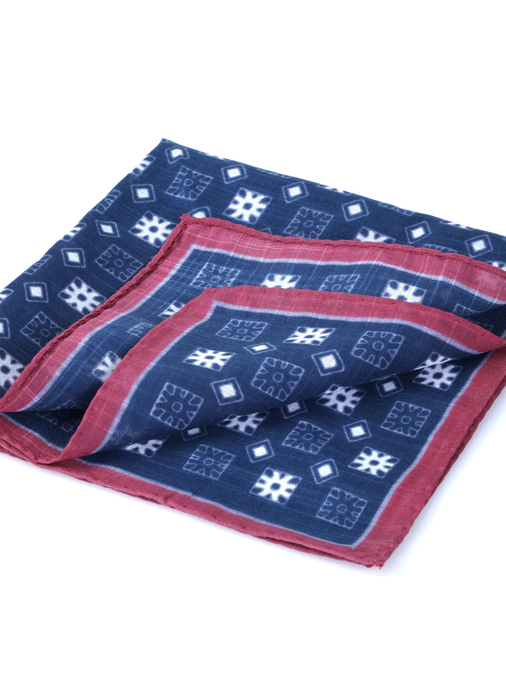 Questo fazzoletto da taschino in cotone blu con bordo bordeaux è l’accessorio ideale per l’uomo che ama distinguersi con classe e ricercatezza. Un perfetto equilibrio tra tradizione sartoriale e stile contemporaneo.