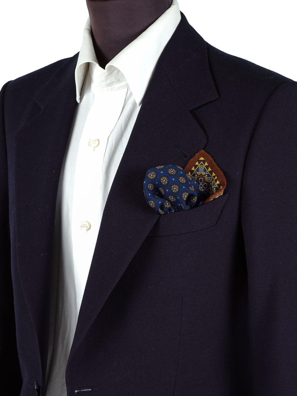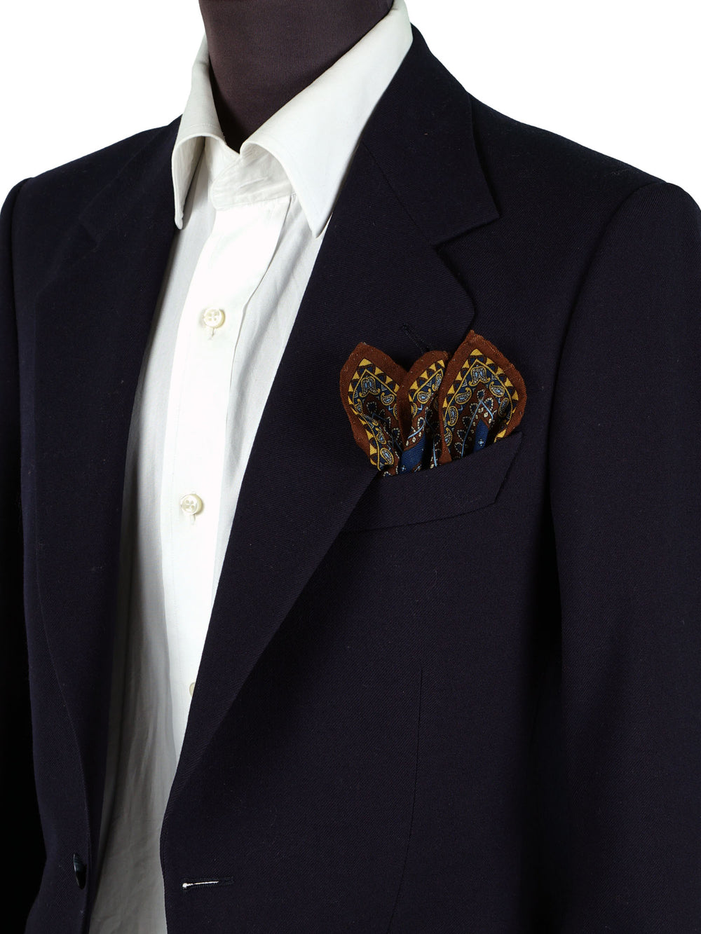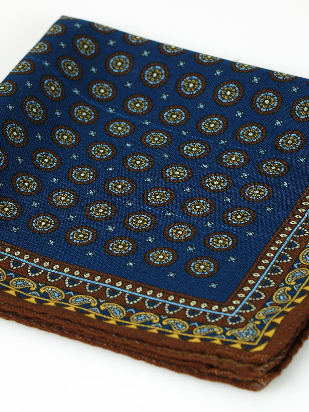 Questo fazzoletto da taschino è un caposaldo del guardaroba maschile, un pezzo di una versatilità quasi infinita. La sua forza risiede nel dialogo cromatico tra un profondo blu petrolio e un caldo marrone tabacco, un abbinamento iconico che parla di stile e sicurezza. Realizzato in una morbida miscela di lana e cashmere, la sua texture opaca è ideale per creare contrasti con i tessuti della stagione fredda. L'orlo arrotolato a mano è la firma inconfondibile di un lusso artigianale e discreto.