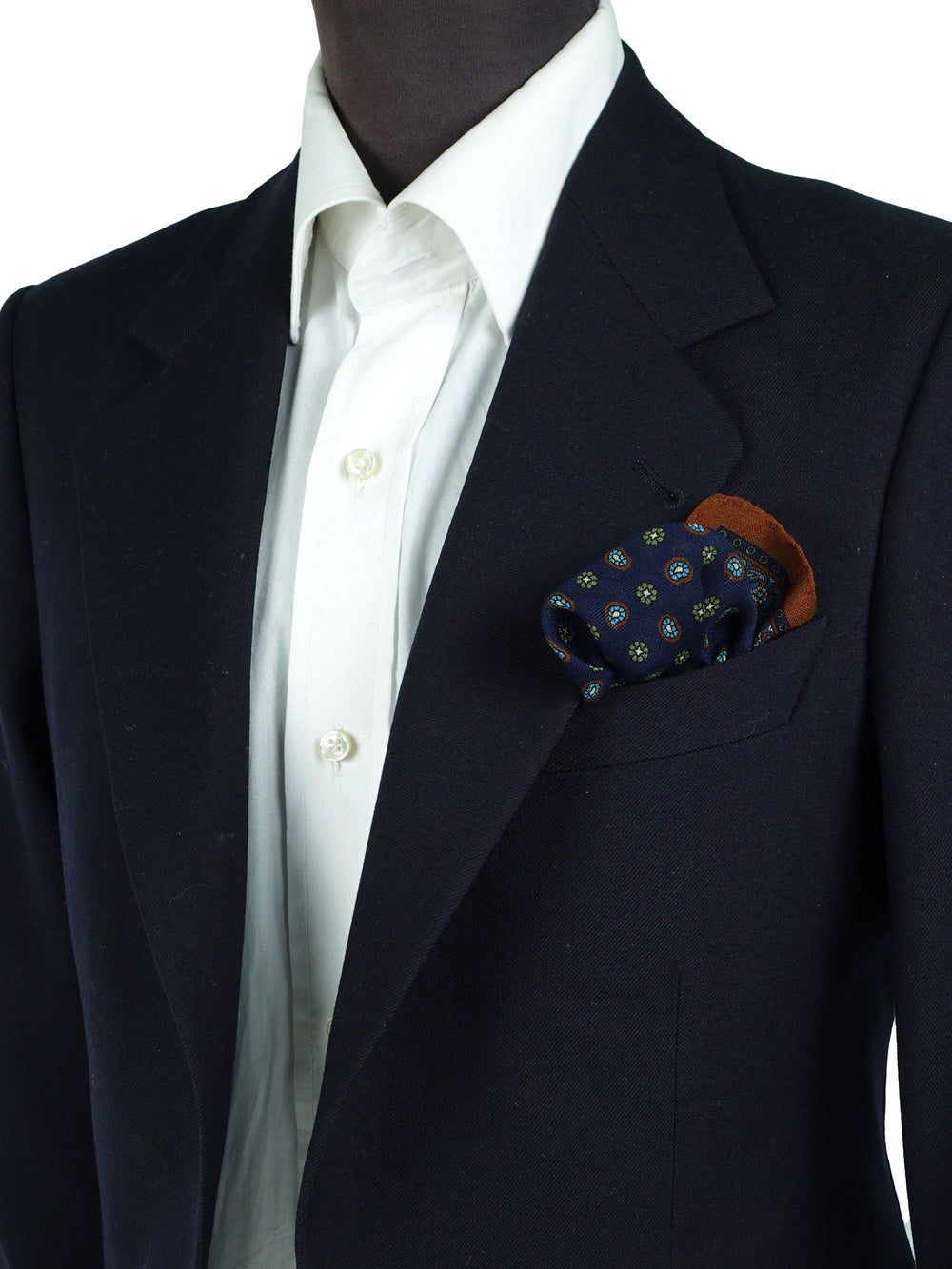 Un accessorio da vero intenditore, pensato per l'uomo che apprezza la consistenza e il calore dei tessuti nobili. Questo fazzoletto da taschino è realizzato in un pregiato blend di lana e cashmere, che gli conferisce una mano morbida, calda e un aspetto meravigliosamente opaco. Il suo design "quattro facce" è un capolavoro di versatilità: unisce un centro con un motivo geometrico su fondo arancio a un sontuoso bordo in stile cachemire (paisley) su fondo blu navy. La palette cromatica, arricchita da tocchi di turchese e verde, è audace ma di grande equilibrio. A seconda della piega, permette di creare look completamente diversi con un solo accessorio.