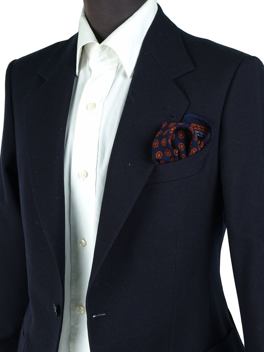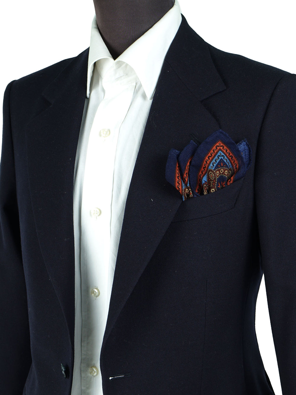Un accessorio da vero intenditore, pensato per l'uomo che apprezza la consistenza e il calore dei tessuti nobili. Questo fazzoletto da taschino è realizzato in un pregiato blend di lana e cashmere, che gli conferisce una mano morbida, calda e un aspetto meravigliosamente opaco. Il design è un capolavoro di equilibrio cromatico: un classico fondo blu navy, con un micro-motivo che alterna un cachemire stilizzato a piccoli fiori arancio, è incorniciato da una ricca bordatura a contrasto. È un pezzo che non passa inosservato ma che mantiene un'eleganza classica, perfetto per ravvivare i toni scuri del guardaroba invernale.