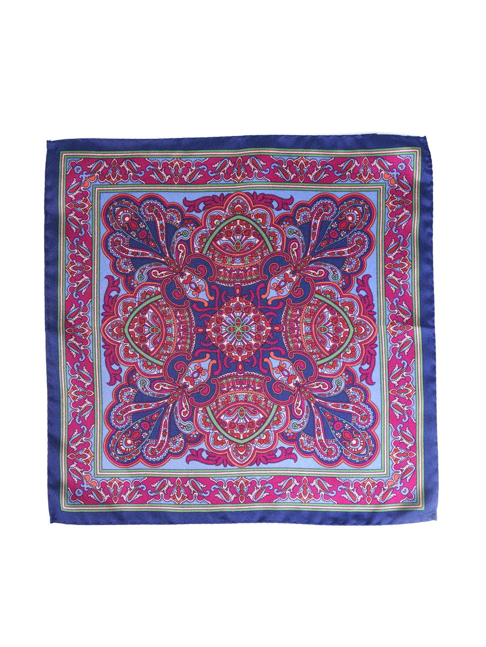 Un accessorio che è un'esplosione di colore e di arte, pensato per l'uomo che non teme di osare con stile e raffinatezza. Questo fazzoletto da taschino è realizzato in purissima seta stampata italiana, dalla lucentezza vibrante e dalla mano morbida e scivolosa. Il suo design è un'interpretazione sontuosa dell'iconico motivo Cachemire (Paisley), in una palette cromatica audace che unisce toni gioiello come il blu royal, il fucsia, l'arancio e il verde. È il pezzo perfetto per l'uomo che usa gli accessori per definire il proprio stile e comunicare la propria personalità.