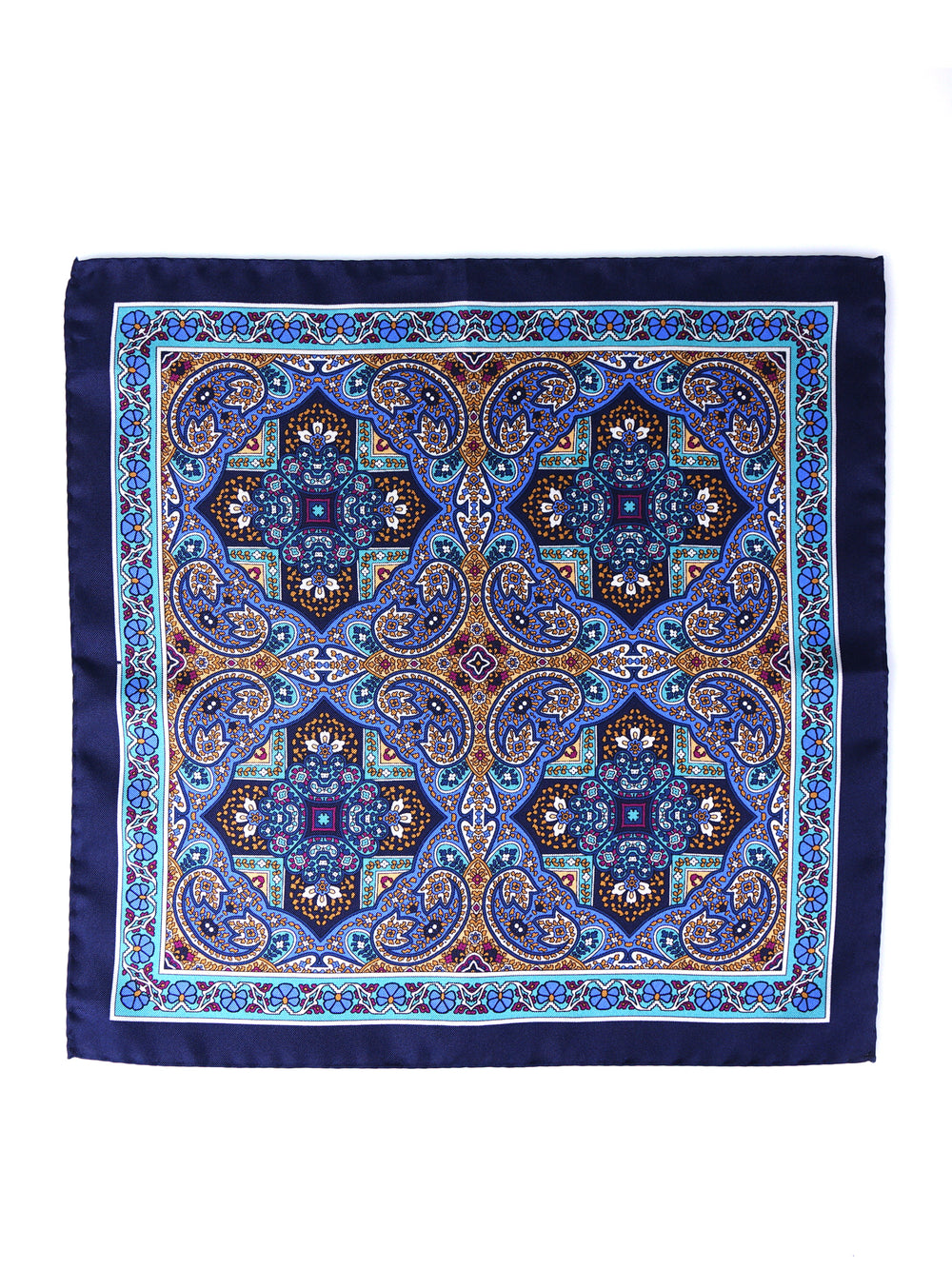 Un accessorio che è un vero e proprio "quattro fazzoletti in uno", pensato per l'uomo che ama la versatilità e l'eleganza. Questo fazzoletto da taschino è realizzato in purissima seta stampata italiana, dalla lucentezza vibrante e dalla mano morbida. Il suo design unico combina due anime: un centro con un motivo floreale su fondo turchese, e un bordo più ricco con un classico motivo cachemire (paisley) su fondo blu navy. Questa costruzione permette, a seconda della piega, di creare look completamente diversi con un solo accessorio.