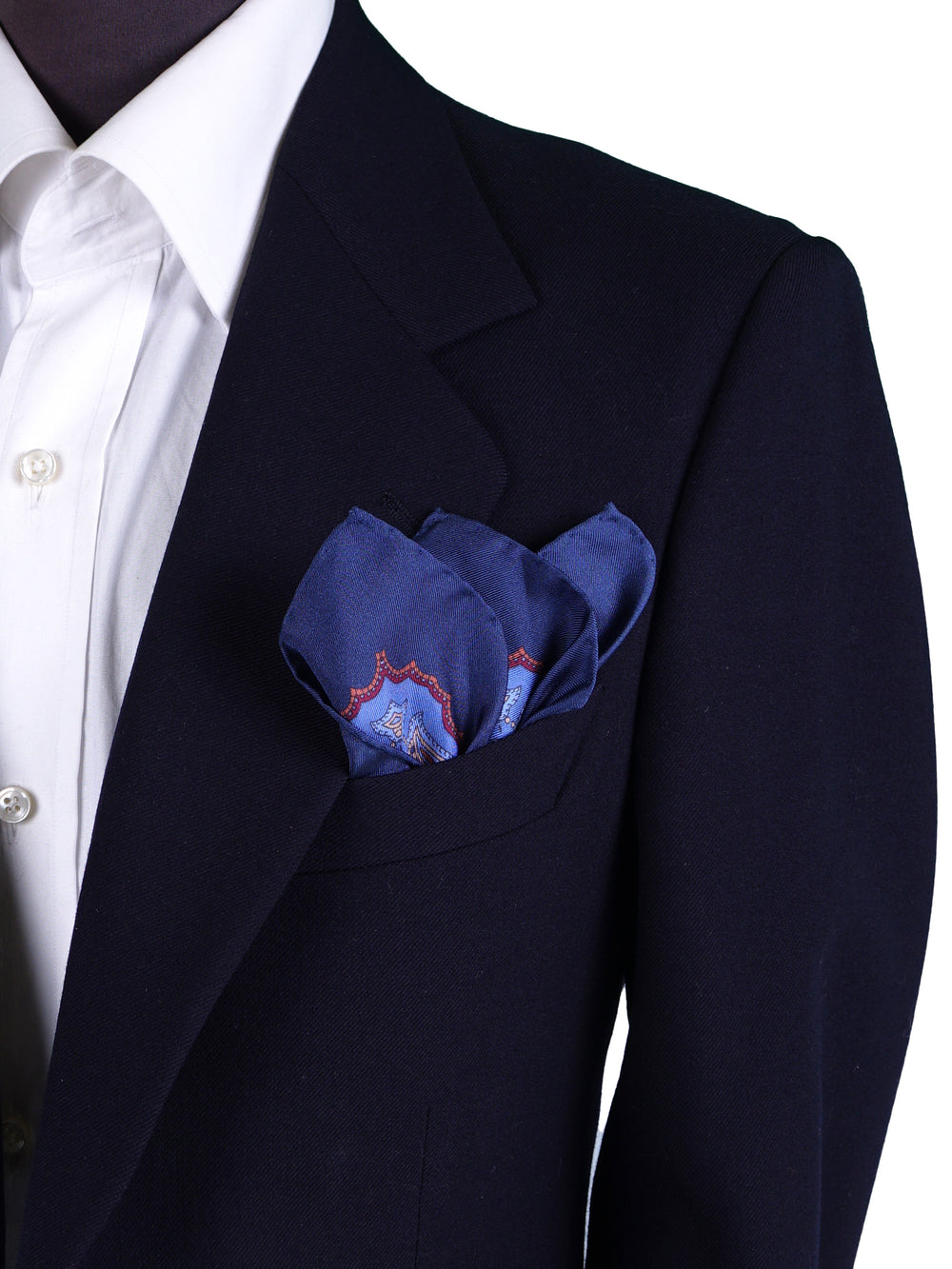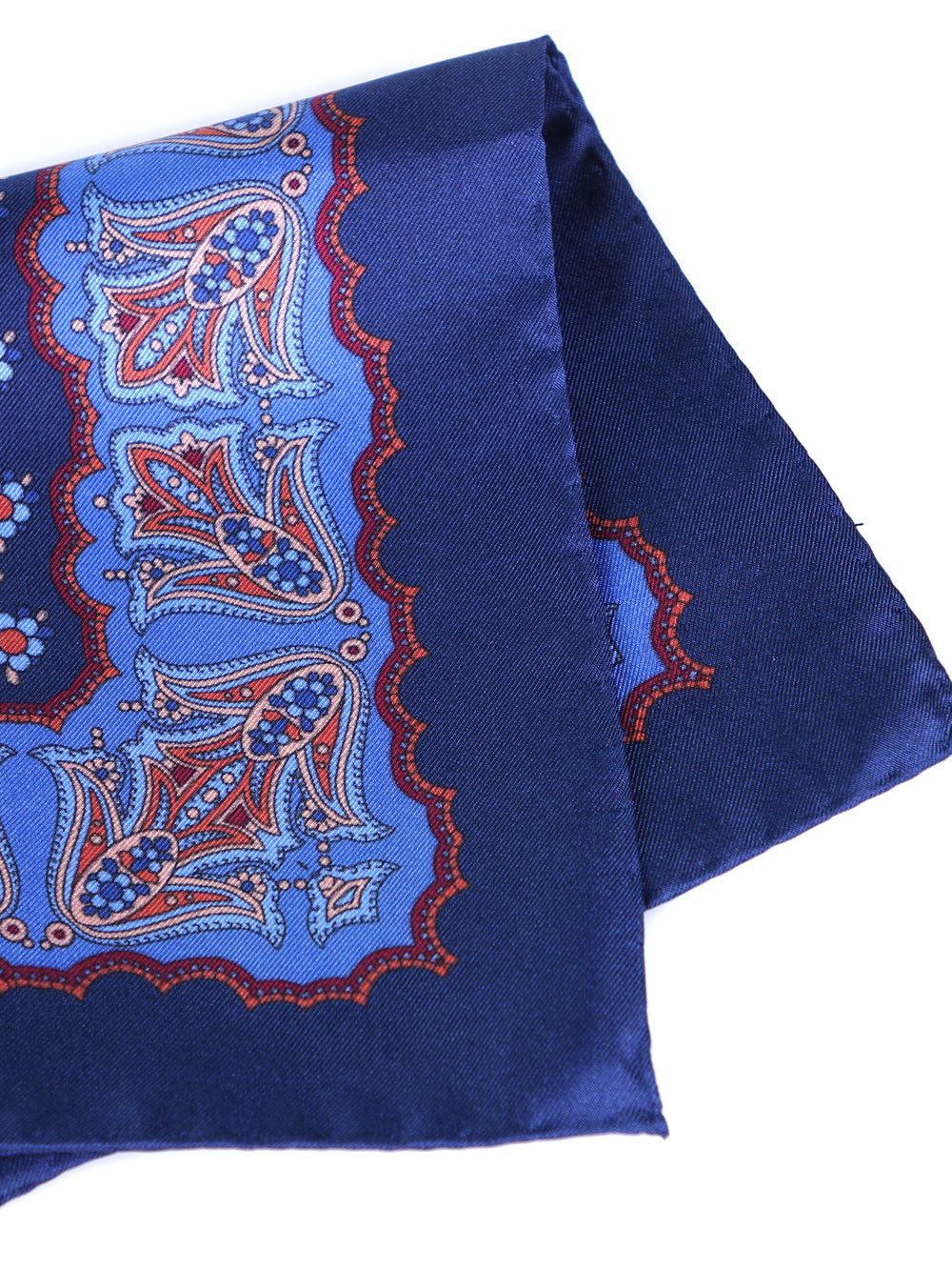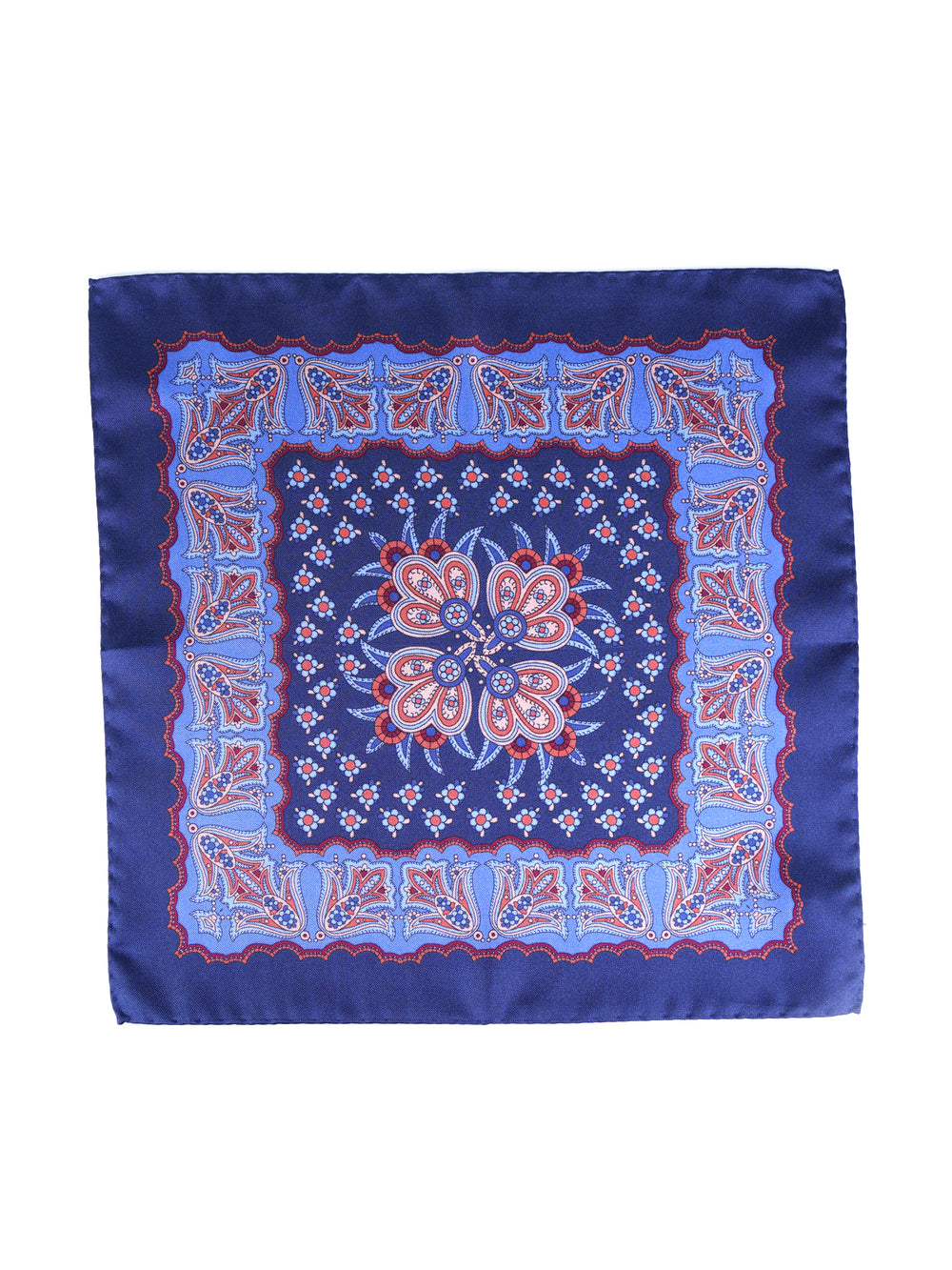 Un accessorio che è un'opera d'arte in miniatura, un pezzo di design che cattura lo sguardo con la sua complessità e la sua audacia cromatica. Questo fazzoletto da taschino è realizzato in purissima seta stampata italiana, dalla lucentezza ricca e dalla mano morbida e scivolosa. Il suo design è un capolavoro di equilibrio: un sontuoso motivo cachemire (paisley) e floreale si sviluppa su un fondo blu vibrante. La palette di colori, che unisce un caldo rosso corallo a diverse tonalità di blu e rosa, lo rende un pezzo unico e di grande personalità.