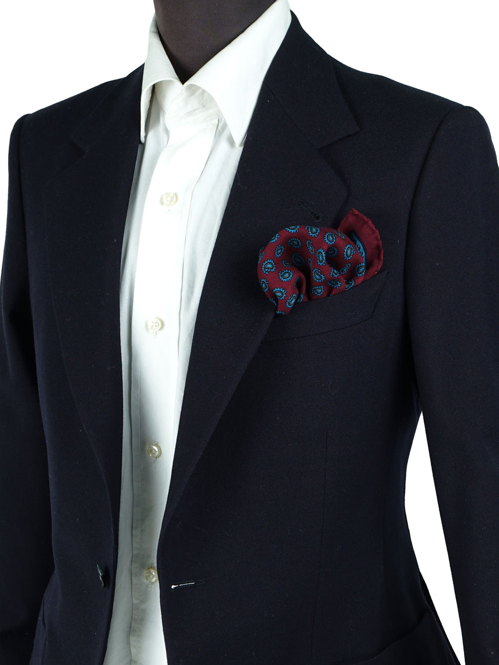 Un accessorio da vero intenditore, pensato per l'uomo che apprezza la consistenza e il calore dei tessuti nobili. Questo fazzoletto da taschino è realizzato in un pregiato blend di lana e cashmere, che gli conferisce una mano morbida, calda e un aspetto meravigliosamente opaco. Il design è un capolavoro di equilibrio cromatico: un vibrante fondo rosso, con un micro-motivo che alterna un cachemire stilizzato a piccoli fiori, è incorniciato da una ricca bordatura blu navy. È un pezzo che non passa inosservato ma che mantiene un'eleganza classica, perfetto per ravvivare i toni scuri del guardaroba invernale.