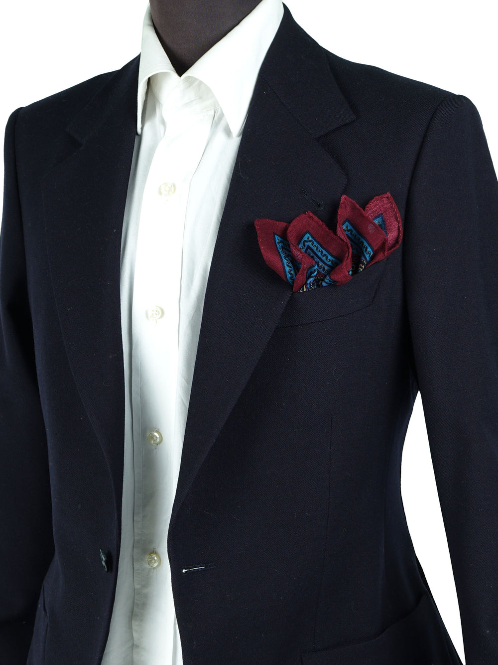 • Come Piegarlo: Una piega disinvolta e quasi casuale, che faccia emergere sia il rosso che il blu, si sposerà magnificamente con la matericità della giacca.