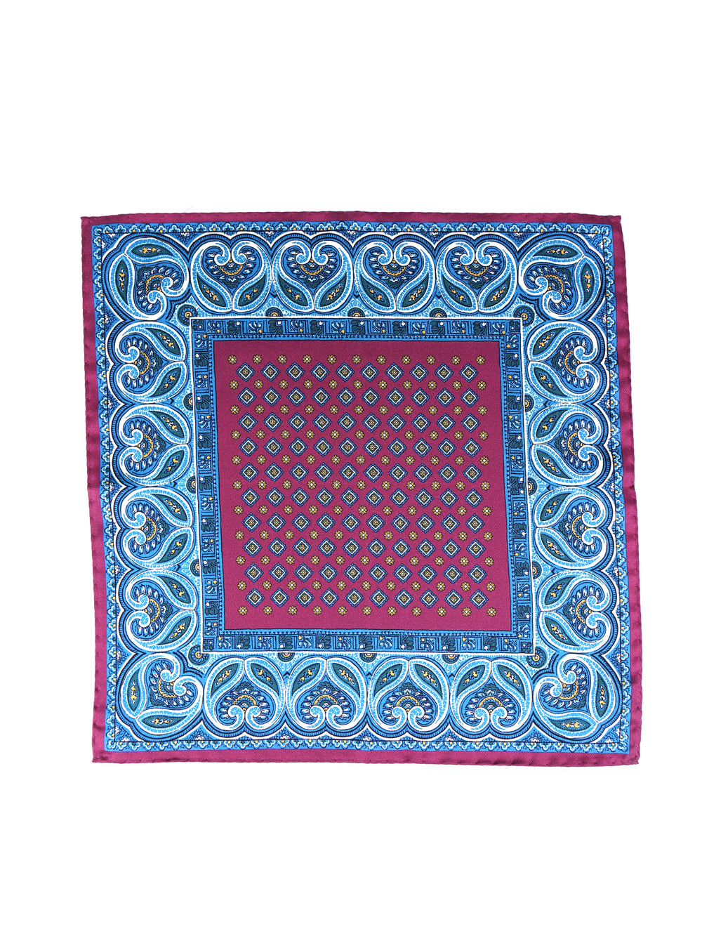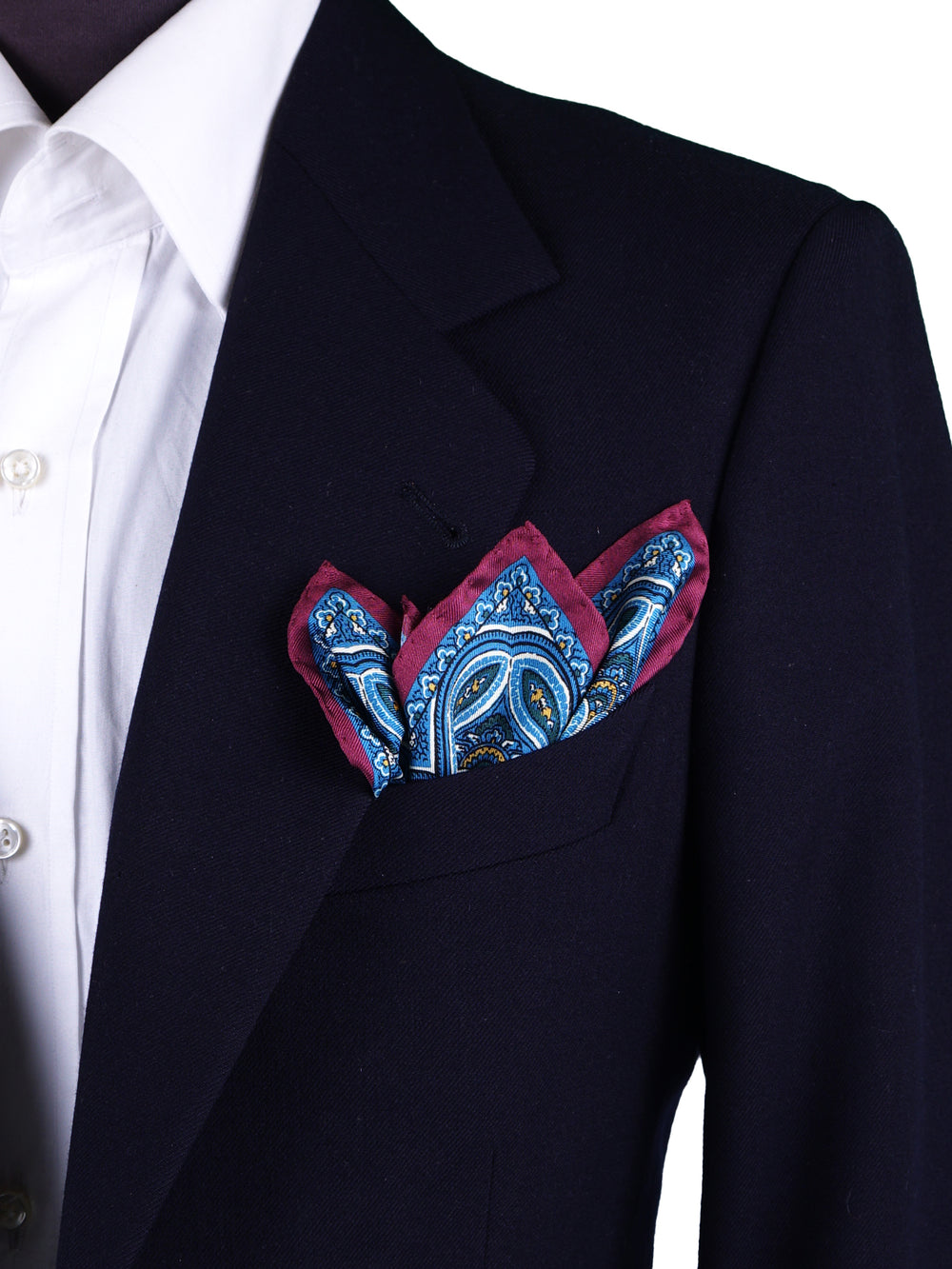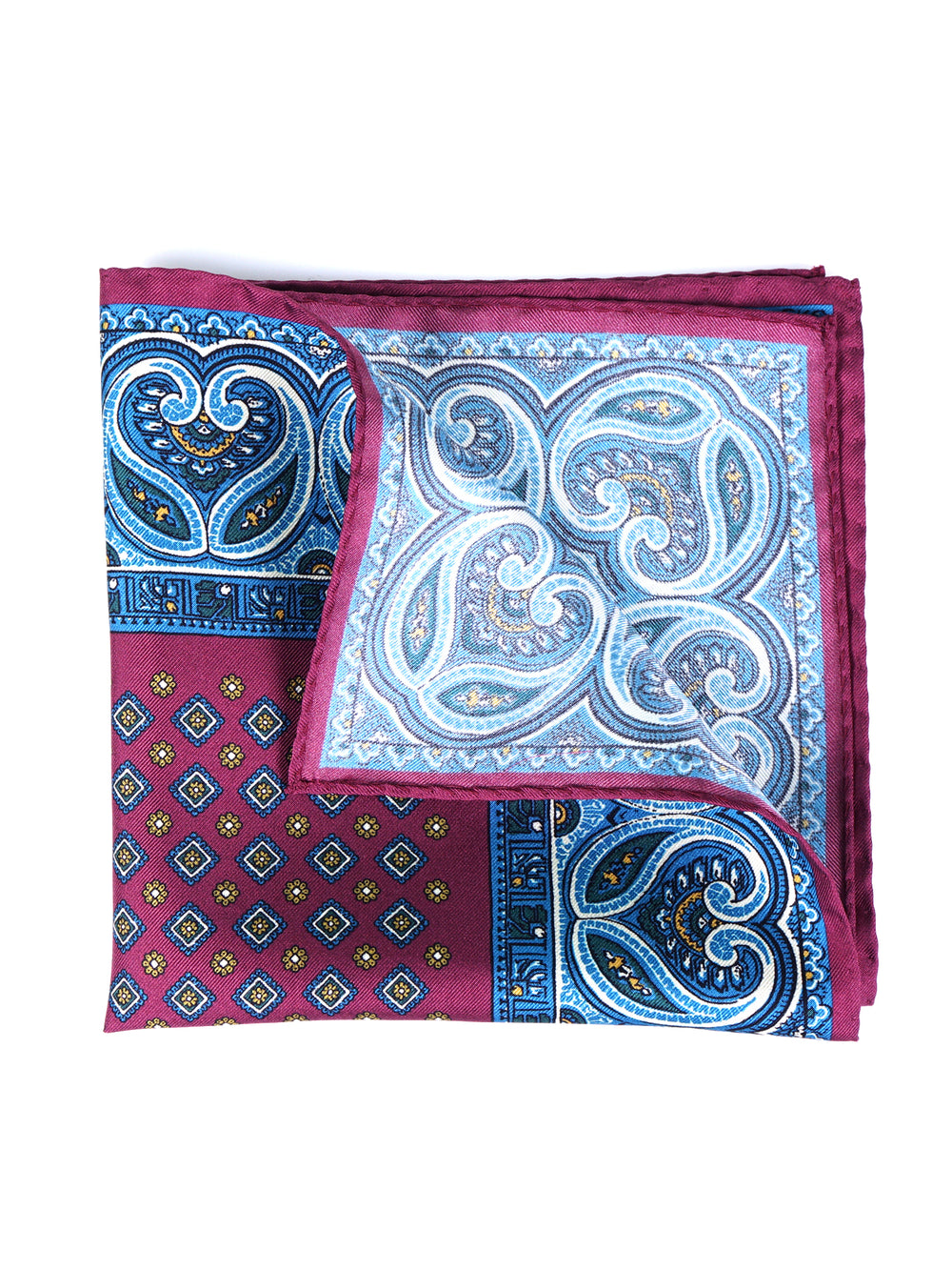 Un accessorio che è un vero e proprio "quattro fazzoletti in uno", pensato per l'uomo che ama la versatilità e l'eleganza. Questo fazzoletto da taschino è realizzato in purissima seta stampata italiana, dalla lucentezza vibrante e dalla mano morbida. Il suo design unico combina due anime: un centro con un micro-motivo geometrico su fondo bordeaux, e un bordo sontuoso con un classico motivo cachemire (paisley) nei toni del blu e del turchese. Questa costruzione permette, a seconda della piega, di creare look completamente diversi con un solo accessorio.