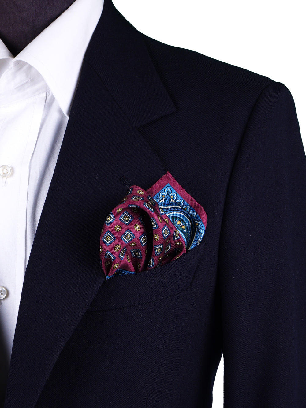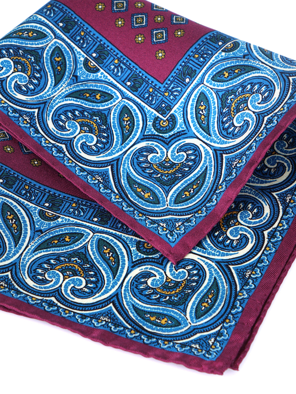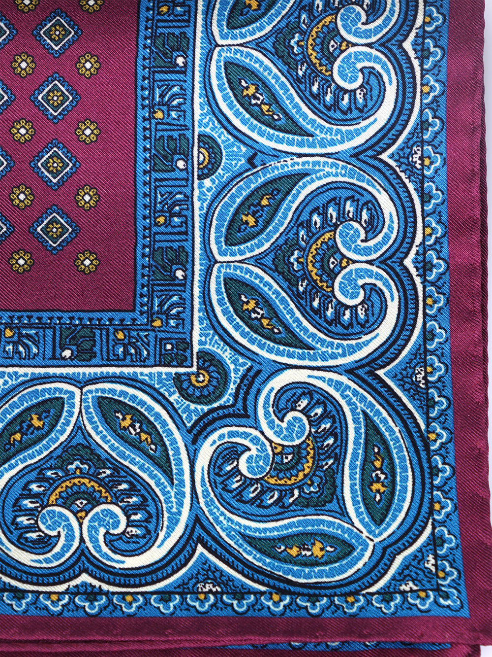 Un accessorio che è un vero e proprio "quattro fazzoletti in uno", pensato per l'uomo che ama la versatilità e l'eleganza. Questo fazzoletto da taschino è realizzato in purissima seta stampata italiana, dalla lucentezza vibrante e dalla mano morbida. Il suo design unico combina due anime: un centro con un micro-motivo geometrico su fondo bordeaux, e un bordo sontuoso con un classico motivo cachemire (paisley) nei toni del blu e del turchese. Questa costruzione permette, a seconda della piega, di creare look completamente diversi con un solo accessorio.