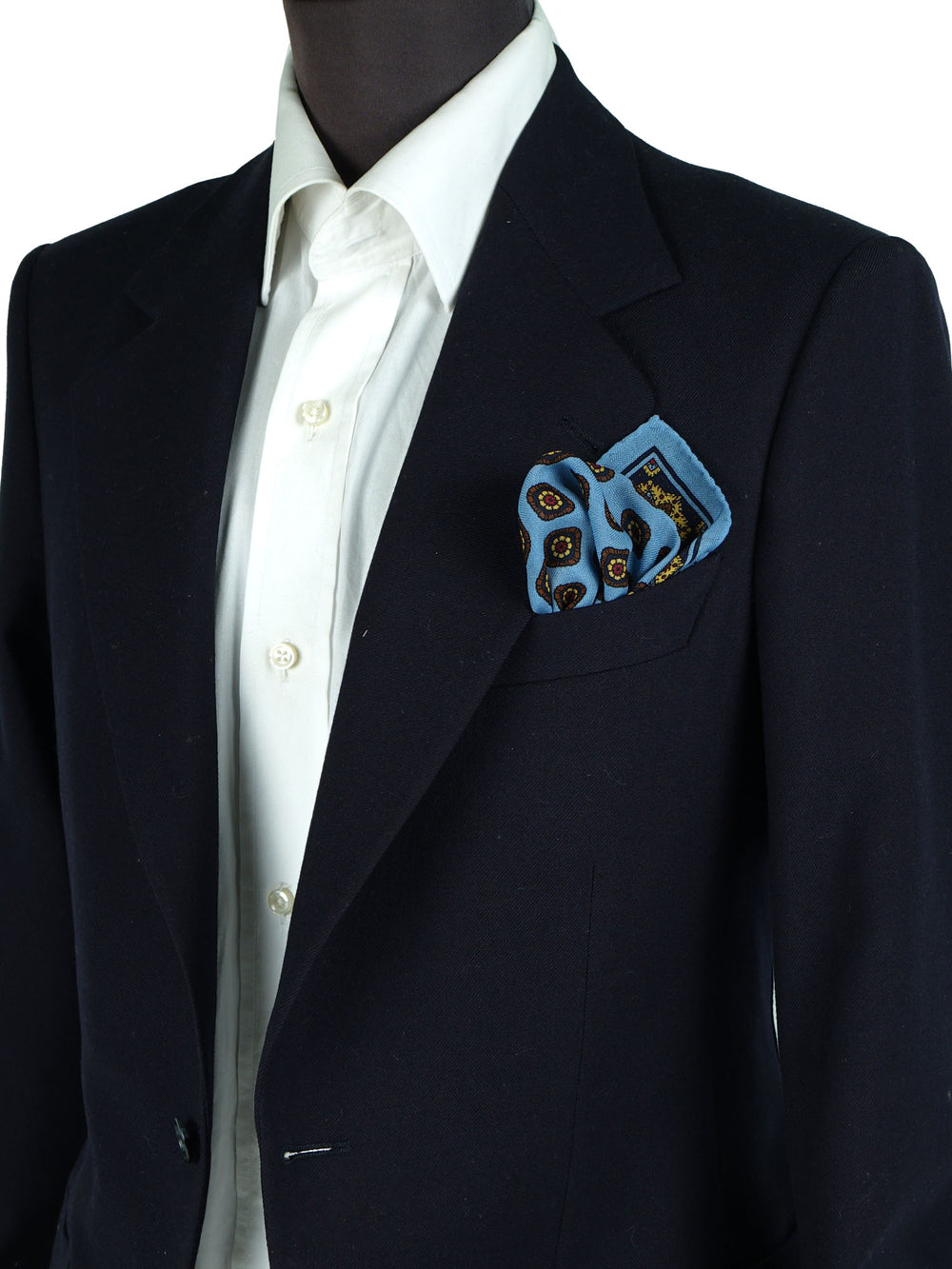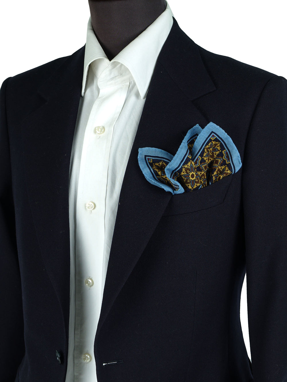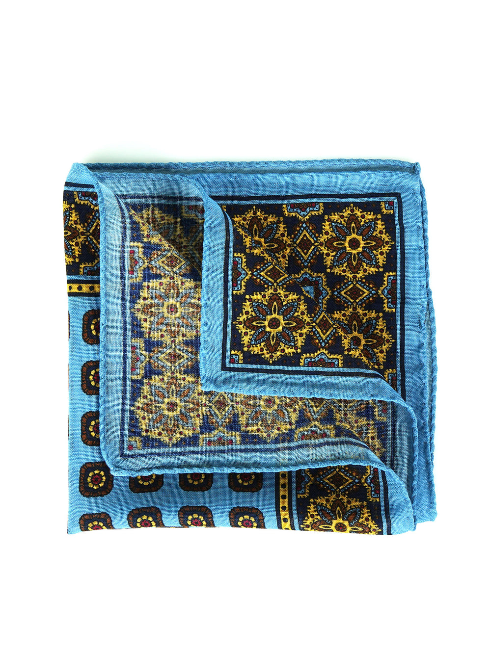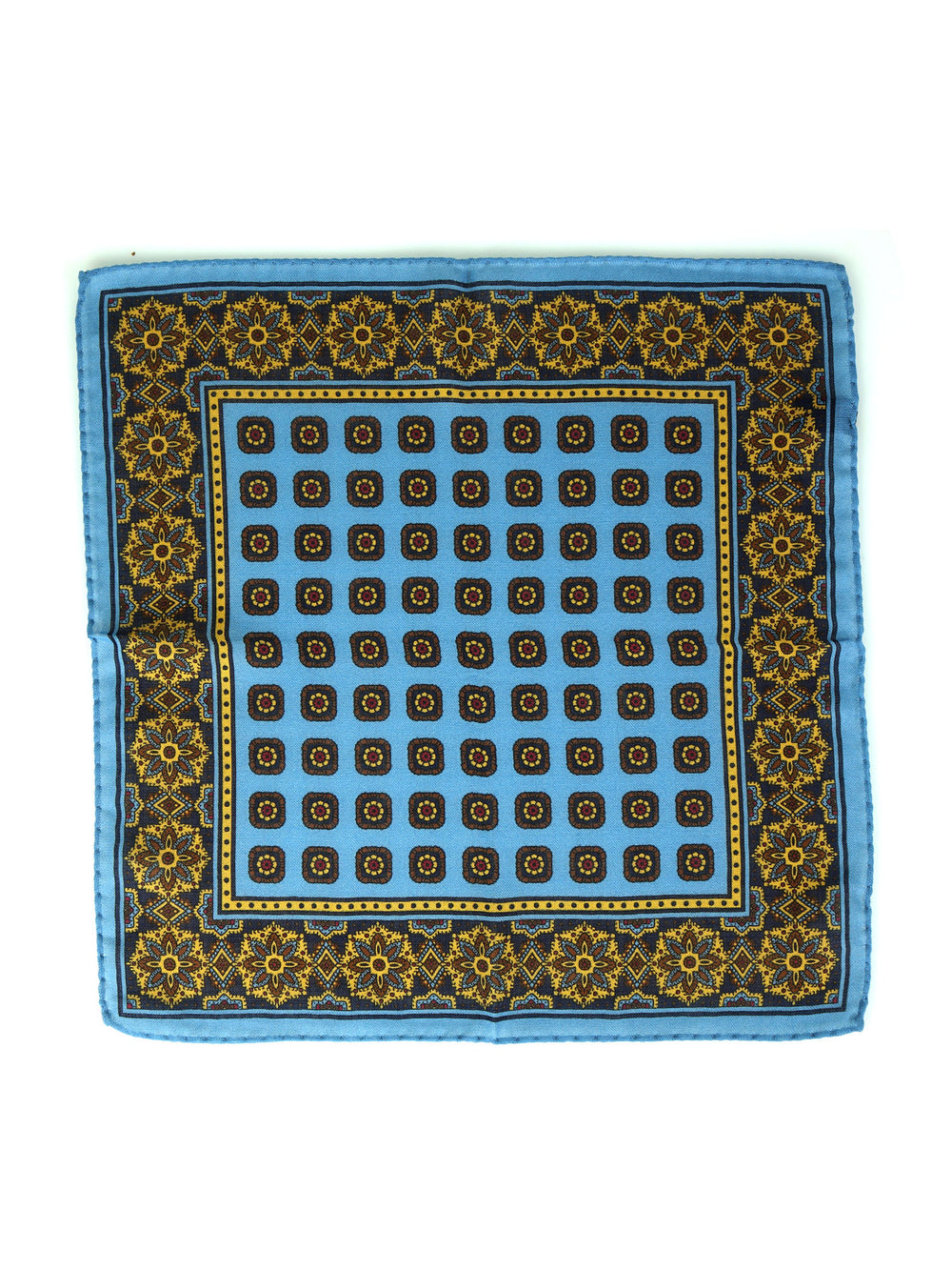 Un accessorio da vero intenditore, pensato per l'uomo che apprezza la consistenza e il calore dei tessuti nobili. Questo fazzoletto da taschino Don Mimì è realizzato in un pregiato blend di lana e cashmere, che gli conferisce una mano morbida, calda e un aspetto meravigliosamente opaco. Il design è un capolavoro di equilibrio: un sorprendente fondo azzurro con un micro-motivo geometrico è incorniciato da una ricca bordatura a contrasto, dove i caldi toni dell'ocra e del marrone lo ancorano perfettamente alla stagione fredda. A seconda di come viene piegato, permette di creare effetti cromatici sempre diversi.