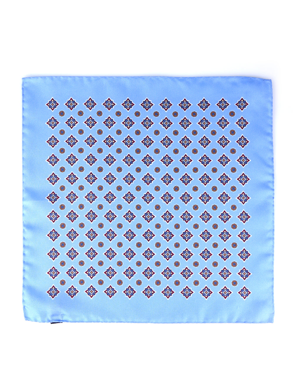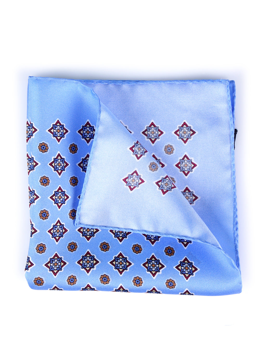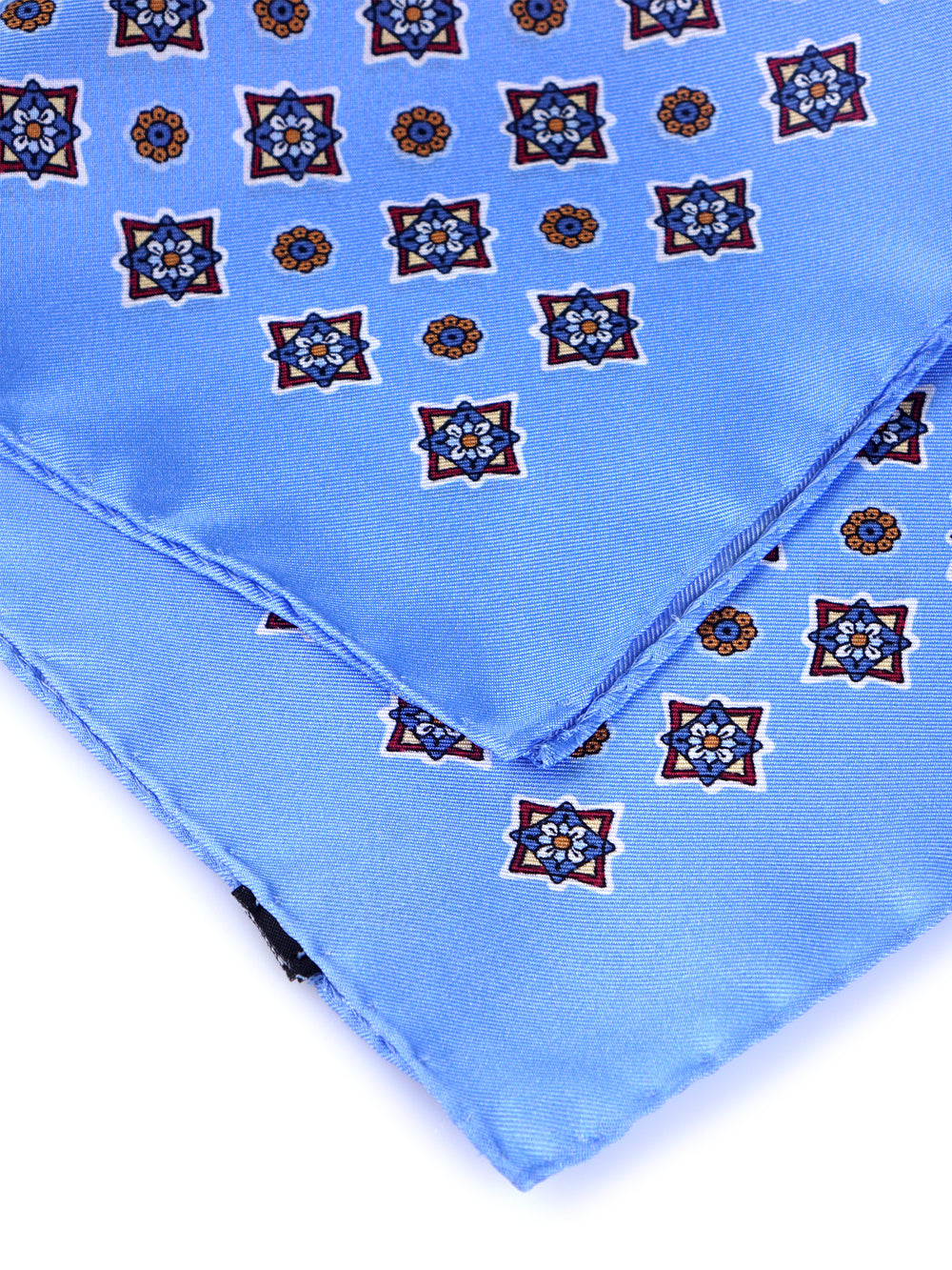 Un accessorio che è un'esplosione di colore e di stile, il pezzo forte per l'uomo che ama i dettagli che fanno la differenza. Questo fazzoletto da taschino è realizzato in purissima seta stampata italiana, un tessuto dalla lucentezza ricca e dalla mano morbida e scivolosa. Il suo design, ispirato alle antiche maioliche, presenta un motivo geometrico e floreale su un vibrante fondo azzurro. La ricca palette di colori, che unisce il rosso, l'ocra e il panna, lo rende un pezzo unico e di grande personalità, perfetto per ravvivare i toni classici del guardaroba maschile.