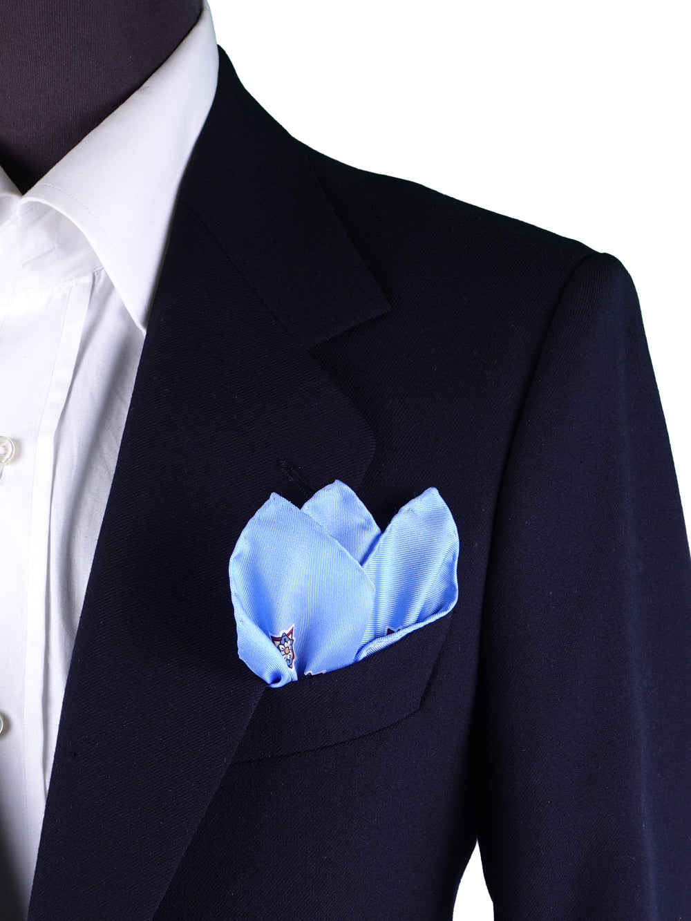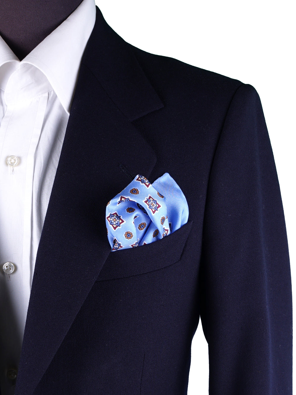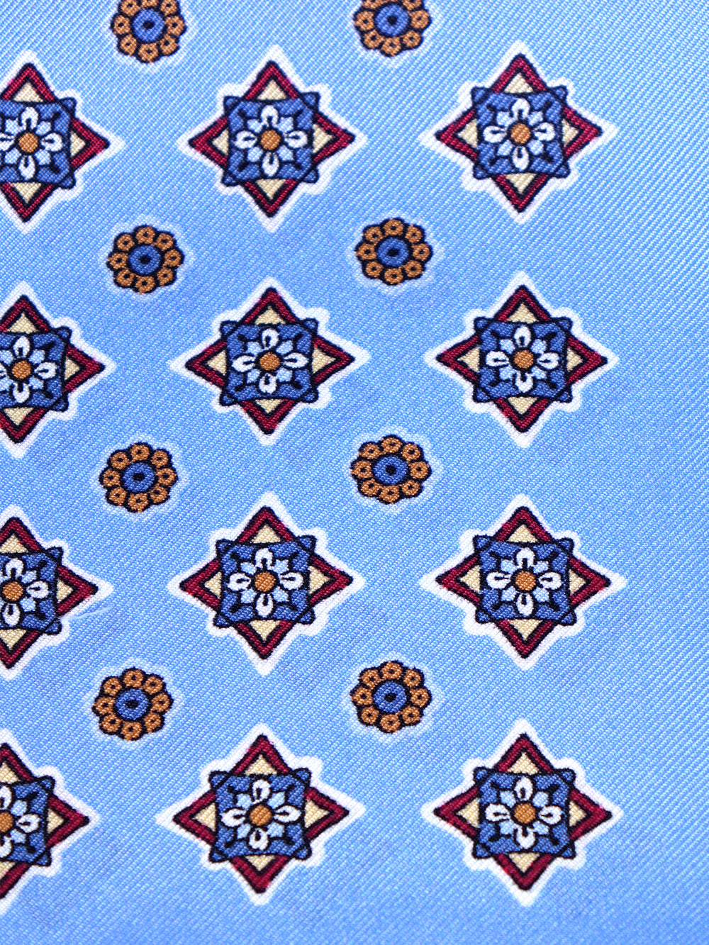 Un accessorio che è un'esplosione di colore e di stile, il pezzo forte per l'uomo che ama i dettagli che fanno la differenza. Questo fazzoletto da taschino è realizzato in purissima seta stampata italiana, un tessuto dalla lucentezza ricca e dalla mano morbida e scivolosa. Il suo design, ispirato alle antiche maioliche, presenta un motivo geometrico e floreale su un vibrante fondo azzurro. La ricca palette di colori, che unisce il rosso, l'ocra e il panna, lo rende un pezzo unico e di grande personalità, perfetto per ravvivare i toni classici del guardaroba maschile.